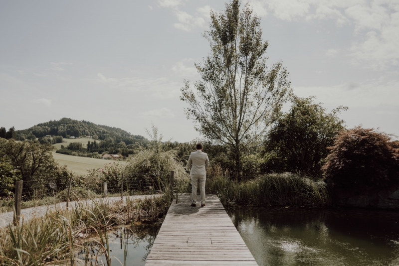 Ein Morgen voller Emotionen, auf den ein ebenso emotionales Highlight folgte: Der First Look des Brautpaares. Auf dem kleinen Steg des Naturteichs der Location sahen sich Melanie & Kevin zum ersten Mal an diesem Tag und konnten ihr Glück kaum fassen. „Rückblickend einer der schönsten und emotionalsten Momente des Tages“, den sie, gemeinsam mit dem Brautpaar Shooting und den Gruppenfotos, am Vormittag in vollen Zügen genossen.