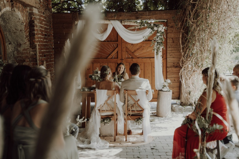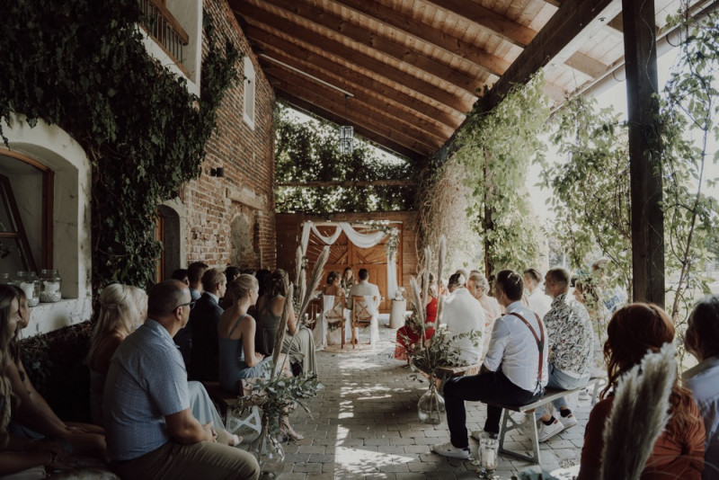 Im überdachten Außenbereich des Hofs fand die standesamtliche Trauung statt, die schöner nicht hätte dekoriert werden können. Bereits am Freitag begann das aufregende Wochenende dieser Sommerhochzeit mit den Vorbereitungen für das große Hochzeitsfest und die Trauzeremonie. Unterstützt von Trendfloristik Silian, der auch die herrlich leichte Floristik aus weißen Rosen, Eukalyptus, Schleierkraut und Pampasgras kreierte, dekorierte Melanie mit ihren Brautjungfern die Räumlichkeiten des Bauernhofs mit unendlich viel Liebe fürs Detail im Boho Greenery Stil. Aufgrund der nicht ganz so positiven Wetterprognose entschied sich das Brautpaar für ein überdachtes Plätzchen bei der Trauung, das einfach magisch war.