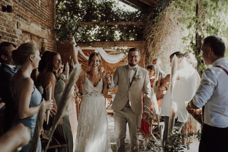 Weiße fließende Stoffe, warmes Holz und goldene Akzente säumten die Zeremonie unter dem hölzernen Vordach, vor dessen alten, hoch- und grünbewachsen Ziegelwänden, die perfekt angeordneten Bankreihen, der blumendekorierte Trautisch und der bildschöne Traubogen aus Birkenholz warteten. Vollbesetzt, führte Melanies Vater die Braut nach Vorn, wo Kevin bereits wartete. Eine Trauung voller Freude und Glück, „die schöner hätte nicht sein können. Urige Ziegelwände, heimeliges Ambiente, super Musiker, emotionale Momente und traumhafte Deko im Boho-Style – für mich war alles genau so, wie in meinen Träumen.“