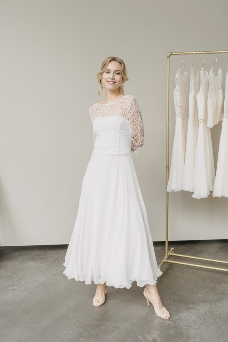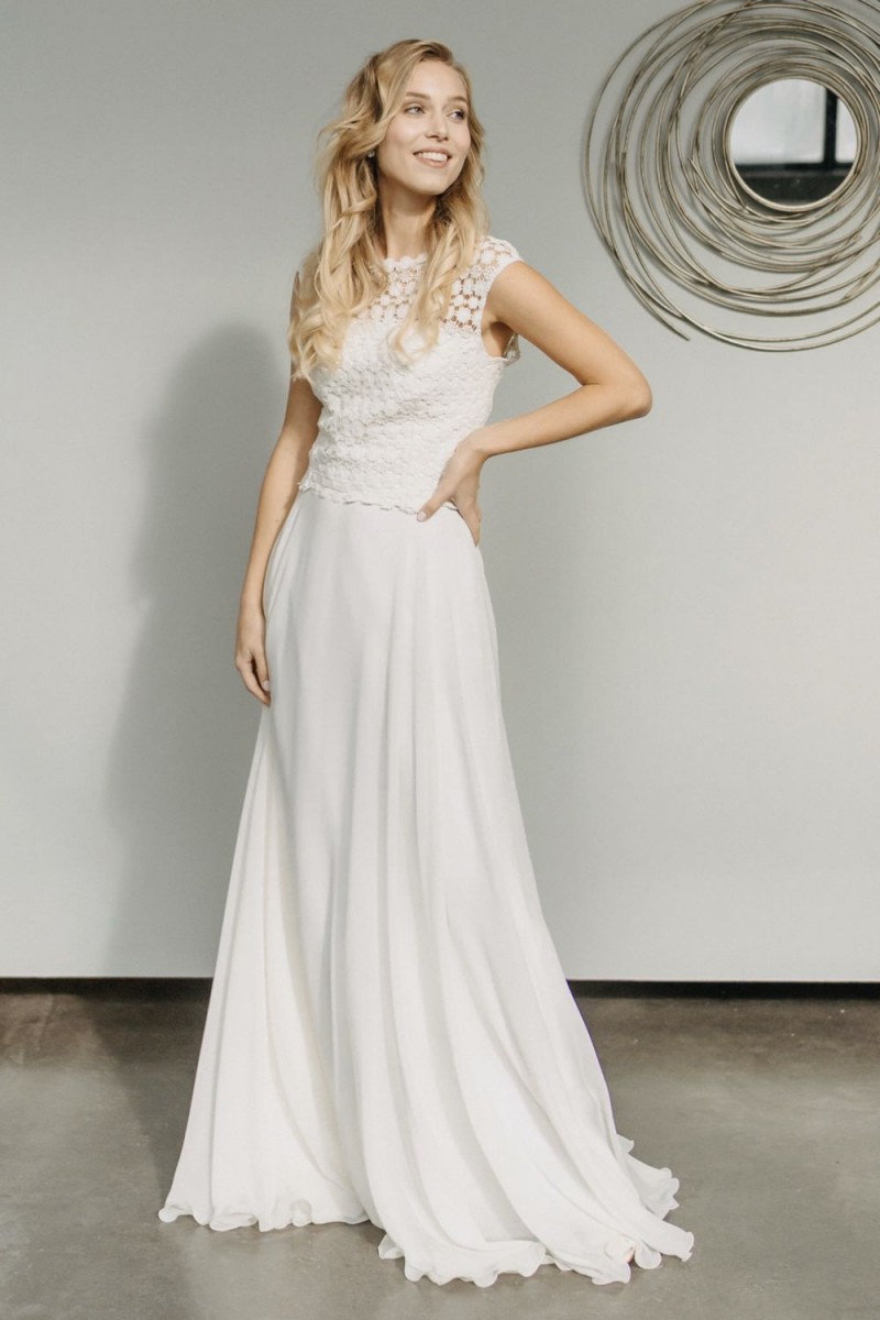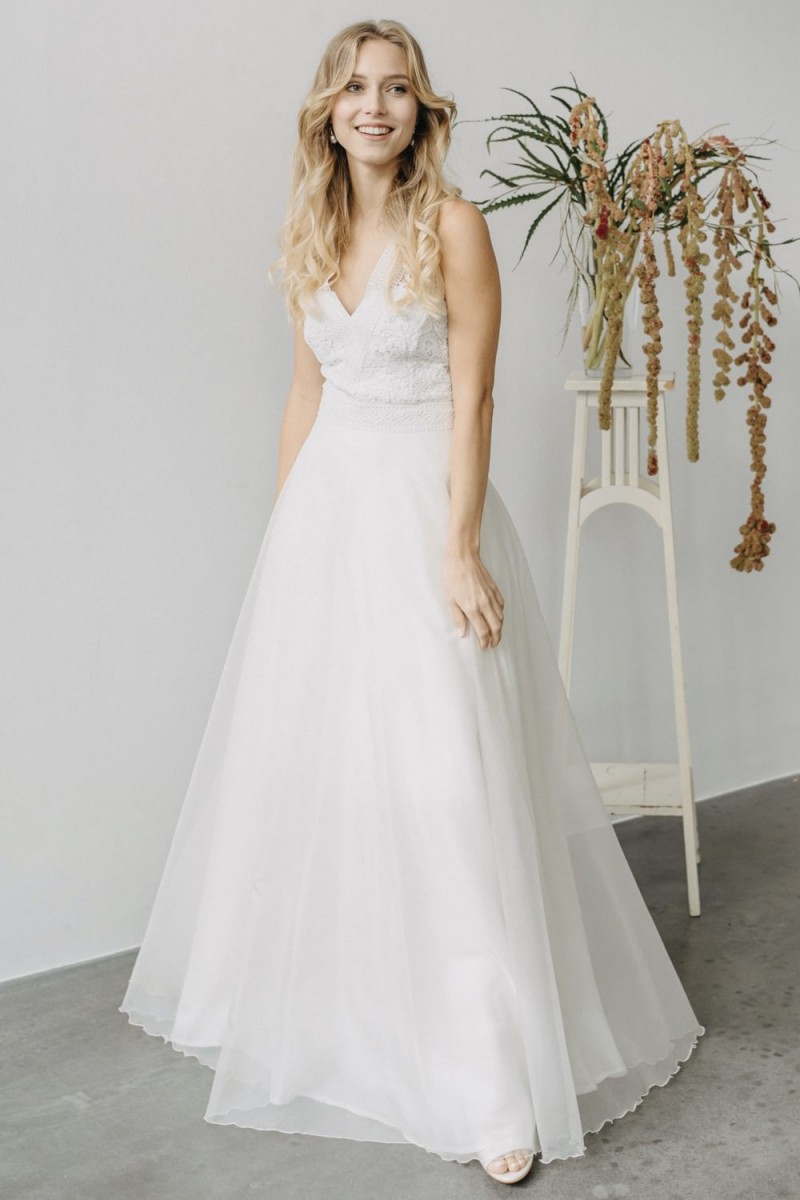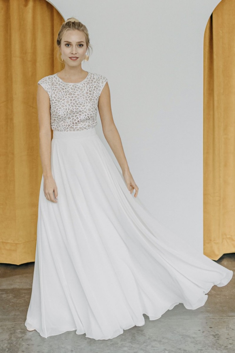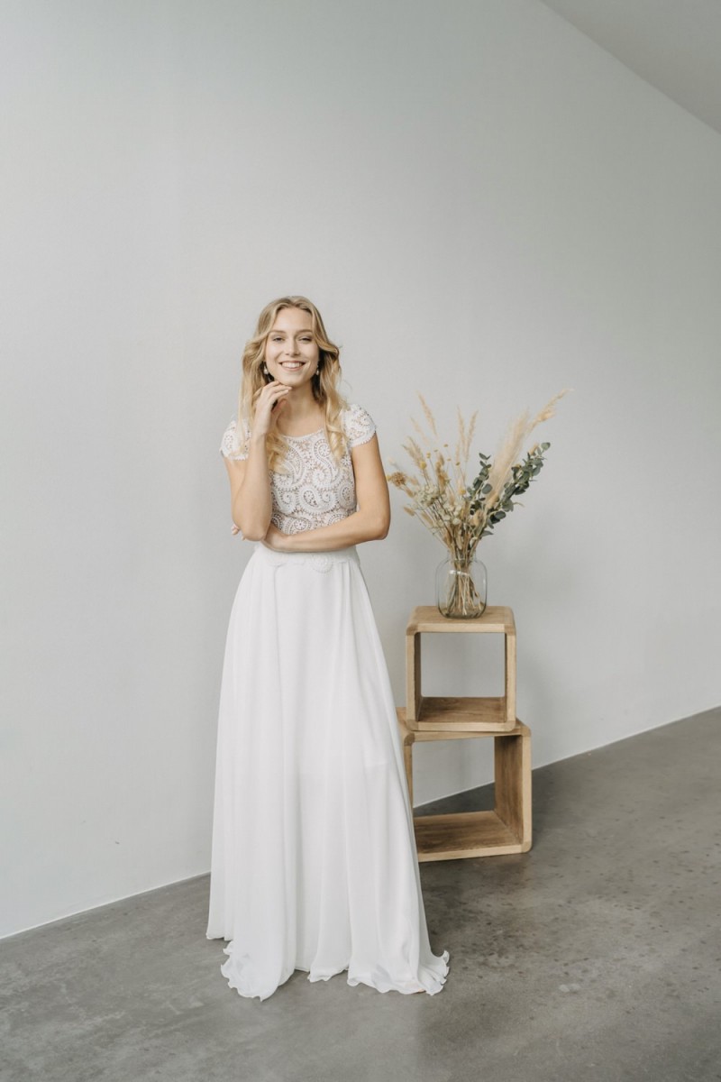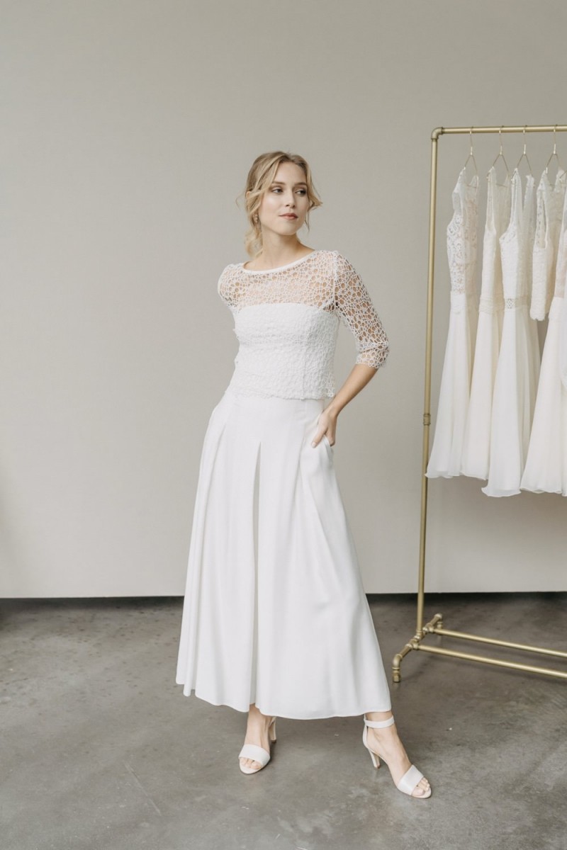 Insgesamt sind vier Standesamtkleider der im Frühjahr veröffentlichten kurzen Brautkleid-Kollektion in die neue Kollektion übernommen worden: Fleur, Dahlia, Lilli und Ivy. Hier lassen sich lange Röcke ganz einfach für die 2-in-1-Brautkleid-Variante anknöpfen oder dauerhaft auswechseln. Darüber hinaus gibt es fünf verschiedene Röcke, eine Hose und zwei Hosenröcke in variantenreichen Schnitten, die sich mit acht Oberteilen zu Standesamt- und Hochzeits-Outfits kombinieren lassen. On top hat die Designerin zwei Jumpsuits für die urbane Braut kreiert. Im Zentrum stehen leichte Stoffe wie Chiffon, Tüll, Organza, Viskose und Jersey – die Oberteile begeistern mit raffinierten Spitzen von modern bis romantisch-verspielt.
