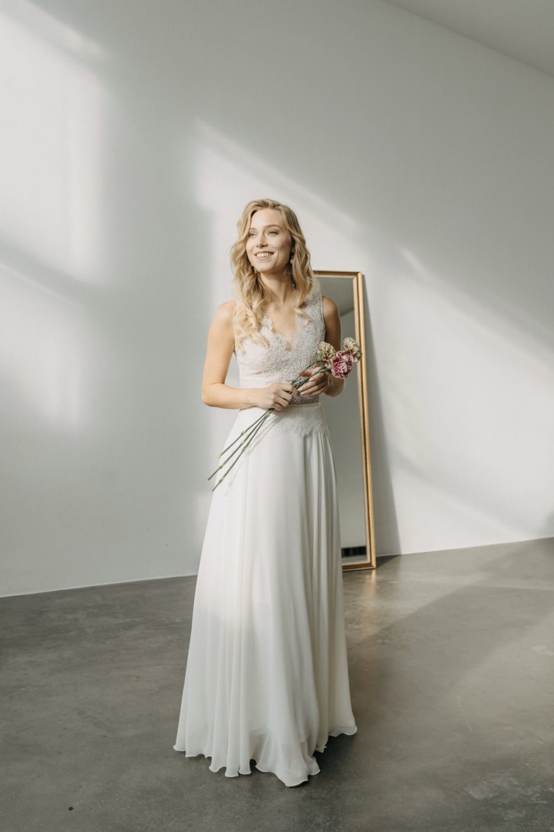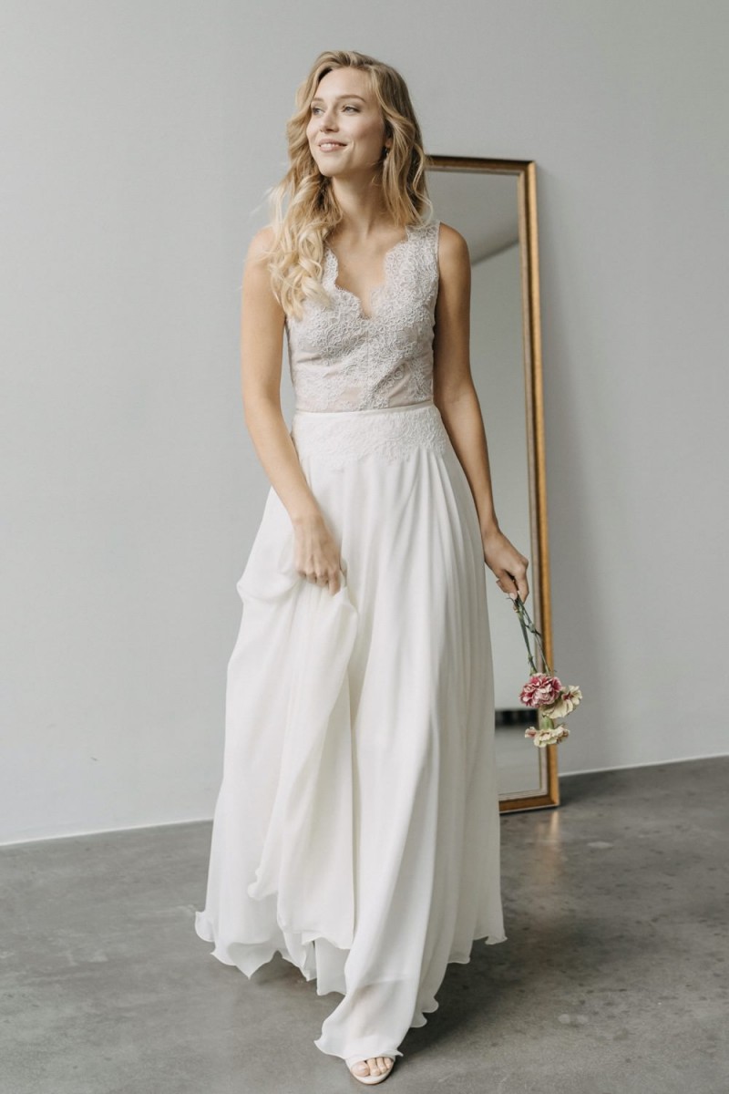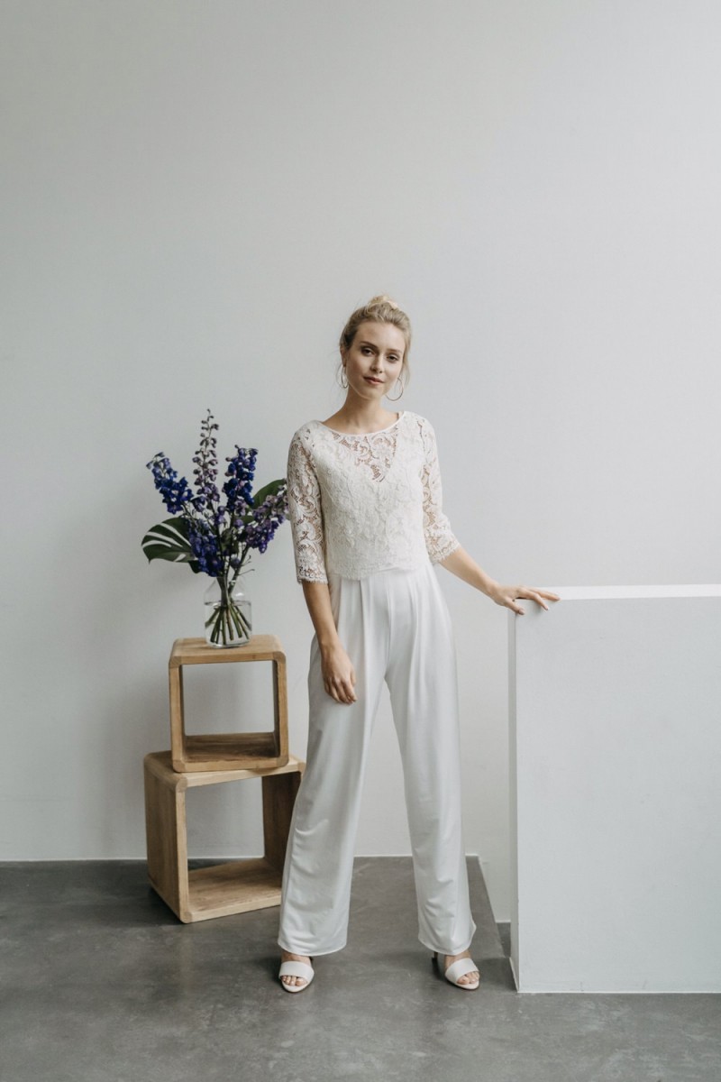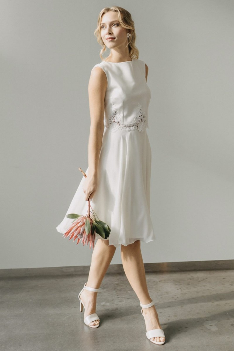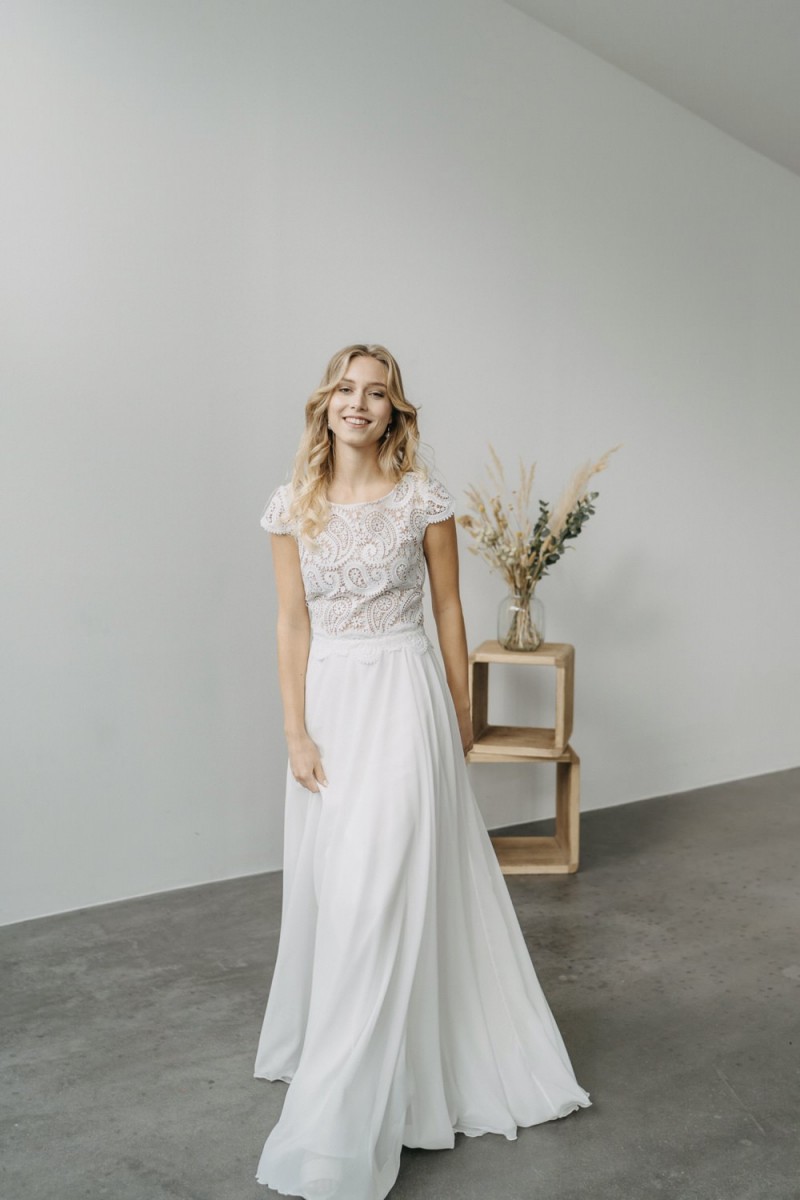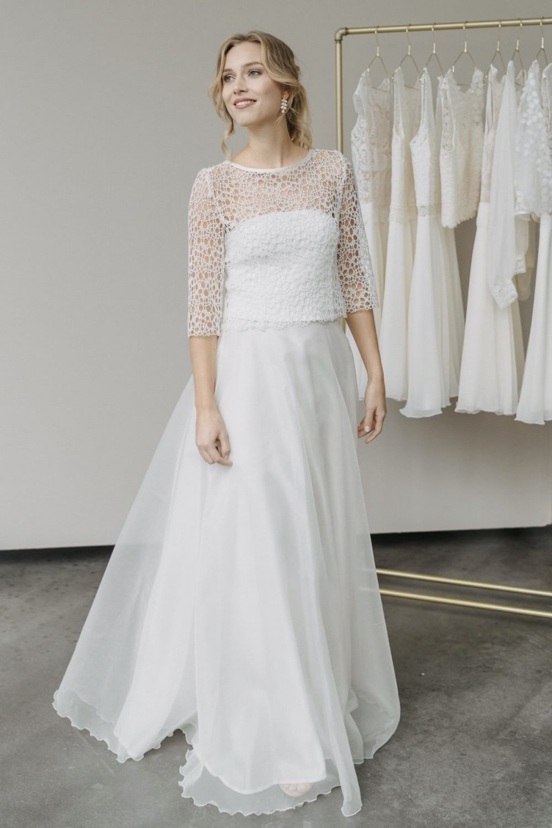Insgesamt sind vier Standesamtkleider der im Frühjahr veröffentlichten kurzen Brautkleid-Kollektion in die neue Kollektion übernommen worden: Fleur, Dahlia, Lilli und Ivy. Hier lassen sich lange Röcke ganz einfach für die 2-in-1-Brautkleid-Variante anknöpfen oder dauerhaft auswechseln. Darüber hinaus gibt es fünf verschiedene Röcke, eine Hose und zwei Hosenröcke in variantenreichen Schnitten, die sich mit acht Oberteilen zu Standesamt- und Hochzeits-Outfits kombinieren lassen. On top hat die Designerin zwei Jumpsuits für die urbane Braut kreiert. Im Zentrum stehen leichte Stoffe wie Chiffon, Tüll, Organza, Viskose und Jersey – die Oberteile begeistern mit raffinierten Spitzen von modern bis romantisch-verspielt.