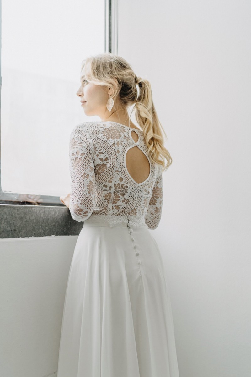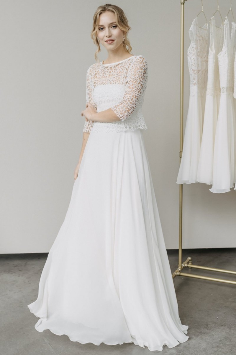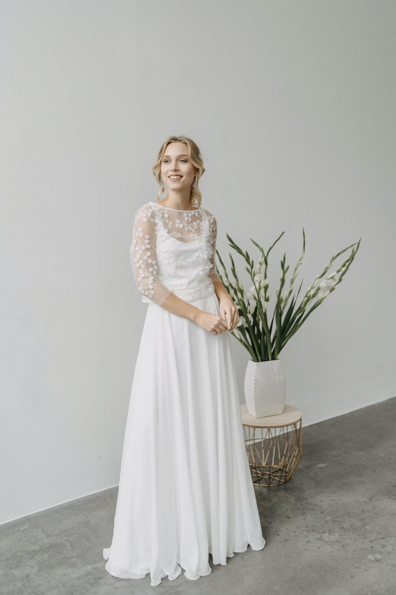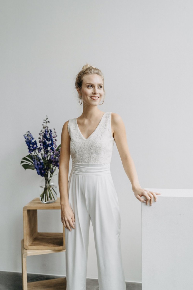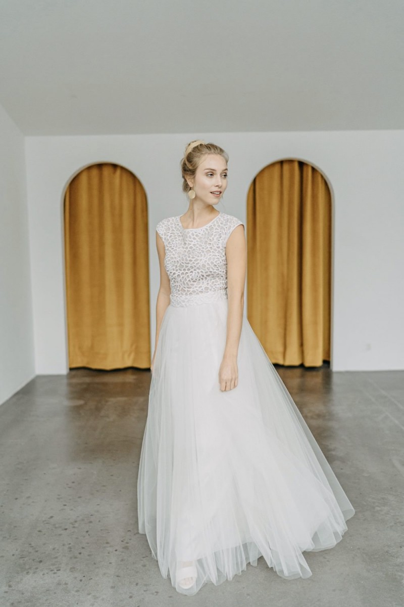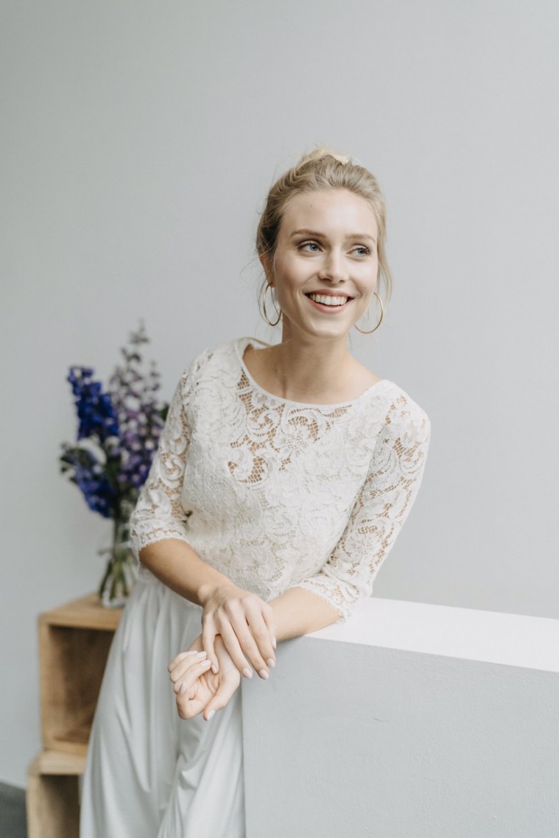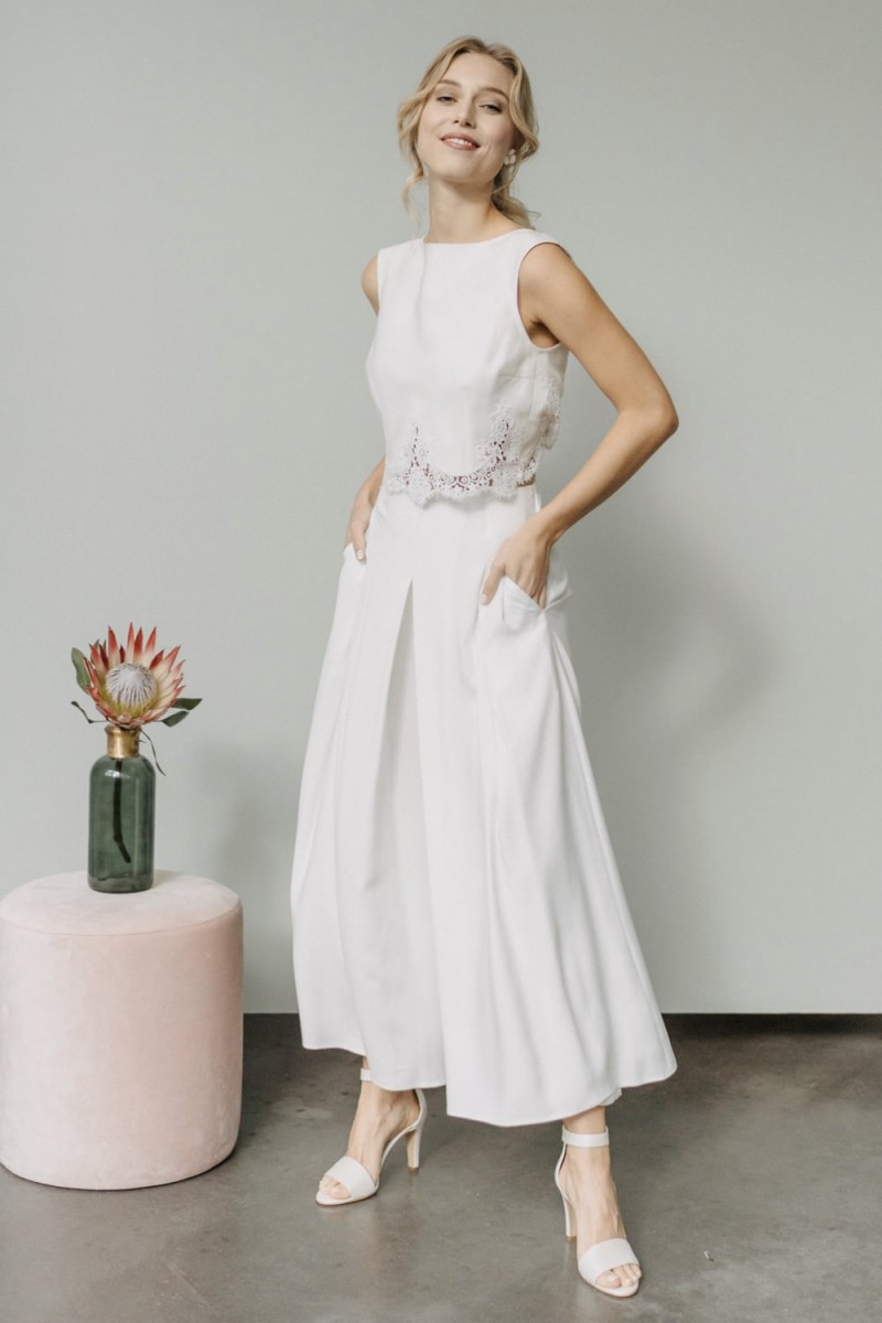 Insgesamt sind vier Standesamtkleider der im Frühjahr veröffentlichten kurzen Brautkleid-Kollektion in die neue Kollektion übernommen worden: Fleur, Dahlia, Lilli und Ivy. Hier lassen sich lange Röcke ganz einfach für die 2-in-1-Brautkleid-Variante anknöpfen oder dauerhaft auswechseln. Darüber hinaus gibt es fünf verschiedene Röcke, eine Hose und zwei Hosenröcke in variantenreichen Schnitten, die sich mit acht Oberteilen zu Standesamt- und Hochzeits-Outfits kombinieren lassen. On top hat die Designerin zwei Jumpsuits für die urbane Braut kreiert. Im Zentrum stehen leichte Stoffe wie Chiffon, Tüll, Organza, Viskose und Jersey – die Oberteile begeistern mit raffinierten Spitzen von modern bis romantisch-verspielt.