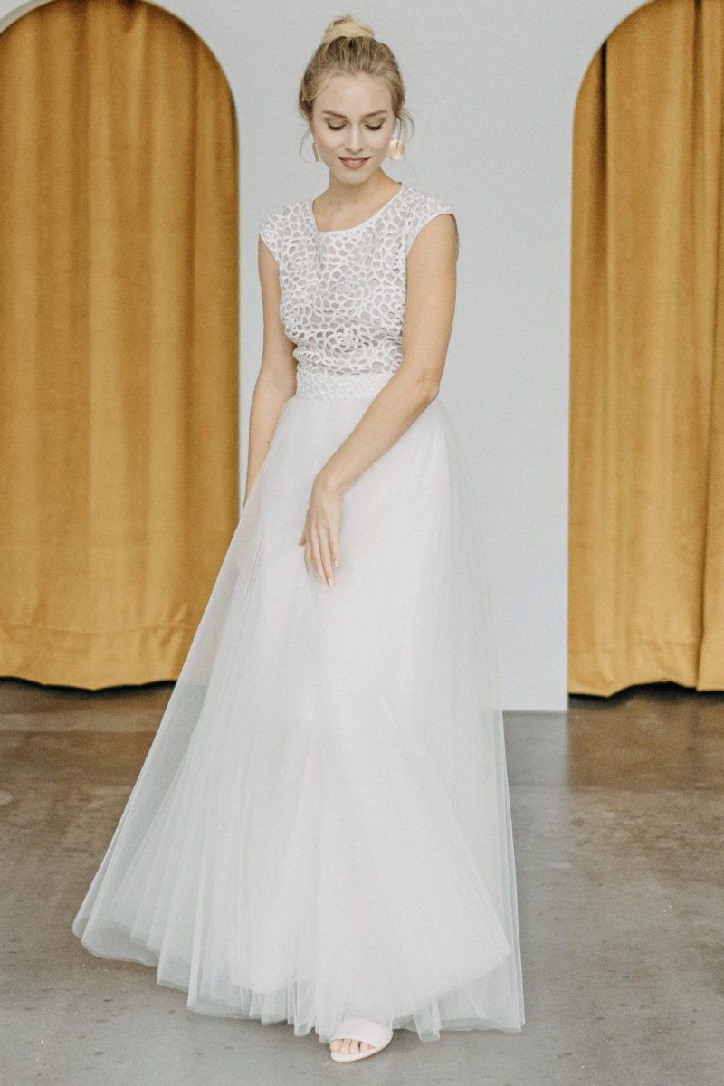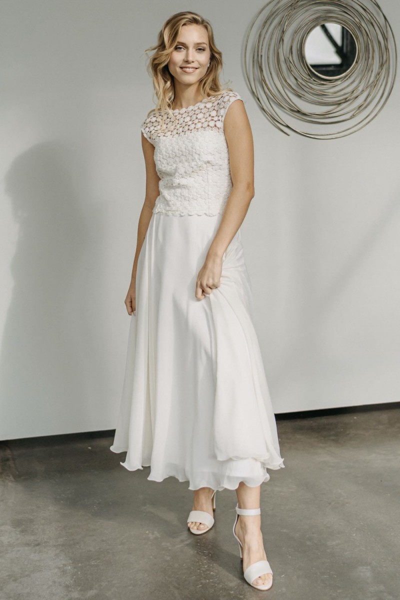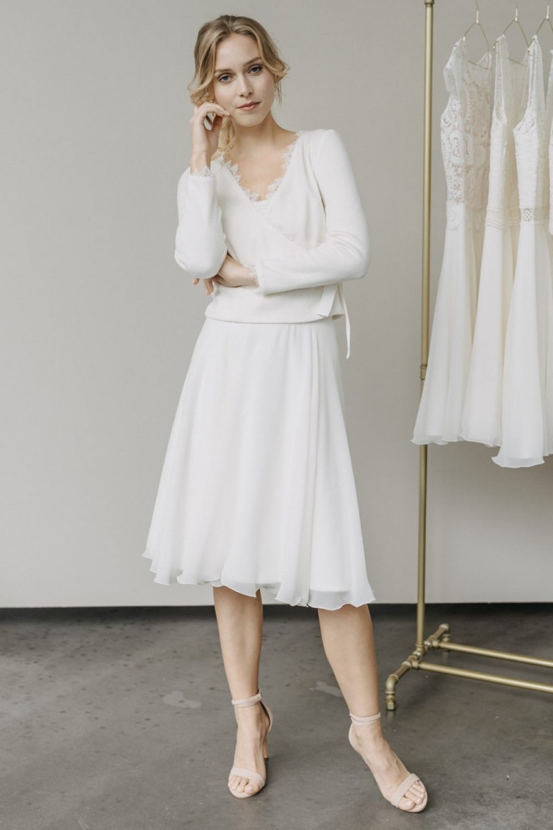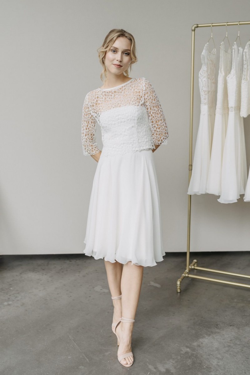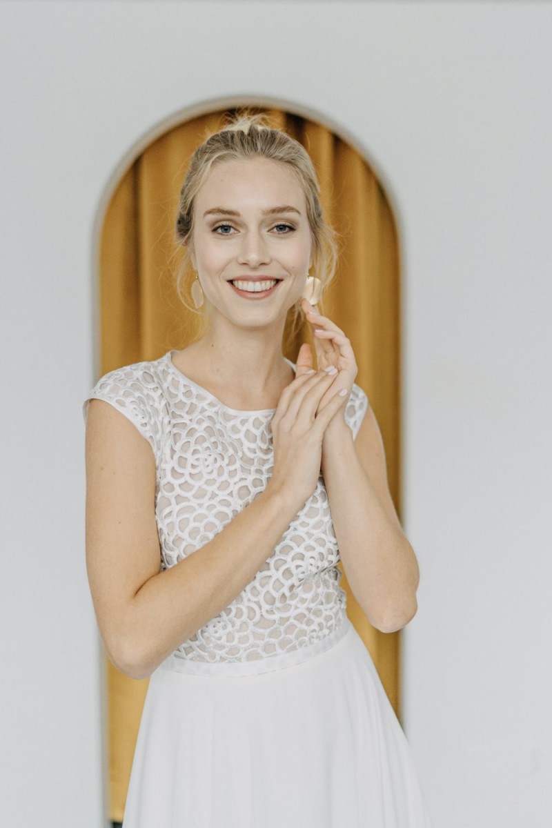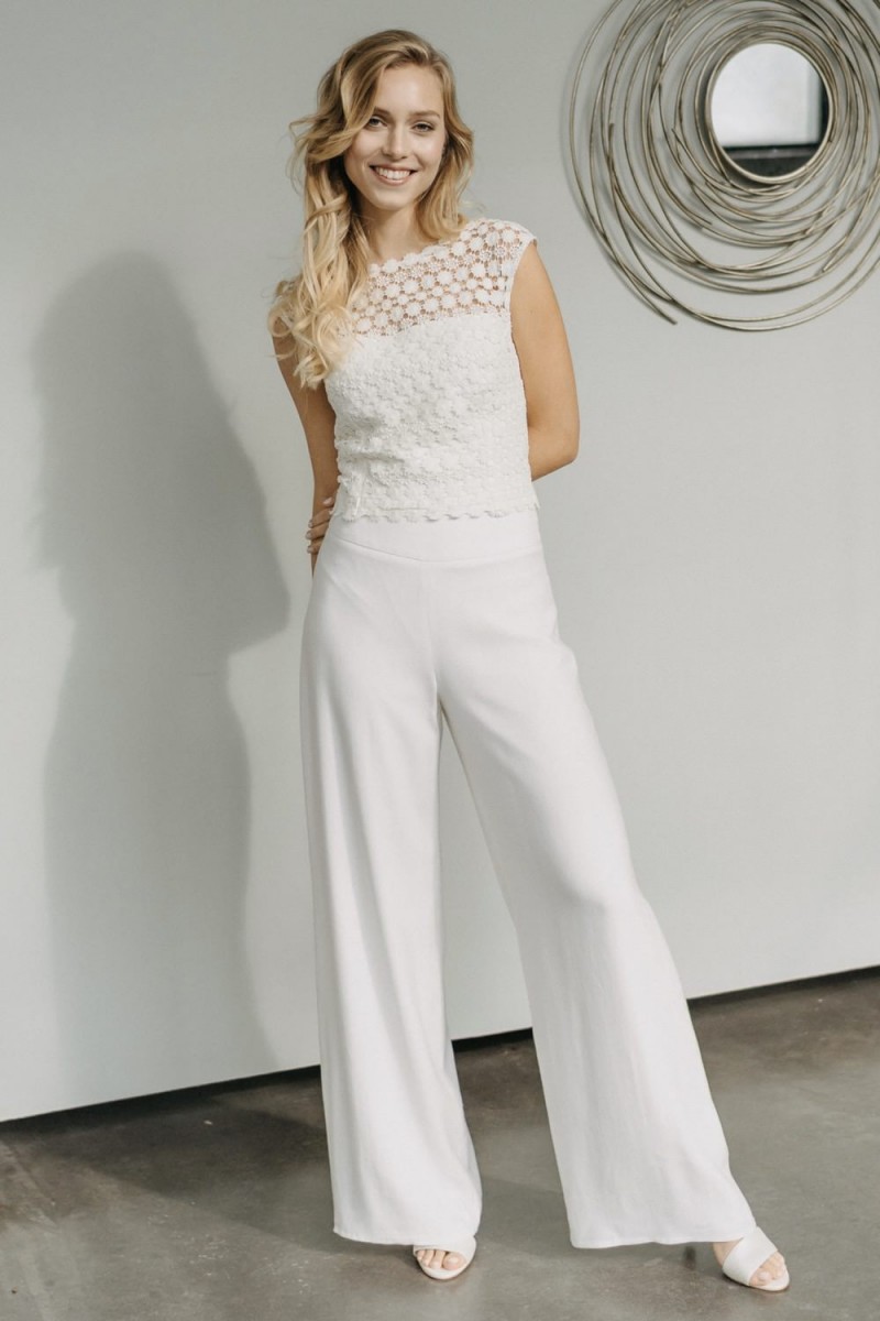 Insgesamt sind vier Standesamtkleider der im Frühjahr veröffentlichten kurzen Brautkleid-Kollektion in die neue Kollektion übernommen worden: Fleur, Dahlia, Lilli und Ivy. Hier lassen sich lange Röcke ganz einfach für die 2-in-1-Brautkleid-Variante anknöpfen oder dauerhaft auswechseln. Darüber hinaus gibt es fünf verschiedene Röcke, eine Hose und zwei Hosenröcke in variantenreichen Schnitten, die sich mit acht Oberteilen zu Standesamt- und Hochzeits-Outfits kombinieren lassen. On top hat die Designerin zwei Jumpsuits für die urbane Braut kreiert. Im Zentrum stehen leichte Stoffe wie Chiffon, Tüll, Organza, Viskose und Jersey – die Oberteile begeistern mit raffinierten Spitzen von modern bis romantisch-verspielt.