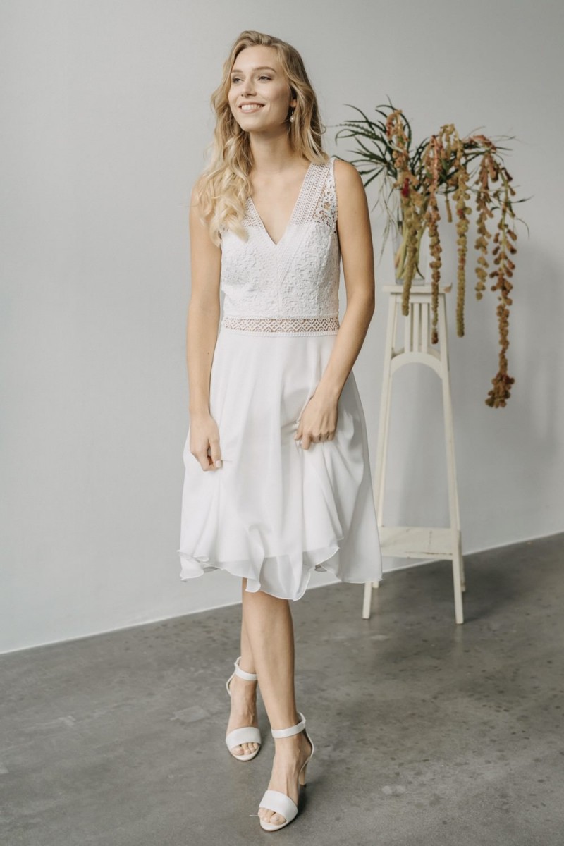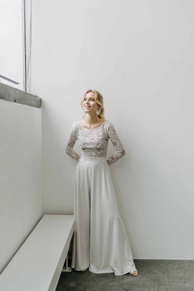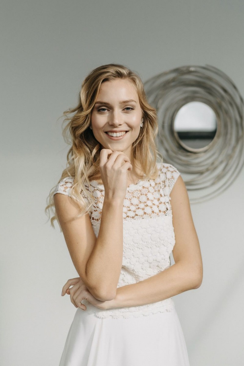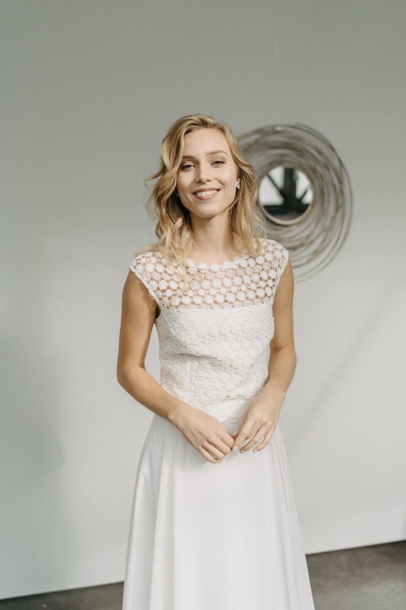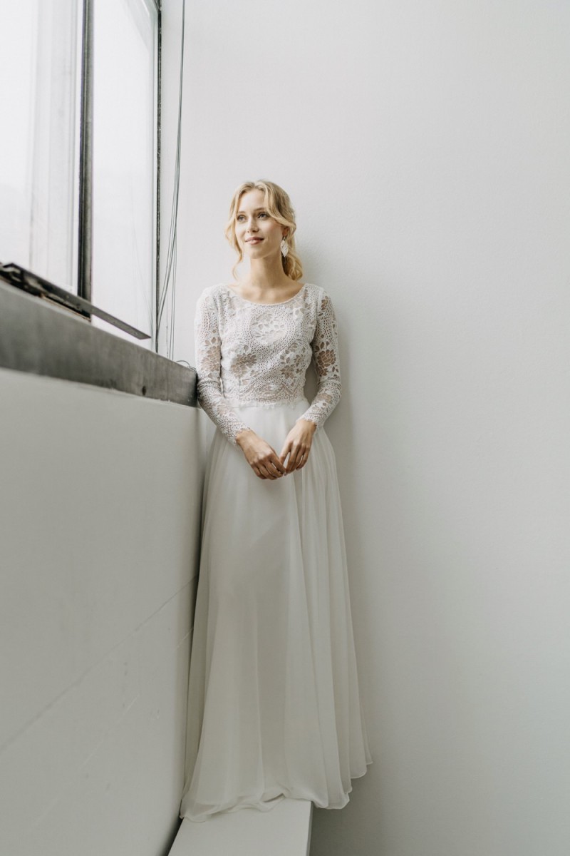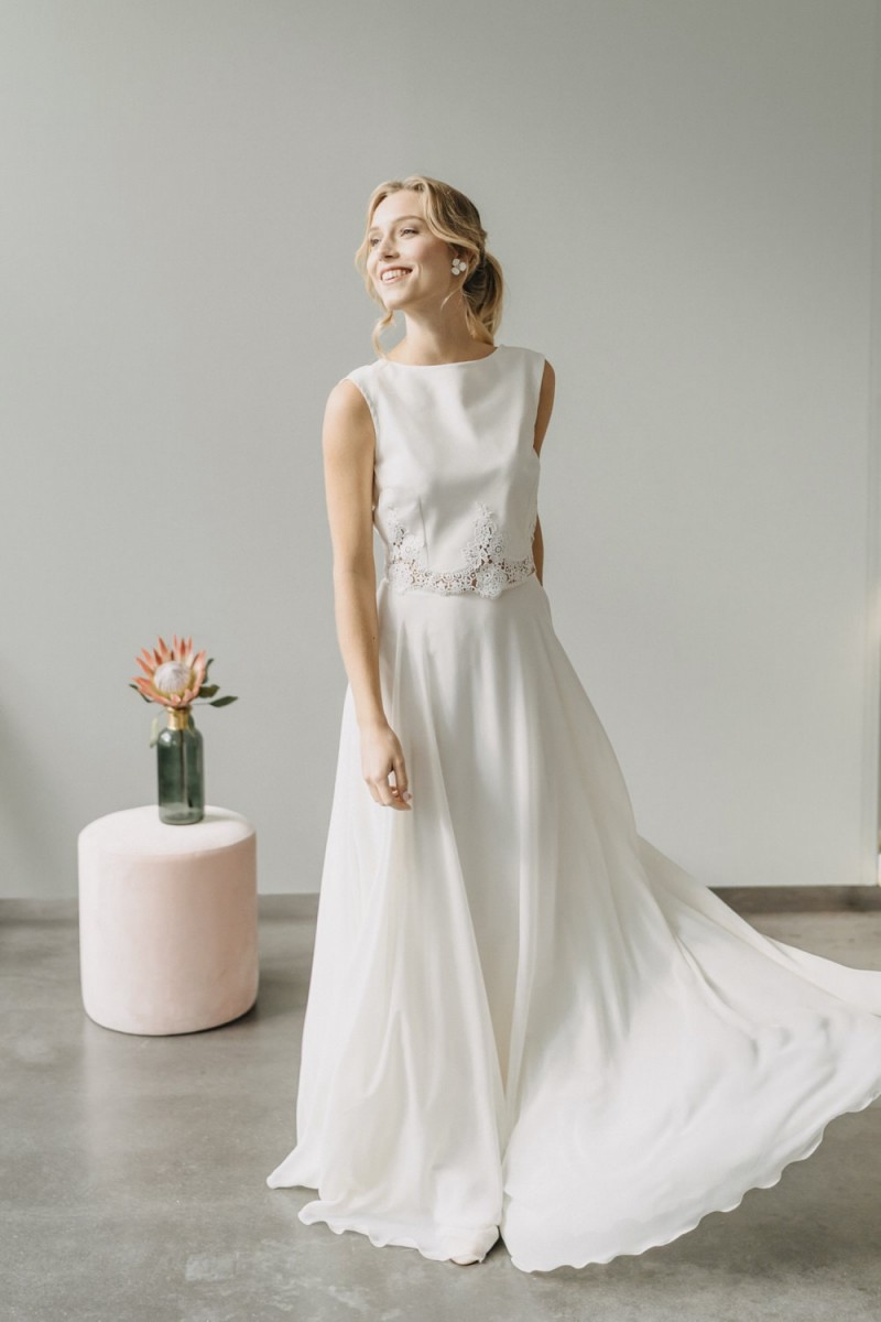 Insgesamt sind vier Standesamtkleider der im Frühjahr veröffentlichten kurzen Brautkleid-Kollektion in die neue Kollektion übernommen worden: Fleur, Dahlia, Lilli und Ivy. Hier lassen sich lange Röcke ganz einfach für die 2-in-1-Brautkleid-Variante anknöpfen oder dauerhaft auswechseln. Darüber hinaus gibt es fünf verschiedene Röcke, eine Hose und zwei Hosenröcke in variantenreichen Schnitten, die sich mit acht Oberteilen zu Standesamt- und Hochzeits-Outfits kombinieren lassen. On top hat die Designerin zwei Jumpsuits für die urbane Braut kreiert. Im Zentrum stehen leichte Stoffe wie Chiffon, Tüll, Organza, Viskose und Jersey – die Oberteile begeistern mit raffinierten Spitzen von modern bis romantisch-verspielt.