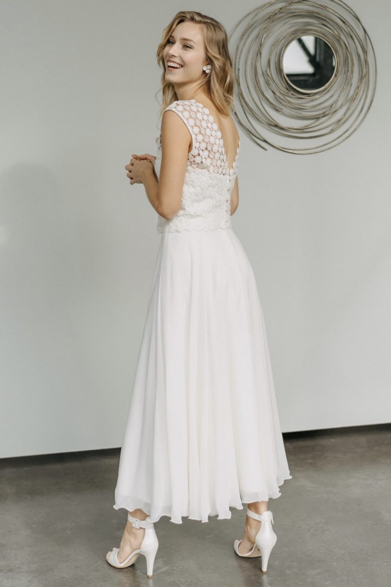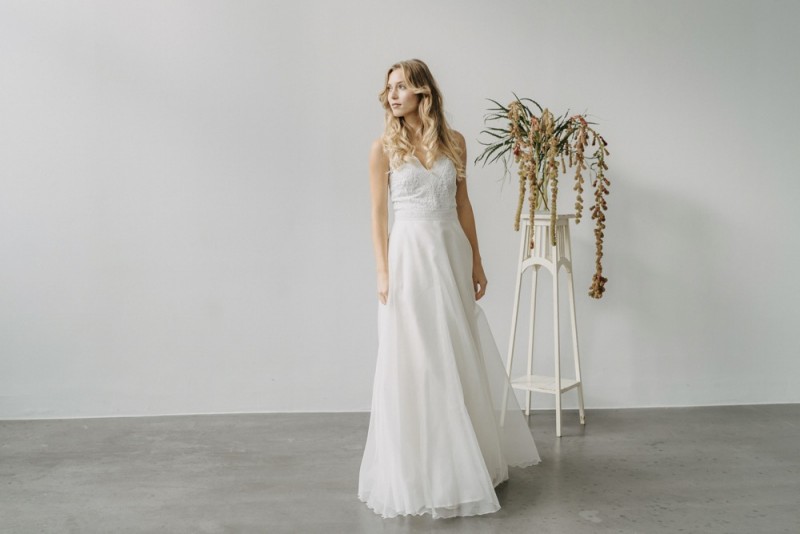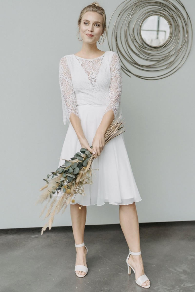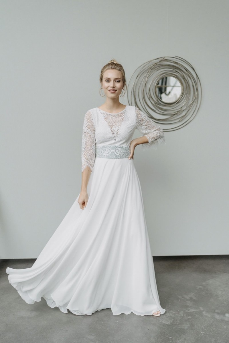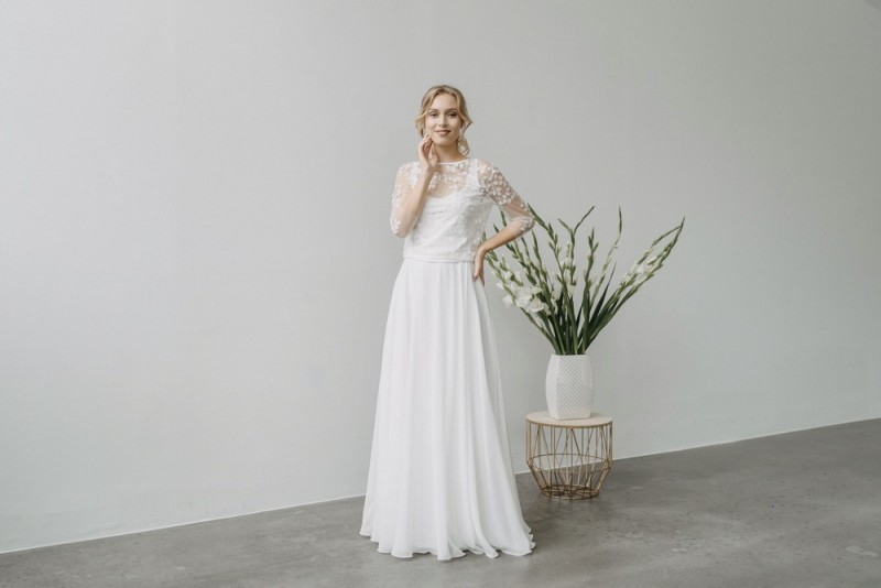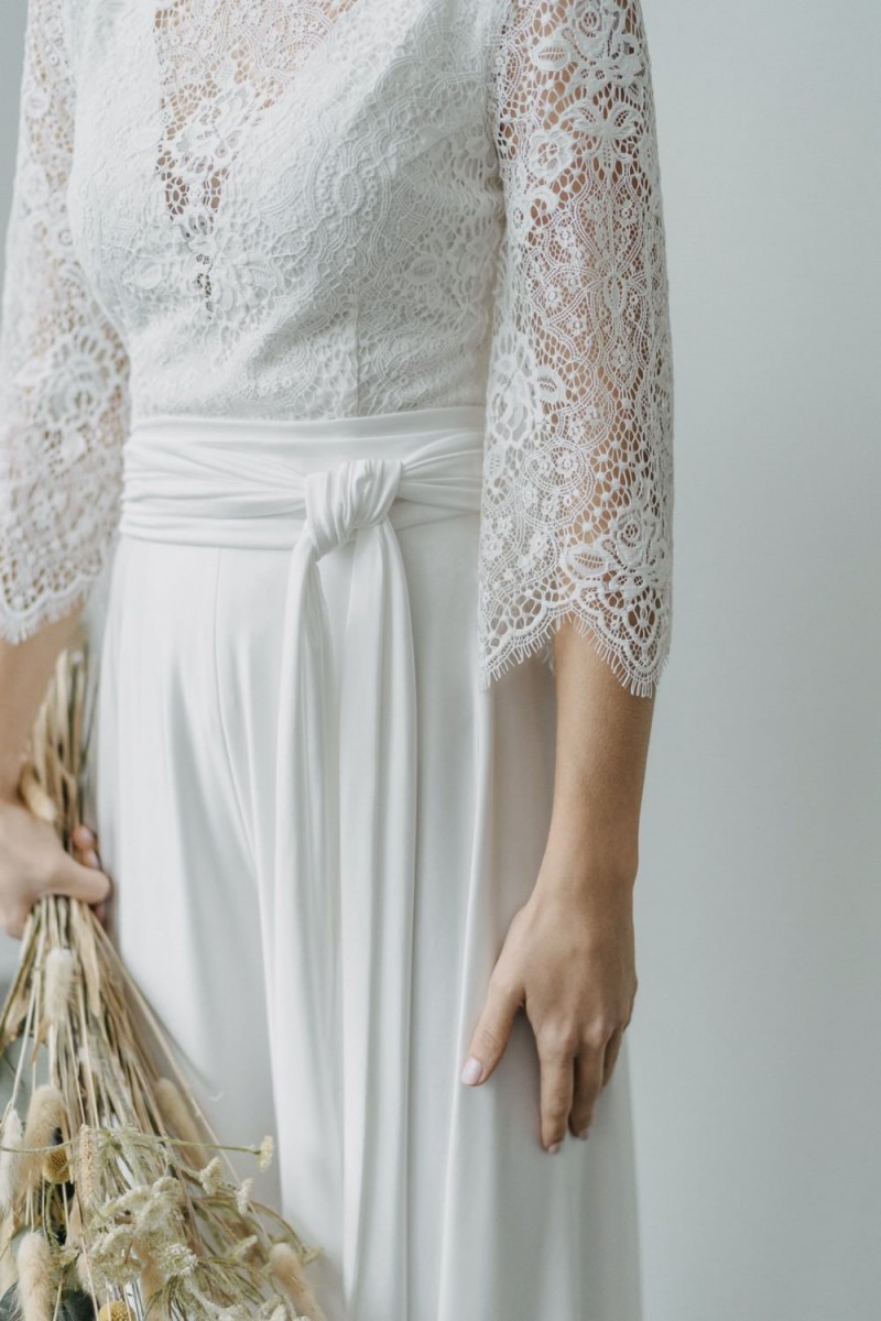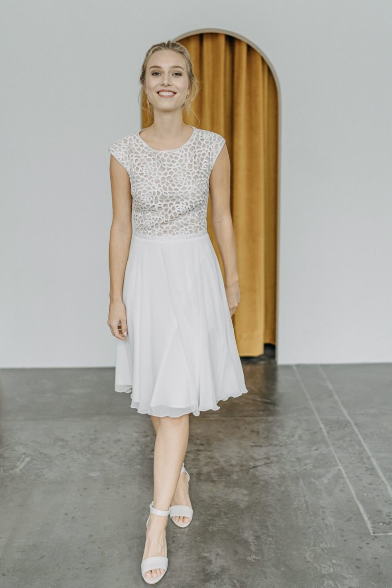 Insgesamt sind vier Standesamtkleider der im Frühjahr veröffentlichten kurzen Brautkleid-Kollektion in die neue Kollektion übernommen worden: Fleur, Dahlia, Lilli und Ivy. Hier lassen sich lange Röcke ganz einfach für die 2-in-1-Brautkleid-Variante anknöpfen oder dauerhaft auswechseln. Darüber hinaus gibt es fünf verschiedene Röcke, eine Hose und zwei Hosenröcke in variantenreichen Schnitten, die sich mit acht Oberteilen zu Standesamt- und Hochzeits-Outfits kombinieren lassen. On top hat die Designerin zwei Jumpsuits für die urbane Braut kreiert. Im Zentrum stehen leichte Stoffe wie Chiffon, Tüll, Organza, Viskose und Jersey – die Oberteile begeistern mit raffinierten Spitzen von modern bis romantisch-verspielt.