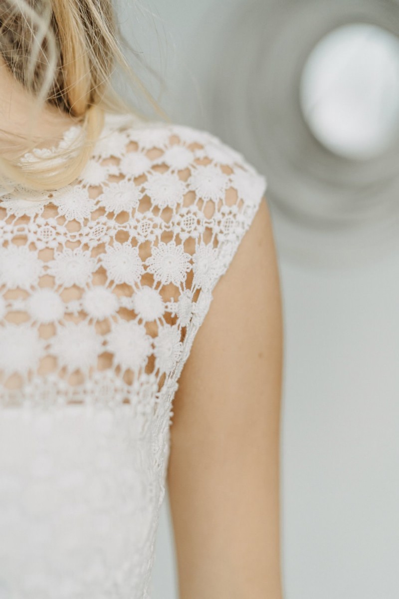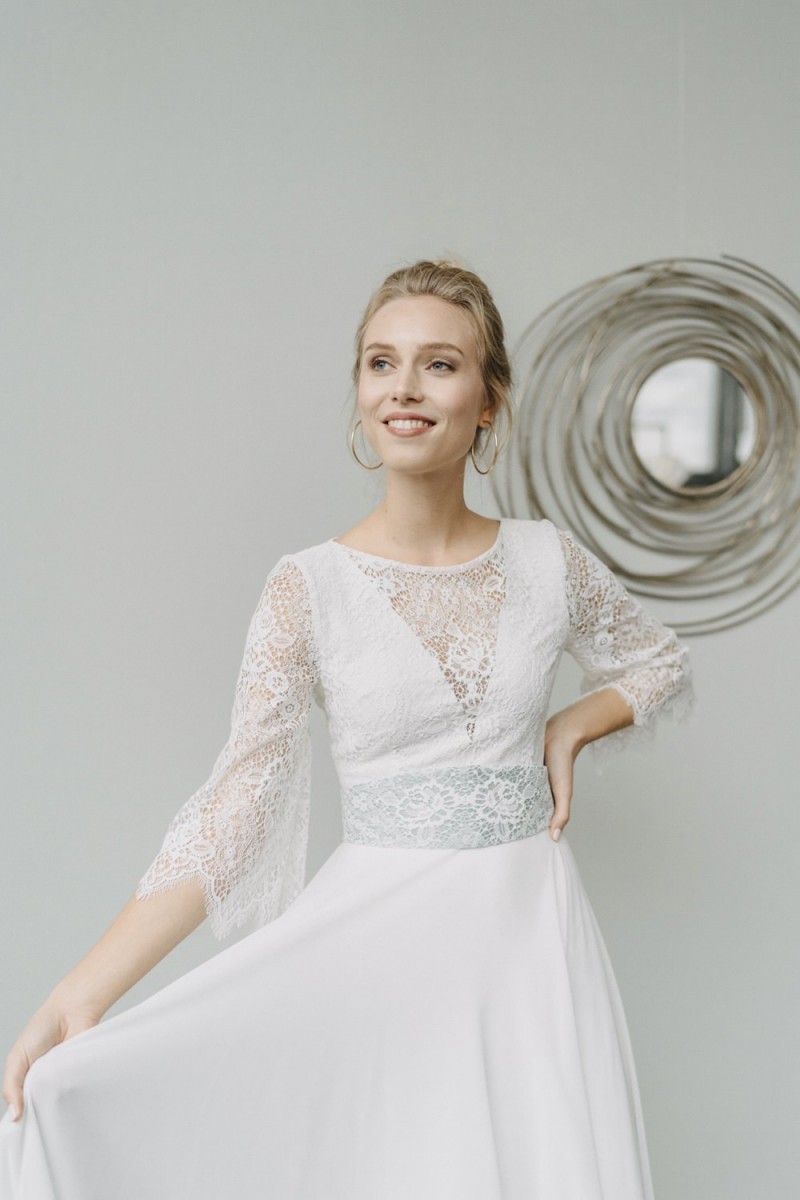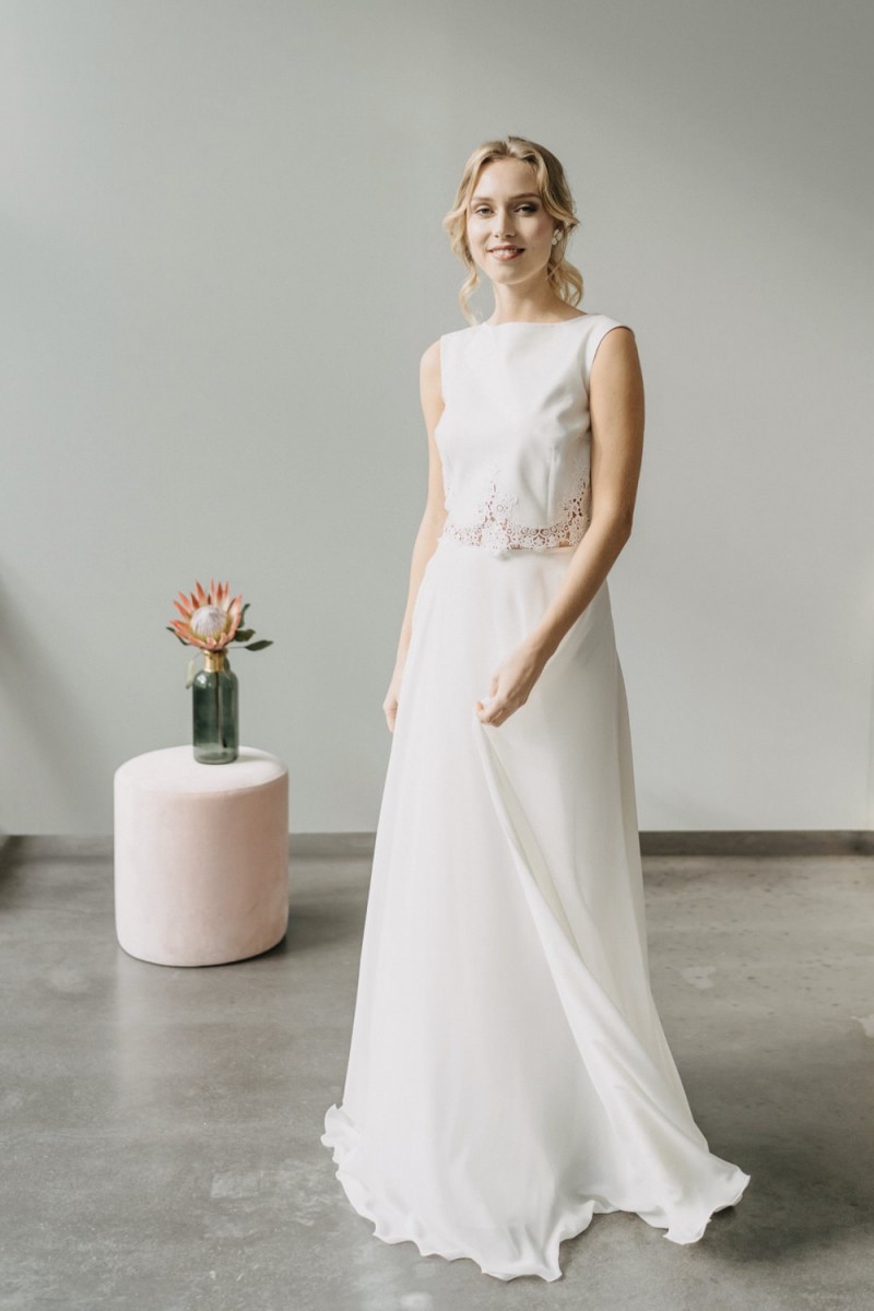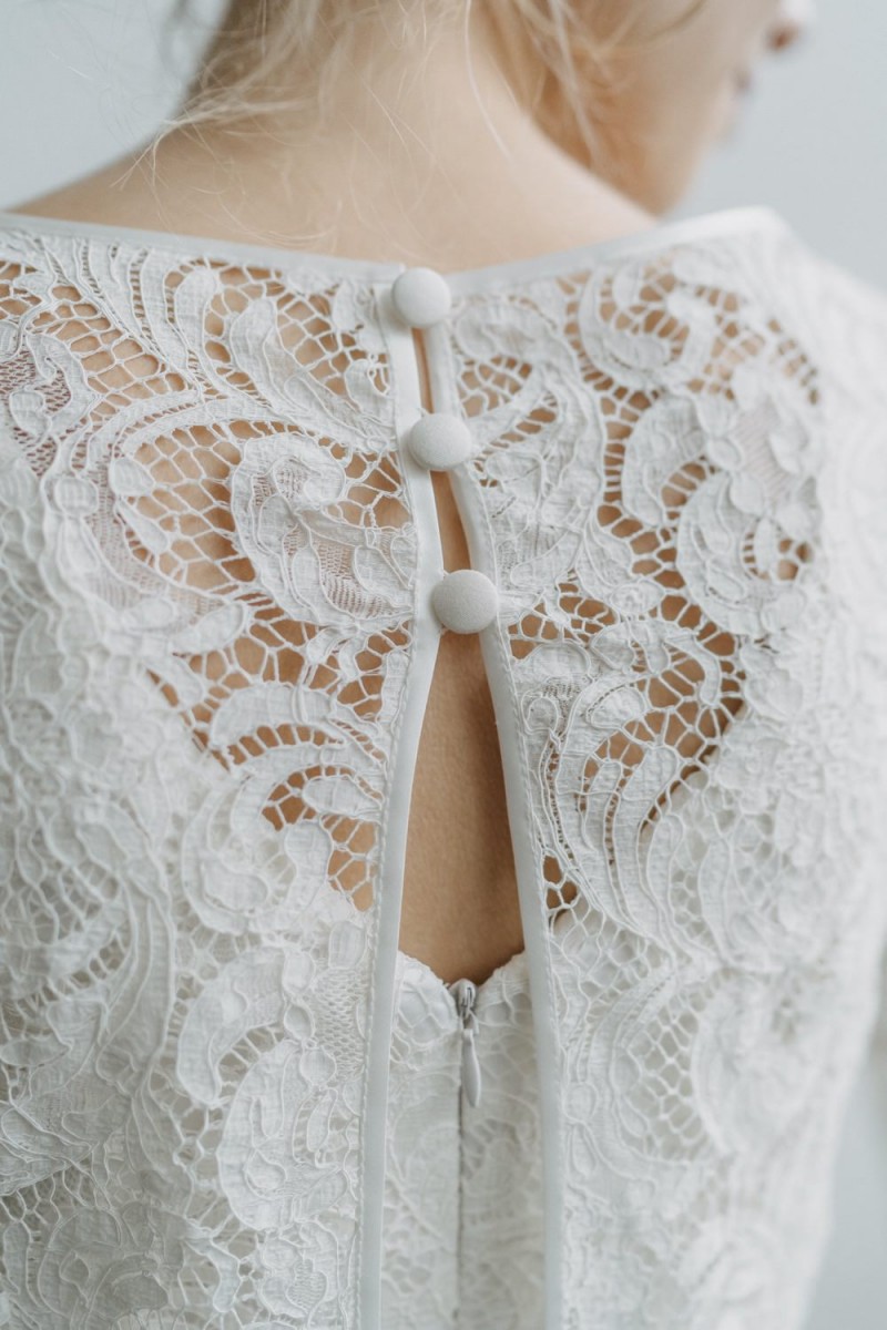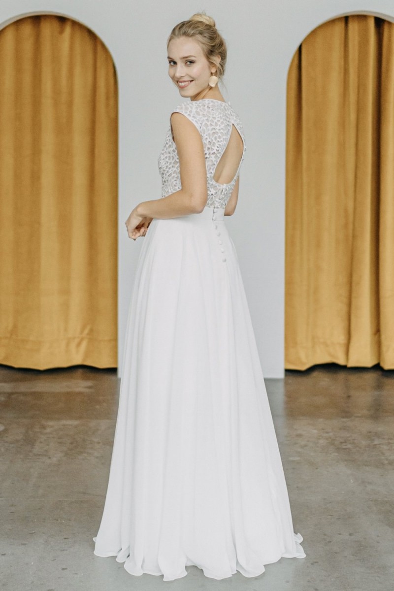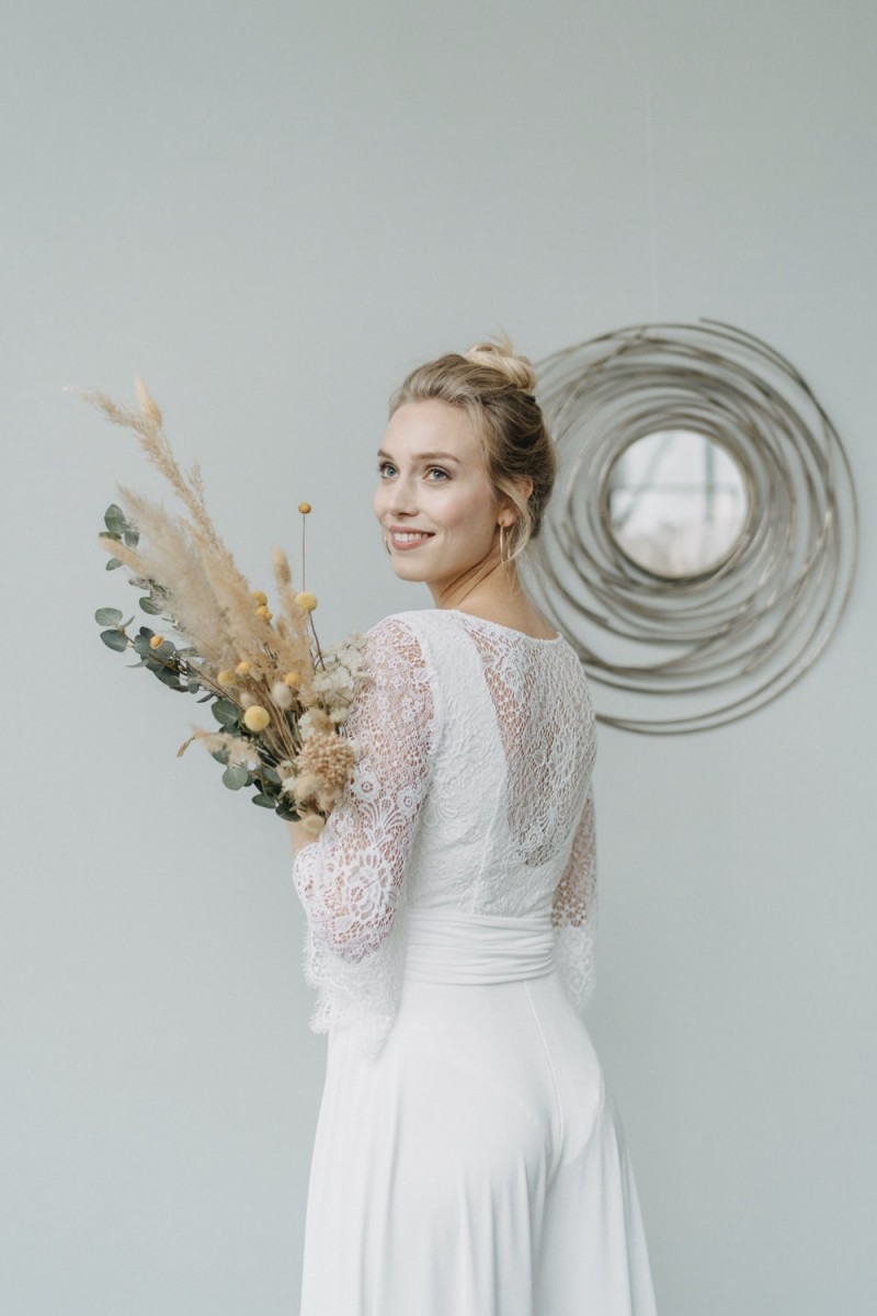 Insgesamt sind vier Standesamtkleider der im Frühjahr veröffentlichten kurzen Brautkleid-Kollektion in die neue Kollektion übernommen worden: Fleur, Dahlia, Lilli und Ivy. Hier lassen sich lange Röcke ganz einfach für die 2-in-1-Brautkleid-Variante anknöpfen oder dauerhaft auswechseln. Darüber hinaus gibt es fünf verschiedene Röcke, eine Hose und zwei Hosenröcke in variantenreichen Schnitten, die sich mit acht Oberteilen zu Standesamt- und Hochzeits-Outfits kombinieren lassen. On top hat die Designerin zwei Jumpsuits für die urbane Braut kreiert. Im Zentrum stehen leichte Stoffe wie Chiffon, Tüll, Organza, Viskose und Jersey – die Oberteile begeistern mit raffinierten Spitzen von modern bis romantisch-verspielt.
