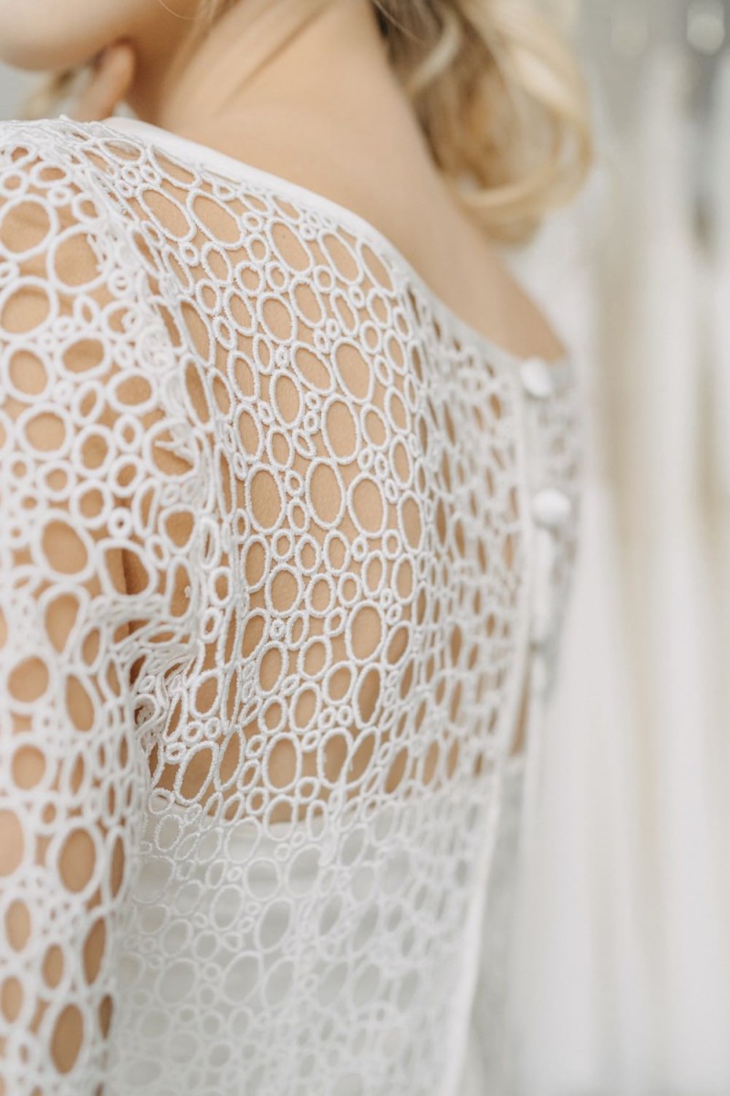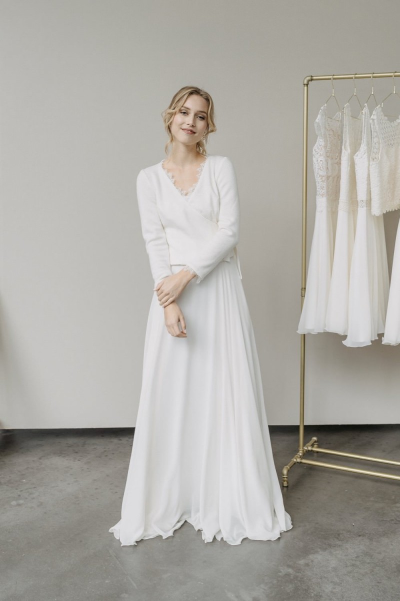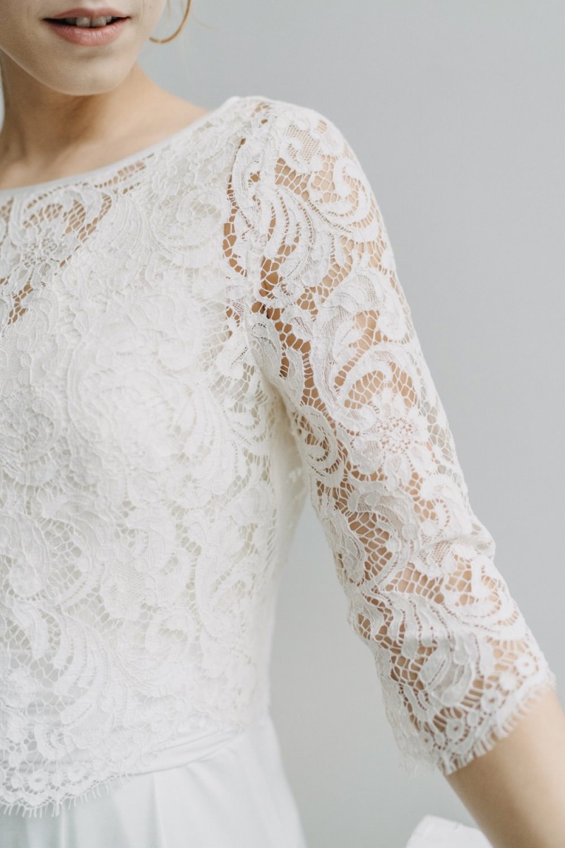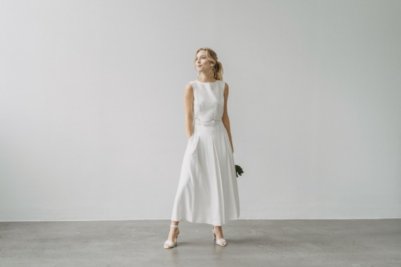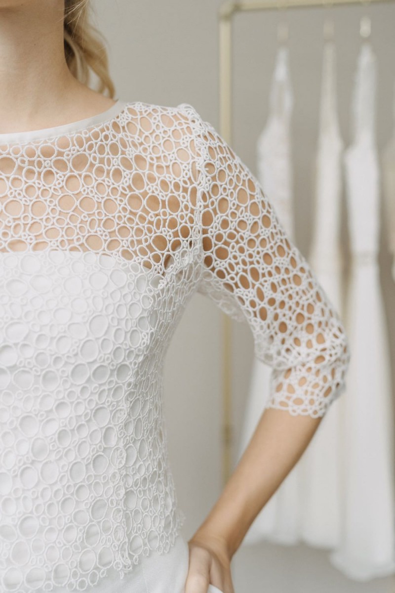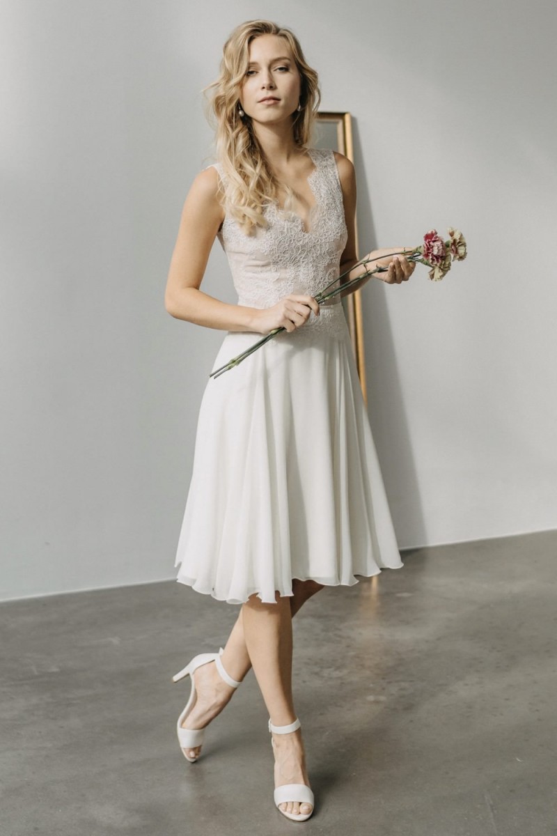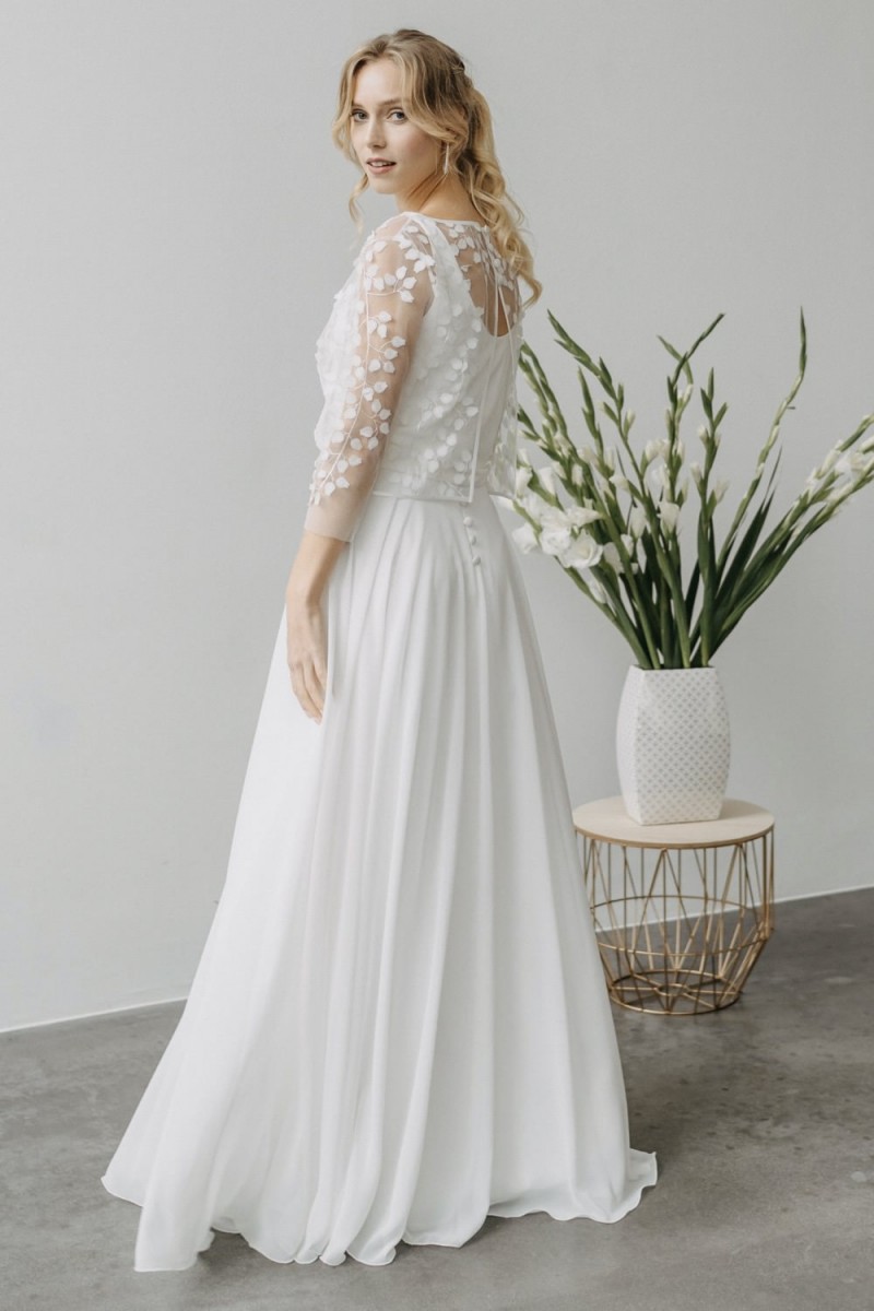 Insgesamt sind vier Standesamtkleider der im Frühjahr veröffentlichten kurzen Brautkleid-Kollektion in die neue Kollektion übernommen worden: Fleur, Dahlia, Lilli und Ivy. Hier lassen sich lange Röcke ganz einfach für die 2-in-1-Brautkleid-Variante anknöpfen oder dauerhaft auswechseln. Darüber hinaus gibt es fünf verschiedene Röcke, eine Hose und zwei Hosenröcke in variantenreichen Schnitten, die sich mit acht Oberteilen zu Standesamt- und Hochzeits-Outfits kombinieren lassen. On top hat die Designerin zwei Jumpsuits für die urbane Braut kreiert. Im Zentrum stehen leichte Stoffe wie Chiffon, Tüll, Organza, Viskose und Jersey – die Oberteile begeistern mit raffinierten Spitzen von modern bis romantisch-verspielt.