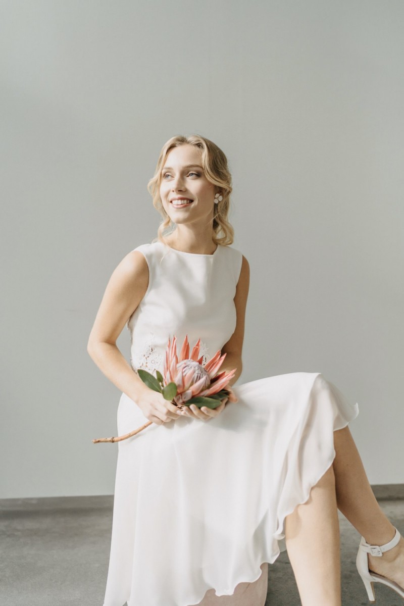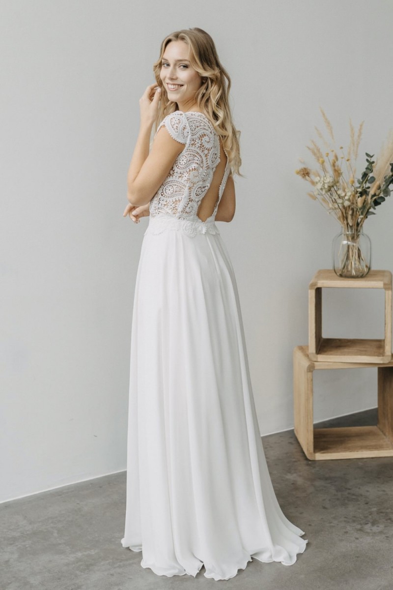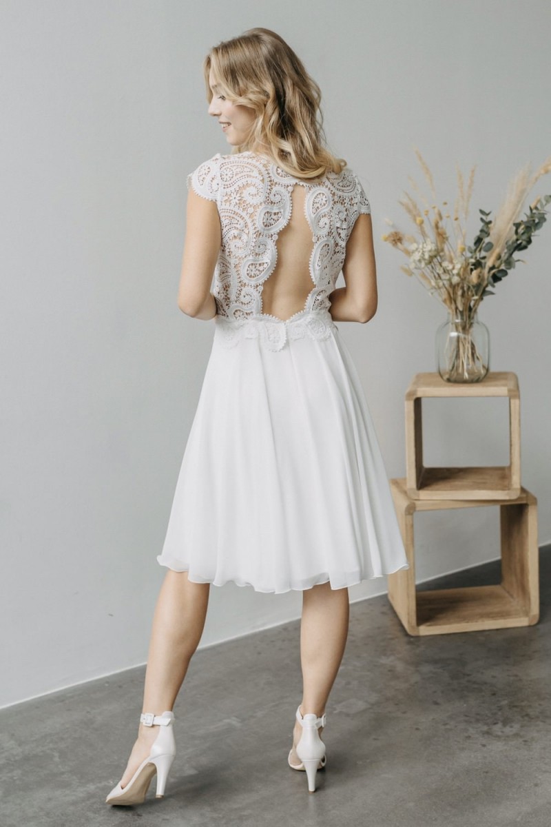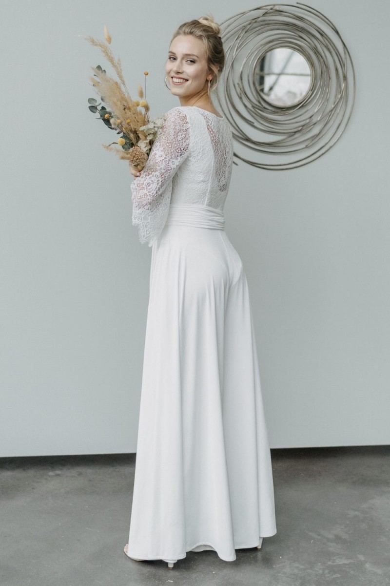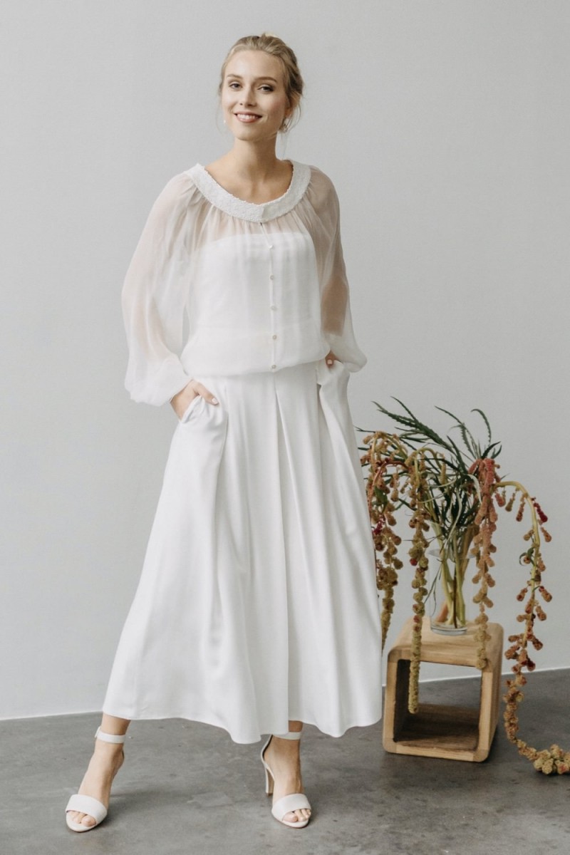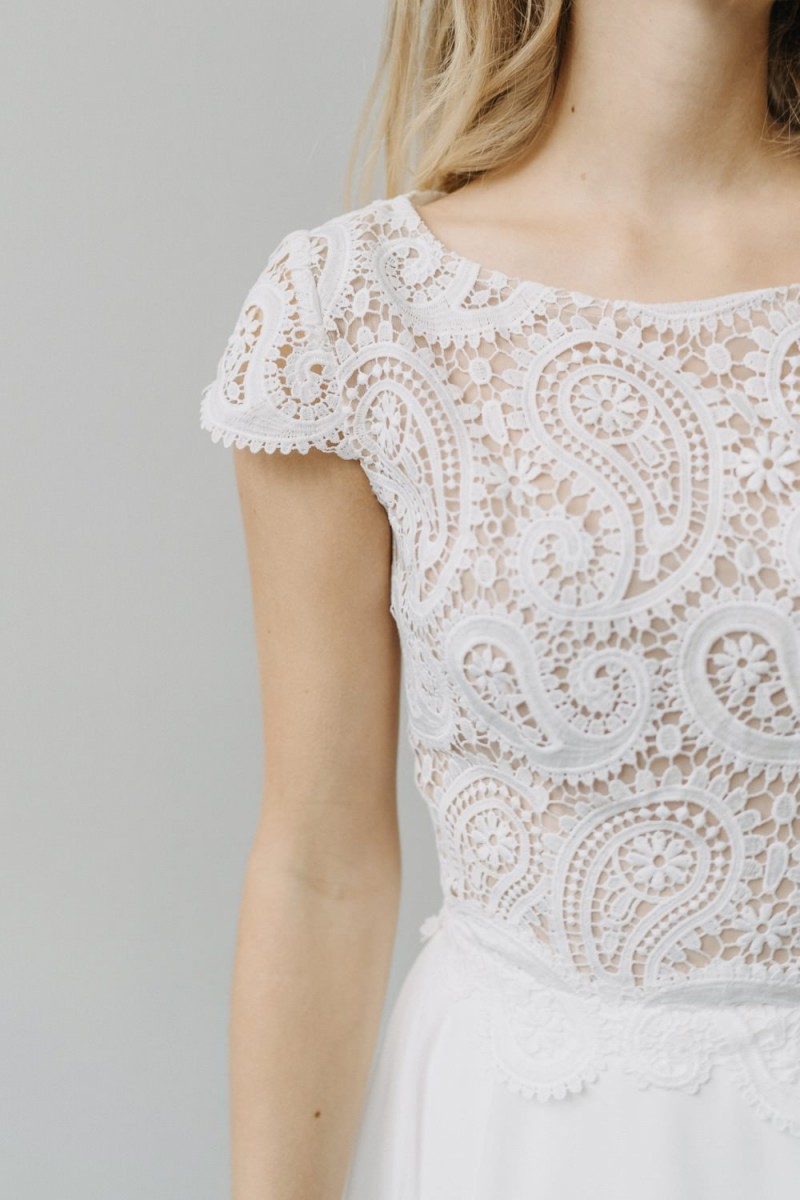 Insgesamt sind vier Standesamtkleider der im Frühjahr veröffentlichten kurzen Brautkleid-Kollektion in die neue Kollektion übernommen worden: Fleur, Dahlia, Lilli und Ivy. Hier lassen sich lange Röcke ganz einfach für die 2-in-1-Brautkleid-Variante anknöpfen oder dauerhaft auswechseln. Darüber hinaus gibt es fünf verschiedene Röcke, eine Hose und zwei Hosenröcke in variantenreichen Schnitten, die sich mit acht Oberteilen zu Standesamt- und Hochzeits-Outfits kombinieren lassen. On top hat die Designerin zwei Jumpsuits für die urbane Braut kreiert. Im Zentrum stehen leichte Stoffe wie Chiffon, Tüll, Organza, Viskose und Jersey – die Oberteile begeistern mit raffinierten Spitzen von modern bis romantisch-verspielt.