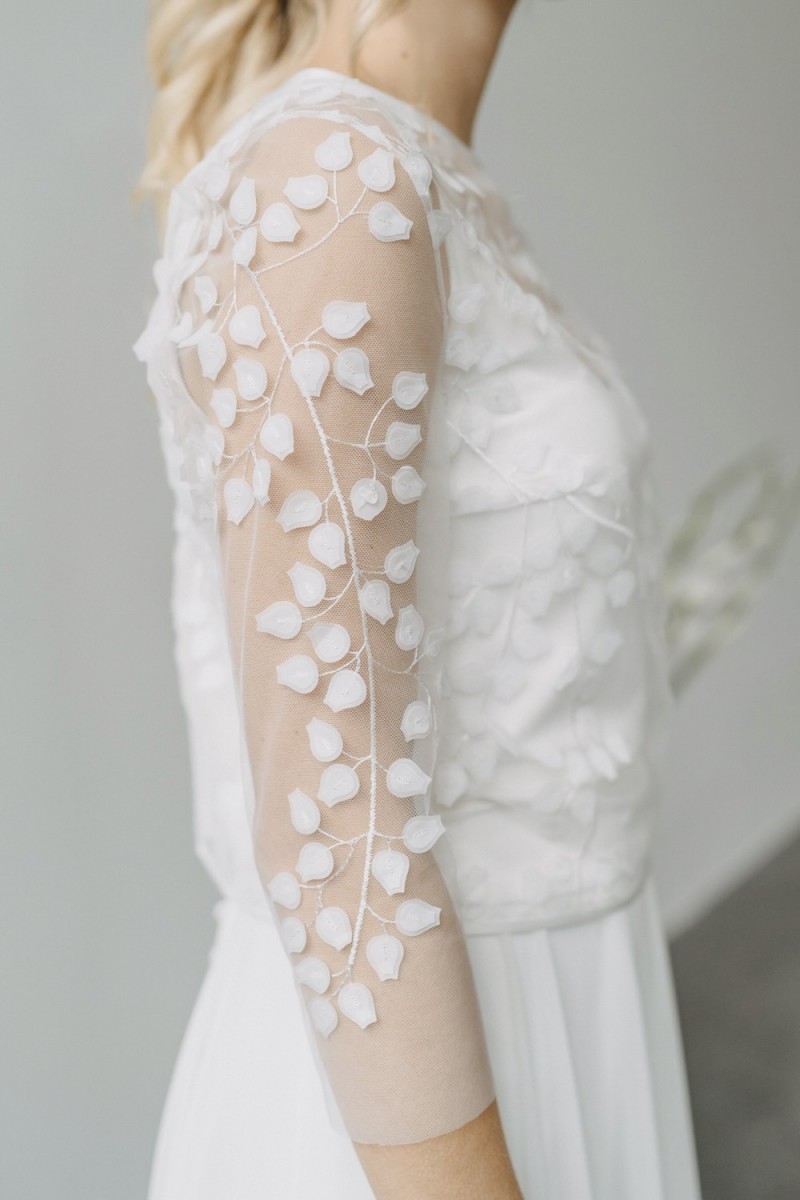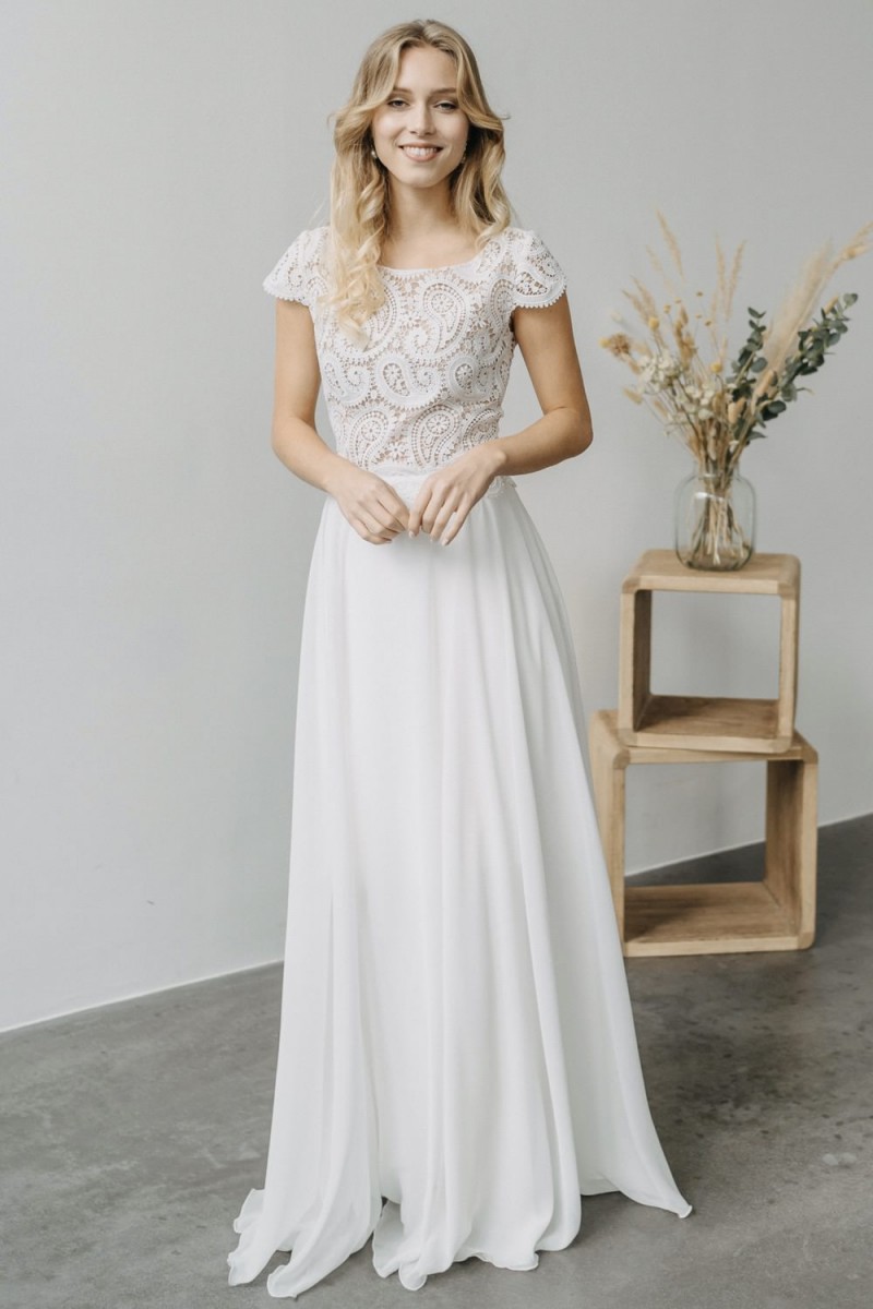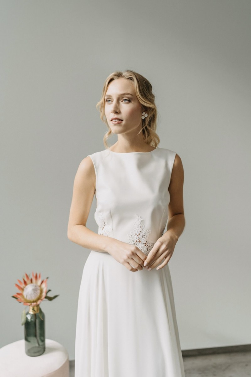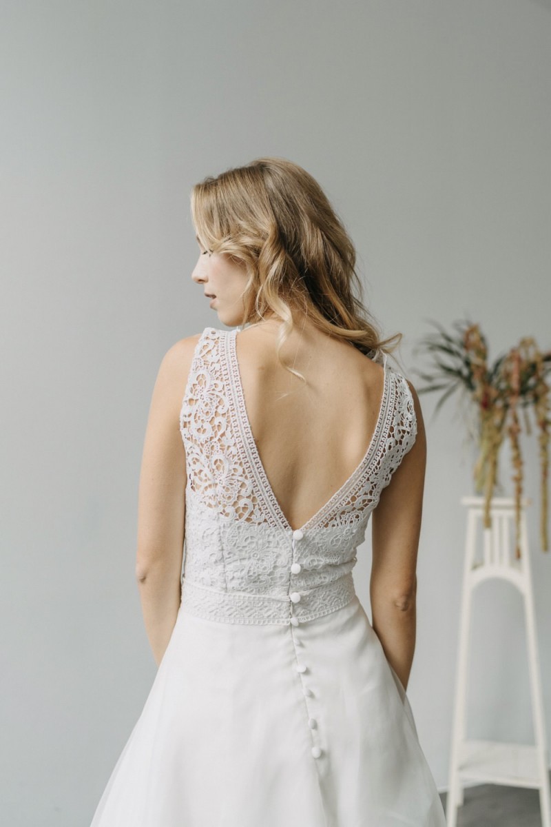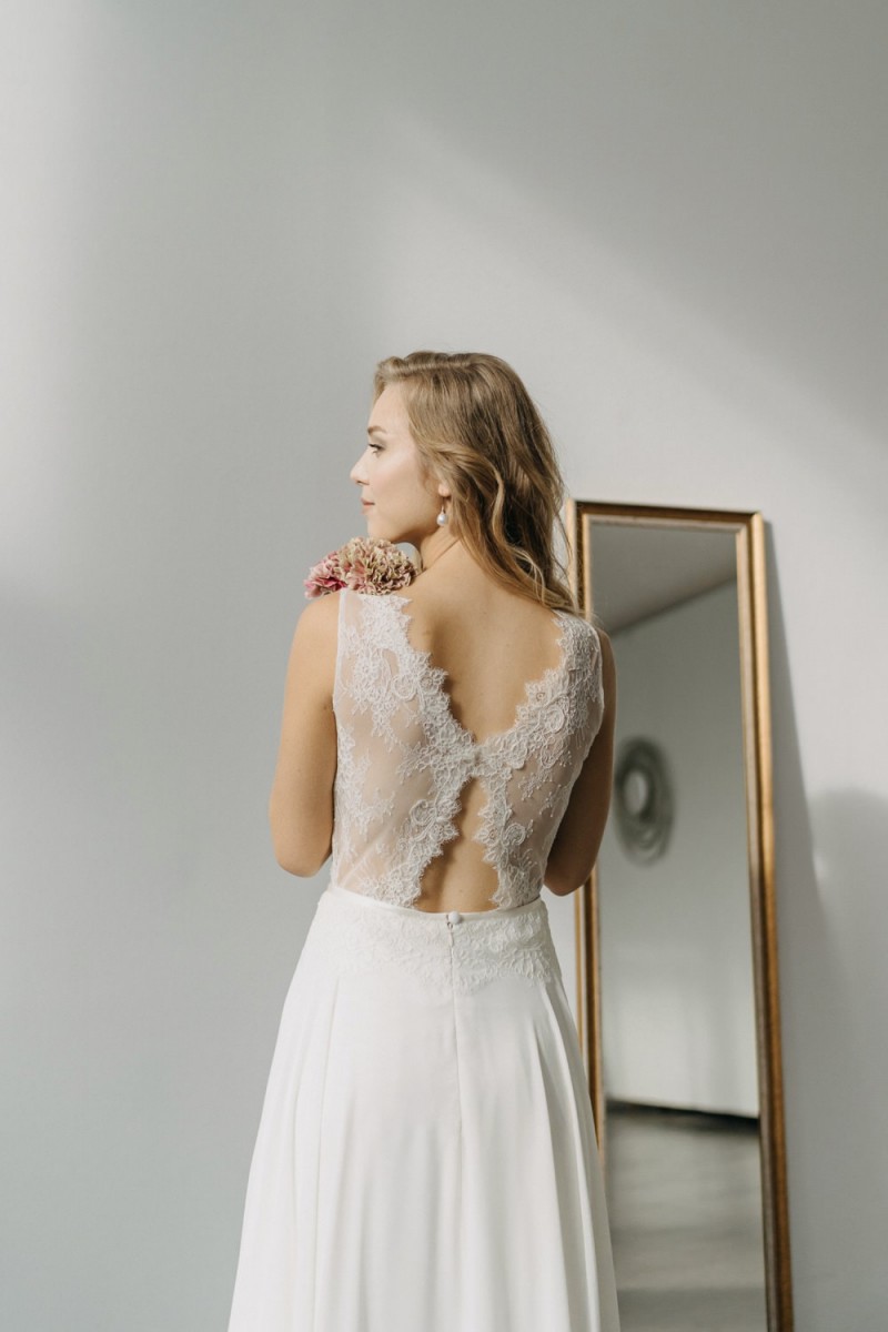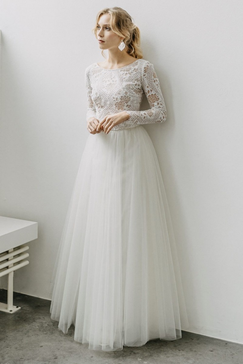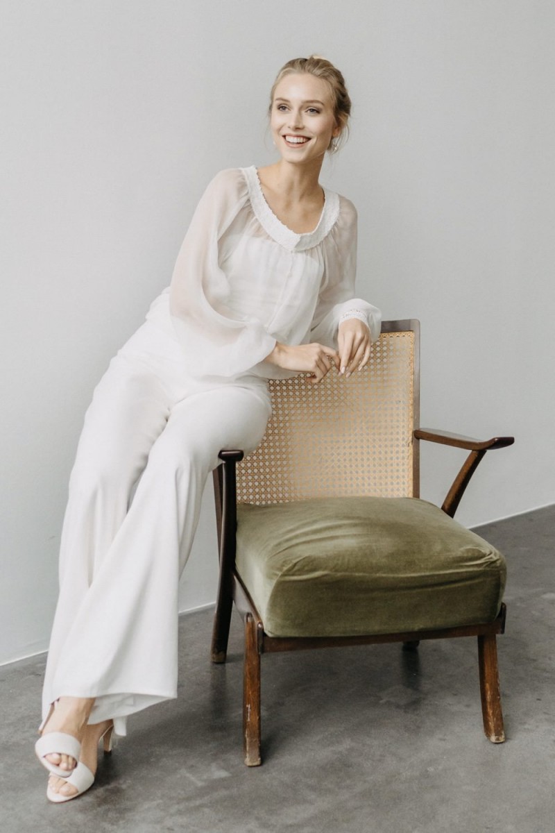 Insgesamt sind vier Standesamtkleider der im Frühjahr veröffentlichten kurzen Brautkleid-Kollektion in die neue Kollektion übernommen worden: Fleur, Dahlia, Lilli und Ivy. Hier lassen sich lange Röcke ganz einfach für die 2-in-1-Brautkleid-Variante anknöpfen oder dauerhaft auswechseln. Darüber hinaus gibt es fünf verschiedene Röcke, eine Hose und zwei Hosenröcke in variantenreichen Schnitten, die sich mit acht Oberteilen zu Standesamt- und Hochzeits-Outfits kombinieren lassen. On top hat die Designerin zwei Jumpsuits für die urbane Braut kreiert. Im Zentrum stehen leichte Stoffe wie Chiffon, Tüll, Organza, Viskose und Jersey – die Oberteile begeistern mit raffinierten Spitzen von modern bis romantisch-verspielt.