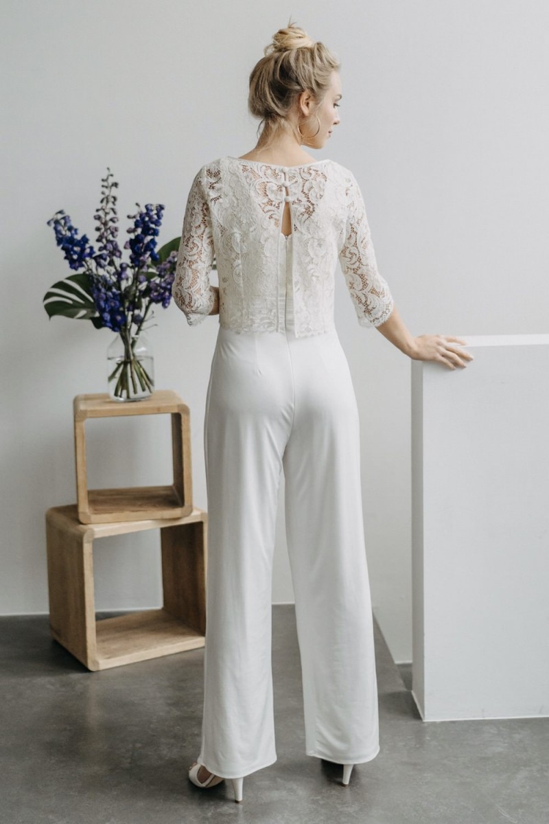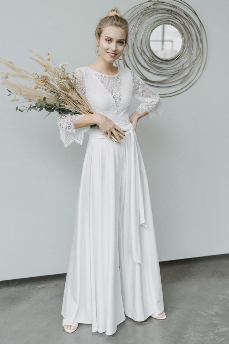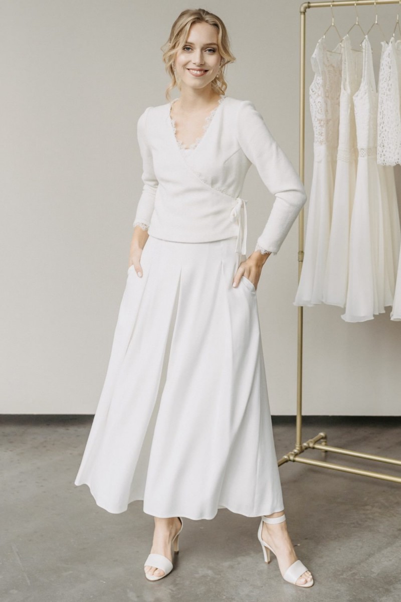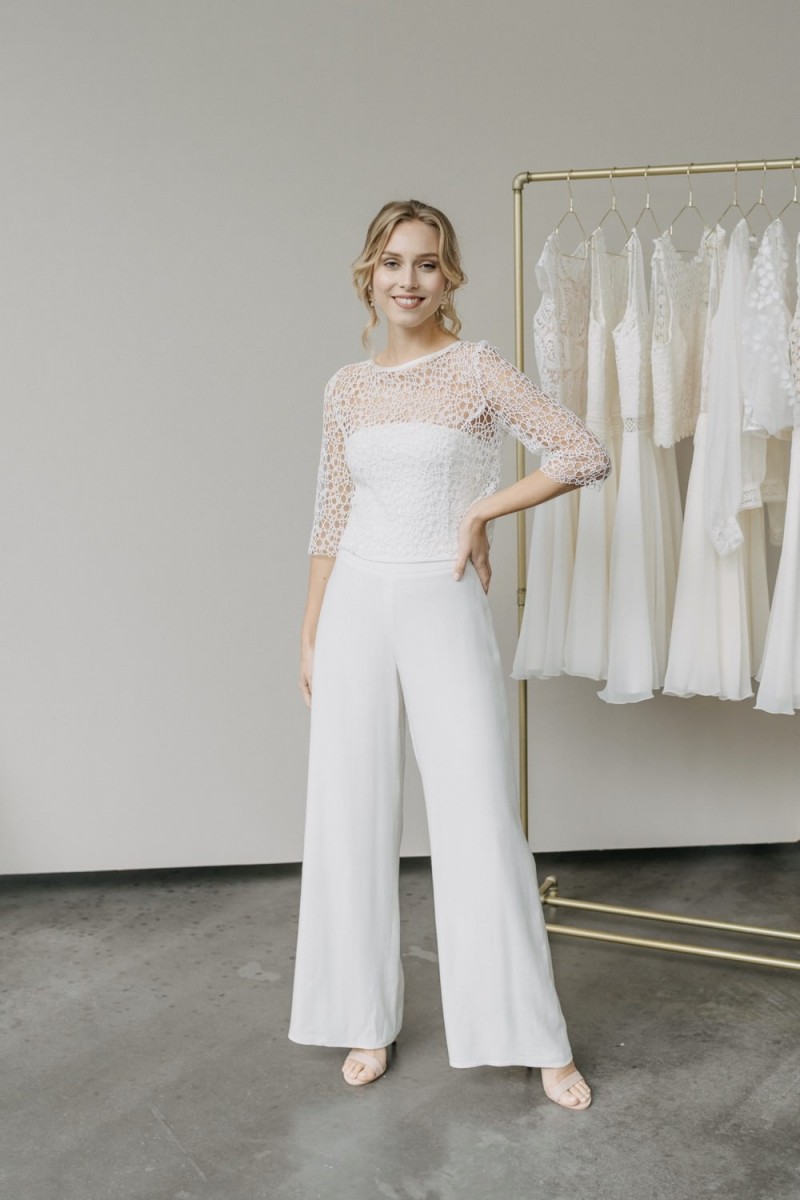 Viele Bräute wünschen sich, dass die standesamtliche Hochzeit etwas Besonderes ist, da sie zurzeit nicht wissen, wann ihre große Hochzeitsfeier stattfinden kann. Mit Elementen der „Metamorphose“-Brautmodenkollektion können Bräute in einem wunderschönen Standesamtkleid oder -Outfit mit Hose heiraten, das sich dann später ganz leicht durch Kombination mit einem langen Rock in ein Brautkleid mit Wow-Effekt für die kirchliche oder freie Trauung verwandeln lässt.