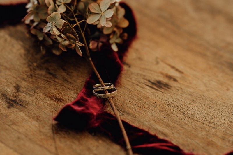 Das süße Brautpaar, das uns in dieser Inspiration um den Finger wickelt, heißt Claudia & Michael. Sie, mit offenem Haar und unglaublich aufregendem Makeup – gestylt von Steffi Hausberger – und in einem tollen Brautkleid von elfenkleid, schmeißt sich ganz cool ihre Lederjacke über die Schultern für diesen Tag. Ihr zarter Schmuck, im Übrigen bestehend aus recyceltem Gold, aus der Goldschmiede Pinter und das kräftige Makeup machen ihren coolen Look dennoch glamourös. Er trägt einen sehr eleganten Anzug in Schwarz mit einem Jackett aus dunkelrotem Samt. Die ausschließlich schwarzen Details zu diesem, machen daraus einen sehr coolen Look, der unglaublich gut zu den Moody Boho Glam Vibes passen.