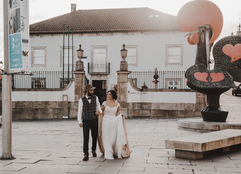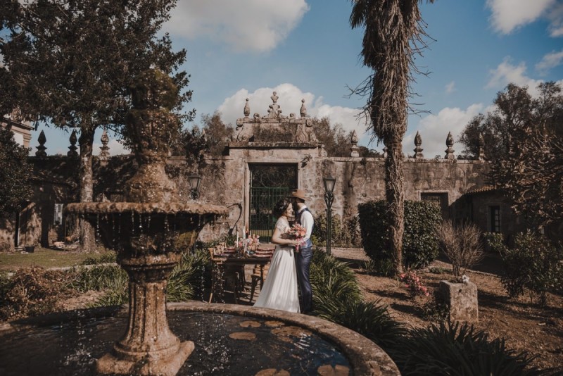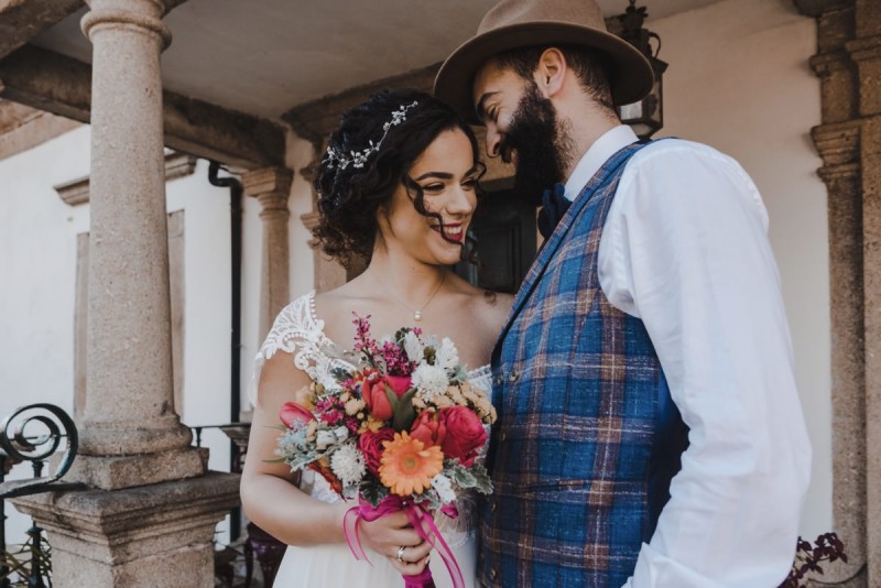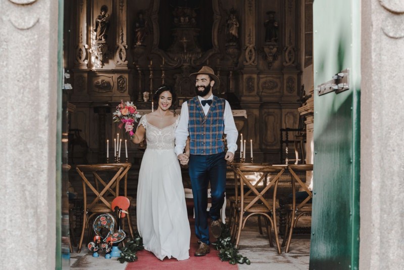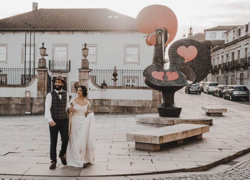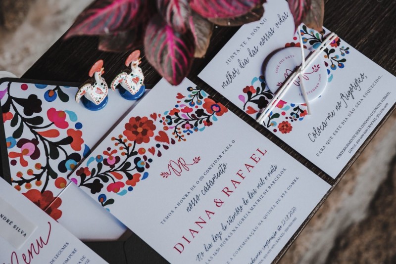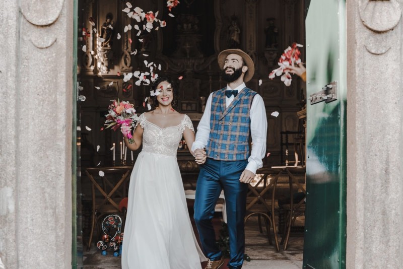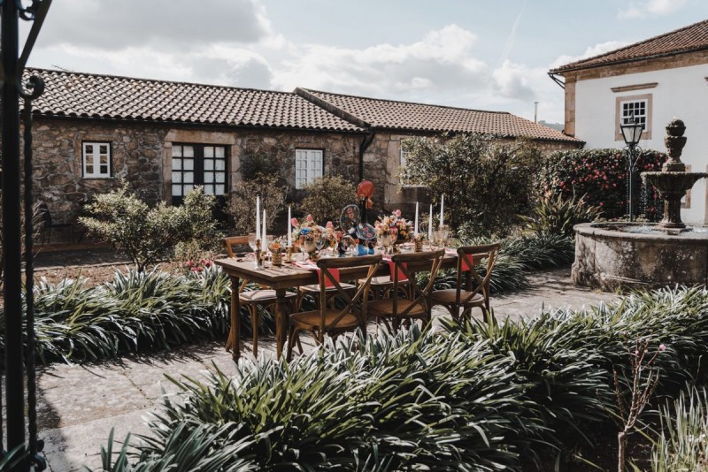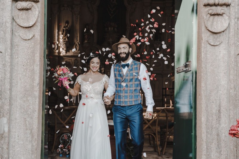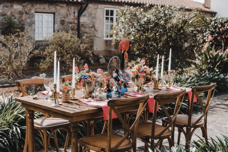 Oh du schönes Portugal! Ein weiteres Mal dürfen wir uns auf den Weg in dieses sonnenverwöhnte Land machen. Für diese wunderschöne Inspiration einer Sommerhochzeit ging es in eine kleine Gemeinde namens Várzea, welches zum Kreis Barcelos gehört. Der portugiesischen Stadt Barcelos, im Norden Portugals, entstand eine besondere Legende, welche das Herzstück dieser Inspiration wurde. ‚O Galo de barcelos‘ (auf Deutsch ‚Hahn aus Barcelos‘), die Legende des Hahns wurde bei dieser Inspiration ganz bezaubernd inszeniert und einer alten Tradition wurde neues Leben eingehaucht! In der Finca Quinta de Santa Comba, erbaut im 18. Jahrhundert und ein Traum von rustikalem Charm, fand dieses Styled Shoot statt, welches, konzeptionalisiert und geplant von Coração Português Wedding Planer, von Hochzeitsfotografin Evelina Galinis fotografisch für uns festgehalten wurde. Der Innenhof der Finca hat es mir ganz besonders angetan. Hier wurde, zwischen grünen Pflanzen, alten Steinen und einem zauberhaften alten Brunnen, die Hochzeitsfeier kreiert. Durch das schöne Mobiliar von O Saltimbanco, und die farbenfrohe Dekoration und Floristik von Real Sonho Event Planning, entsteht ein rustikales Farbspektakel. Perfekt für eine sommerliche Hochzeit, bei der bis in den frühen Morgen gefeiert, getanzt und gelacht wird! Natürlich mit direktem Bezug zum traditionellen Hahn. Die Hochzeitspapeterie wurde ebenfalls von Real Sonho Event Planning kreiert. Mit ihrer modernen Inszenierung des folkloristischen Musters gibt sie bereits einen wunderbaren Vorgeschmack auf diese sommerliche sowie farbintensive Hochzeit. Diese finden sich übrigens auch auf der zauberhaften Hochzeitstorte von Nice Cakes. Elegantes Weiß, feine bunte Details und zwei kleine Hähne, treffen bei diesem zweistöckigem Exemplar auf einen opulenten Caketopper aus Blumen! Ein weiteres Highlight der Location ist die alte Kapelle, in der das hübsche Brautpaar eine kleine aber feine Trauzeremonie zelebrieren durfte. Das süße Brautpaar dieser Inspiration, das sind Diana & Victor. Diana trägt hier ein wirklich bezauberndes Brautkleid mit grober Spitze und fließendem Rock von O Sonho de Cinderela. Sie kreierten ebenfalls ihr feines Hairstyling, das einfach perfekt zu einer langen Sommernacht passt. Zu diesem locker gebundenen Look, samt feinen Bridalheadpiece von Qurivesaria Milhazes, zauberte ihr Alexandra Castro ein ausdruckstarkes Makeup, das, perfekt passend zum bunten Brautstrauß, ihr Temperament unterstreicht. Kein Wunder, dass ihr Bräutigam Victor, in seinem lässigen Bräutigam Outfit von Don Lopo Concept Store, nicht mehr aufhören konnte zu strahlen! Zu späterer Stunde ging es für die beiden noch durch die kleinen Gassen der Innenstadt. Malerisch wie ich finde! Hier wurde eine wirklich besondere Hochzeitsinspiration geschaffen! Mit viel Liebe zum Detail und besonders zur Tradition, wurde hier eine Sommerhochzeit inszeniert, die man sich in Zeiten von Corona sogar nach Hause holen kann!