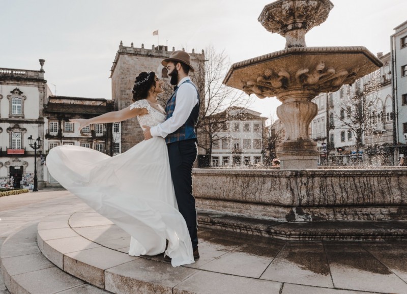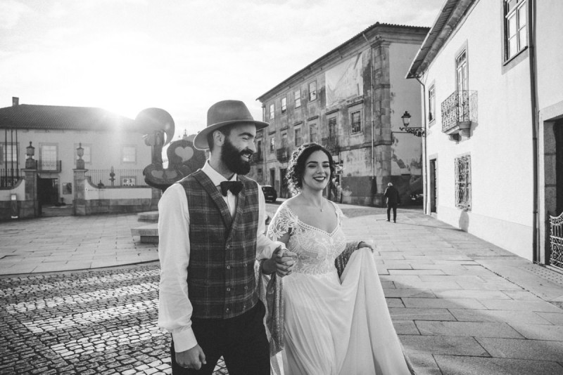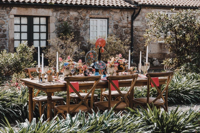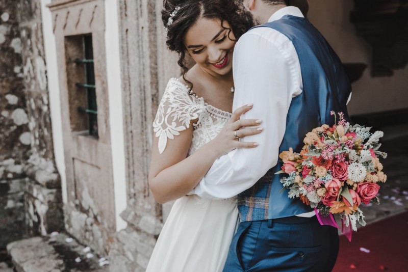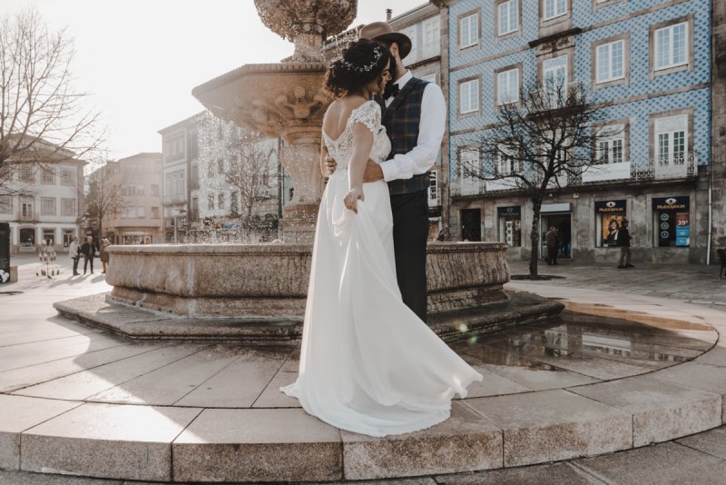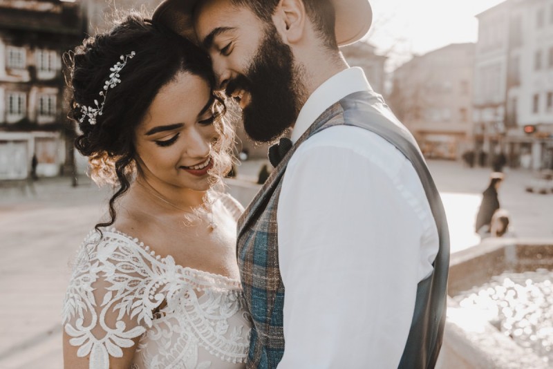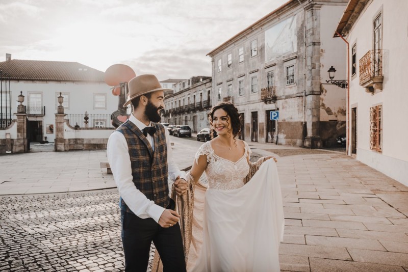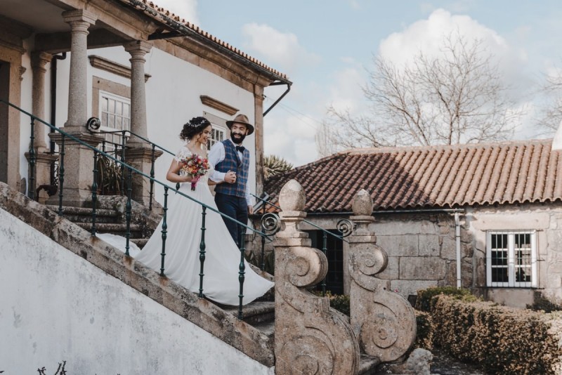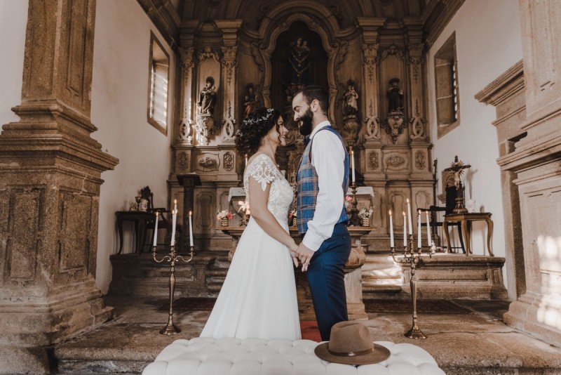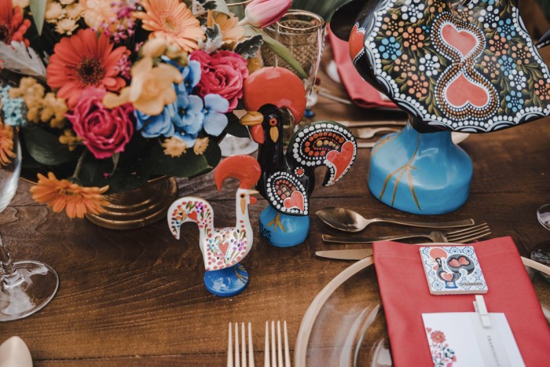 Oh du schönes Portugal! Ein weiteres Mal dürfen wir uns auf den Weg in dieses sonnenverwöhnte Land machen. Für diese wunderschöne Inspiration einer Sommerhochzeit ging es in eine kleine Gemeinde namens Várzea, welches zum Kreis Barcelos gehört. Der portugiesischen Stadt Barcelos, im Norden Portugals, entstand eine besondere Legende, welche das Herzstück dieser Inspiration wurde. ‚O Galo de barcelos‘ (auf Deutsch ‚Hahn aus Barcelos‘), die Legende des Hahns wurde bei dieser Inspiration ganz bezaubernd inszeniert und einer alten Tradition wurde neues Leben eingehaucht! In der Finca Quinta de Santa Comba, erbaut im 18. Jahrhundert und ein Traum von rustikalem Charm, fand dieses Styled Shoot statt, welches, konzeptionalisiert und geplant von Coração Português Wedding Planer, von Hochzeitsfotografin Evelina Galinis fotografisch für uns festgehalten wurde. Der Innenhof der Finca hat es mir ganz besonders angetan. Hier wurde, zwischen grünen Pflanzen, alten Steinen und einem zauberhaften alten Brunnen, die Hochzeitsfeier kreiert. Durch das schöne Mobiliar von O Saltimbanco, und die farbenfrohe Dekoration und Floristik von Real Sonho Event Planning, entsteht ein rustikales Farbspektakel. Perfekt für eine sommerliche Hochzeit, bei der bis in den frühen Morgen gefeiert, getanzt und gelacht wird! Natürlich mit direktem Bezug zum traditionellen Hahn. Die Hochzeitspapeterie wurde ebenfalls von Real Sonho Event Planning kreiert. Mit ihrer modernen Inszenierung des folkloristischen Musters gibt sie bereits einen wunderbaren Vorgeschmack auf diese sommerliche sowie farbintensive Hochzeit. Diese finden sich übrigens auch auf der zauberhaften Hochzeitstorte von Nice Cakes. Elegantes Weiß, feine bunte Details und zwei kleine Hähne, treffen bei diesem zweistöckigem Exemplar auf einen opulenten Caketopper aus Blumen! Ein weiteres Highlight der Location ist die alte Kapelle, in der das hübsche Brautpaar eine kleine aber feine Trauzeremonie zelebrieren durfte. Das süße Brautpaar dieser Inspiration, das sind Diana & Victor. Diana trägt hier ein wirklich bezauberndes Brautkleid mit grober Spitze und fließendem Rock von O Sonho de Cinderela. Sie kreierten ebenfalls ihr feines Hairstyling, das einfach perfekt zu einer langen Sommernacht passt. Zu diesem locker gebundenen Look, samt feinen Bridalheadpiece von Qurivesaria Milhazes, zauberte ihr Alexandra Castro ein ausdruckstarkes Makeup, das, perfekt passend zum bunten Brautstrauß, ihr Temperament unterstreicht. Kein Wunder, dass ihr Bräutigam Victor, in seinem lässigen Bräutigam Outfit von Don Lopo Concept Store, nicht mehr aufhören konnte zu strahlen! Zu späterer Stunde ging es für die beiden noch durch die kleinen Gassen der Innenstadt. Malerisch wie ich finde! Hier wurde eine wirklich besondere Hochzeitsinspiration geschaffen! Mit viel Liebe zum Detail und besonders zur Tradition, wurde hier eine Sommerhochzeit inszeniert, die man sich in Zeiten von Corona sogar nach Hause holen kann!