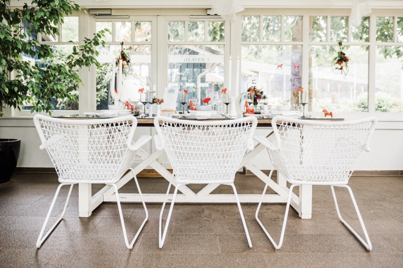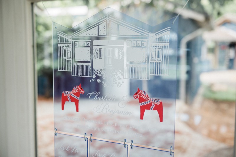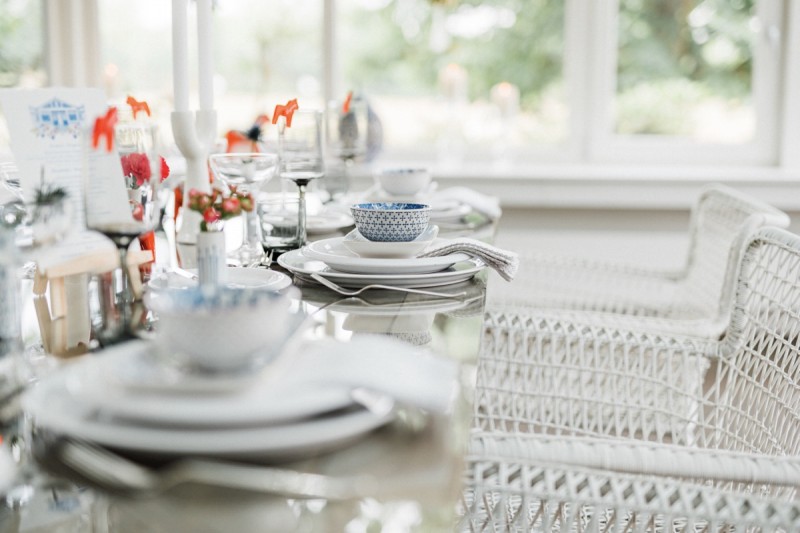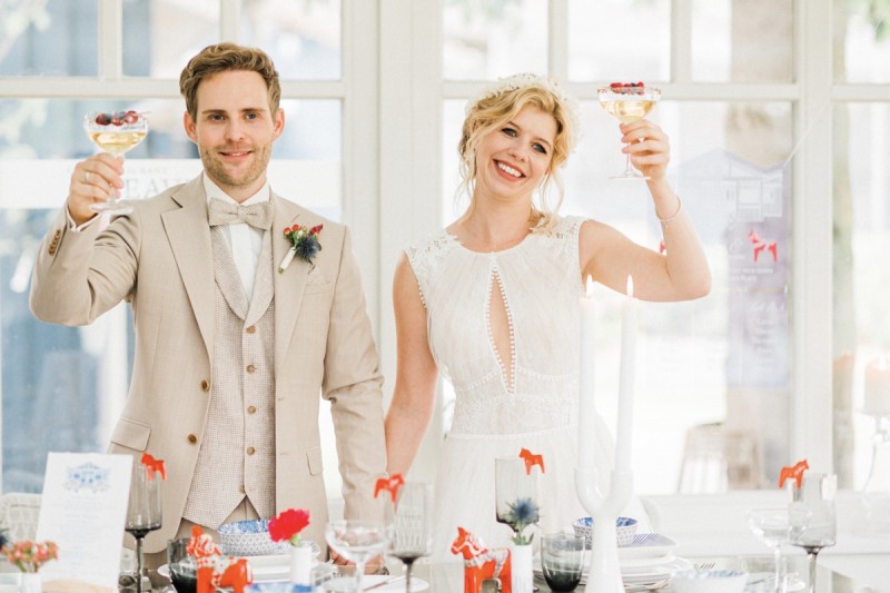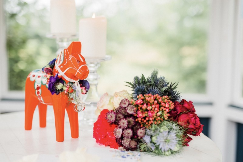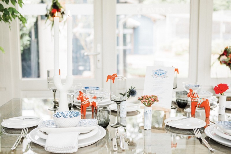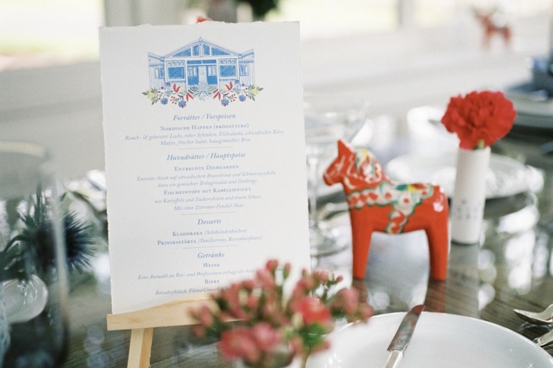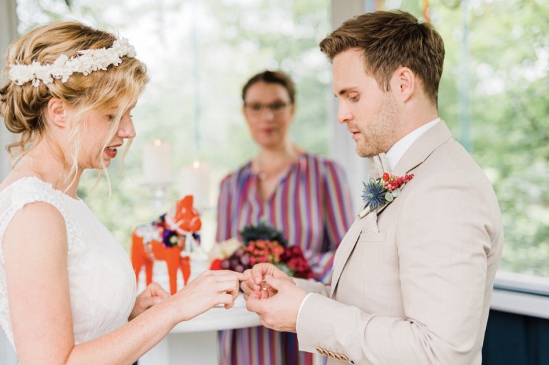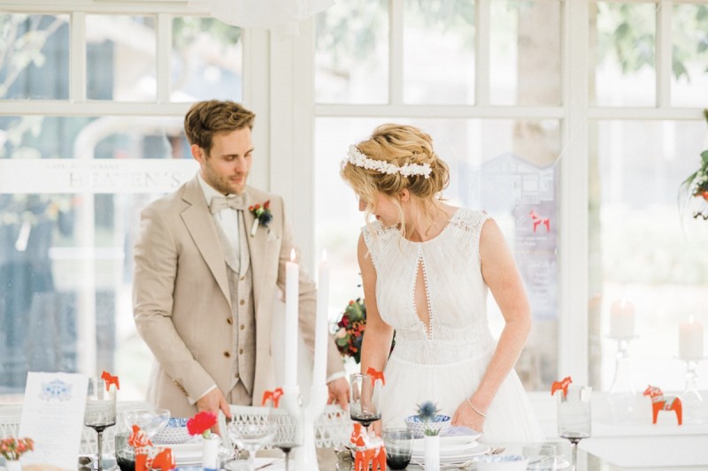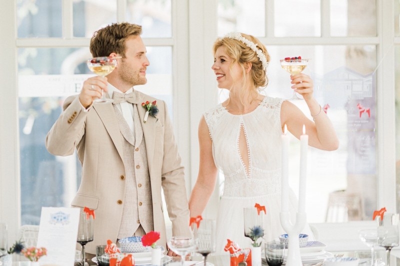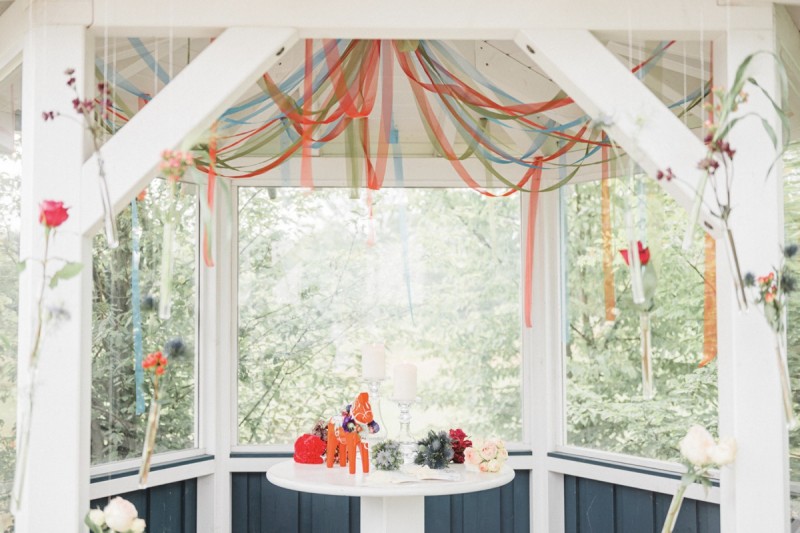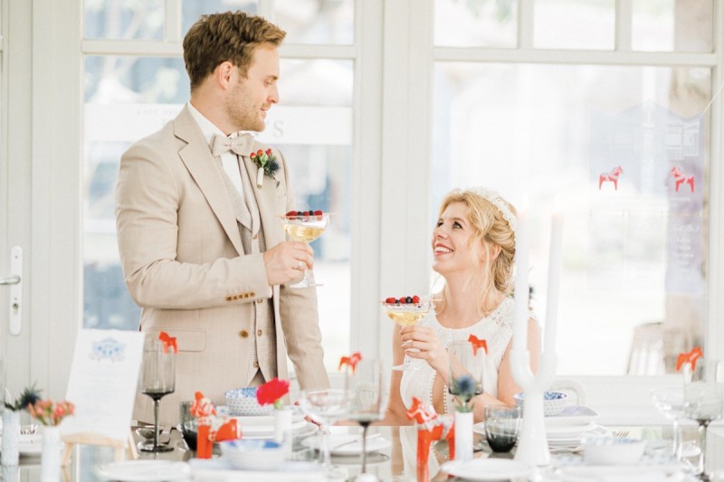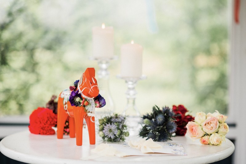 Eine Sommerhochzeit wie im schönen Skandinavien. Ein Land das für seine Natürlichkeit und seine Lebensfreude bekannt ist. Für diese Hochzeitsinspiration, einer Sommerhochzeit im skandinavischen Stil, wurden die schönsten Rituale und Bräuche Skandinaviens mit Leichtigkeit und Eleganz versehen. Farbenfroh zeigt sich hier der liebevolle Folklorestil, der in allen Farben Lebensfreude ruft. Mit Bedacht auf schlichte Details, erhält diese Inspiration einen modernen und leichten Touch, der es ermöglicht, dieses Konzept für jedermann zugänglich zu machen. Kreiert von Hochzeitsfotografin Heike Moellers, die selbstverständlich auch den fotogarfischen Part übernahm, und Hochzeitsplanerin Elke Nehring von First Weddingplanner, die zudem das Styling und die Dekoration dieser Inspiration zauberte, finden wir uns hier im schönen Restaurant Heavens wieder, das in einer blauen Holzhütte beheimatet, direkt an Skandinavien erinnert. Die Freie Trauung fand in einem schnuckeligen Pavillon statt. Geschmückt wurde dieser von Event Floristik Barion mit bunten Bändern im Inneren und im Außenbereich mit kleinen, hängenden Reagenzgläsern, die mit einzelnen Schnittblumen versehen wurden. Hier hielt Traurednerin Anja von Goldröschen eine freie Trauzeremonie für das süße Brautpaar, für die sie sich ein ganz besonderes Blumenritual überlegt hatte. Bezogen auf einen schwedischen Midsommer Mythos, gibt es sieben unterschiedliche Blumensträußchen. Jeder steht für einen besonderen Wunsch des Brautpaares. Diese werden nach und nach zu einem Strauß durch das Brautpaar selbst zusammengebunden um so die eigene Zukunft untrennbar zu vereinen. Die Ringe der beiden, die im Anschluss an dieses Trauritual getauscht wurden, warteten die Zeremonie über auf einem Dala Pferdchen, das hier als besonderes Ringkissen herhalten durfte. Dieses könnt ihr in dieser Inspiration sehr oft entdecken! Zum Beispiel in Kombination mit der farbenfrohen und detailverliebten Hochzeitspapeterie von Fanfare Paper Goods. Oder auch in der schönen Dekoration der Location für die anschließende Hochzeitsfeier. In Anlehnung an einen uralten viktorianischen Brauch, kreierte First Weddingplanner die Tischdekoration mit etwas Altem, Neuem, Blauem und Geliehenem. Damit niemand sein Glas vertauschte, fanden sich kleine Plexiglas Dala Pferchen mit dem jeweiligen Namen auf dem Weinglas. Passend dazu der Sitzplan mit einem Logo der Einladungskarte: eine Skizze der Location gedruckt und gefräst von Pimp Your Wedding. Auch der Sweet Table dieser Inspiration ist etwas anders gestaltet. Neben einer wunderschönen, blumengeschmückten Hochzeitstorte und dazu passenden Cupcakes und Cookie Cups von Cook & Cookies, gibt es hier eine Fülle von frischen Früchten. Natürlich sind auch die Blumen auf der Cremetorte essbar. So wie das erfrischende Infused Water ist alles hier zu entdeckende leicht und fruchtig. Perfekt für eine heiße Sommerhochzeit! Das süße Brautpaar, das hier mit ganz viel Natürlichkeit durch den Tag strahlt, hat diesen schönen Tag ganz offensichtlich mehr als genossen. Die Braut trug, passend zu den leichten Sommervibes, eine dezente Flower Crown in Weiß zu ihrem zarten Brautkleid von Gala Suknie Ślubne. Beides stellte das Hochzeitshaus Struck, sowie im Übrigen auch den hellen Anzug, samt Weste, des Bräutigams. Der Brautsalon kreierte der hübschen Braut zu ihrem fließenden Brautkleid und ihrem Blumenhaarschmuck ein ausdrucksstarkes Makeup und einen lockeren Dutt, die ihre natürliche Schönheit unterstrichen. So tanzten die beiden durch diese tolle Hochzeitsinspiration. Und auch ihr dürft es nun dem Brautpaar gleich tun und all die schönen Details dieser Inspiration einer skandinavischen Sommerhochzeit genießen! Ganz viel Freude euch!