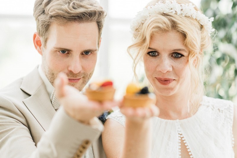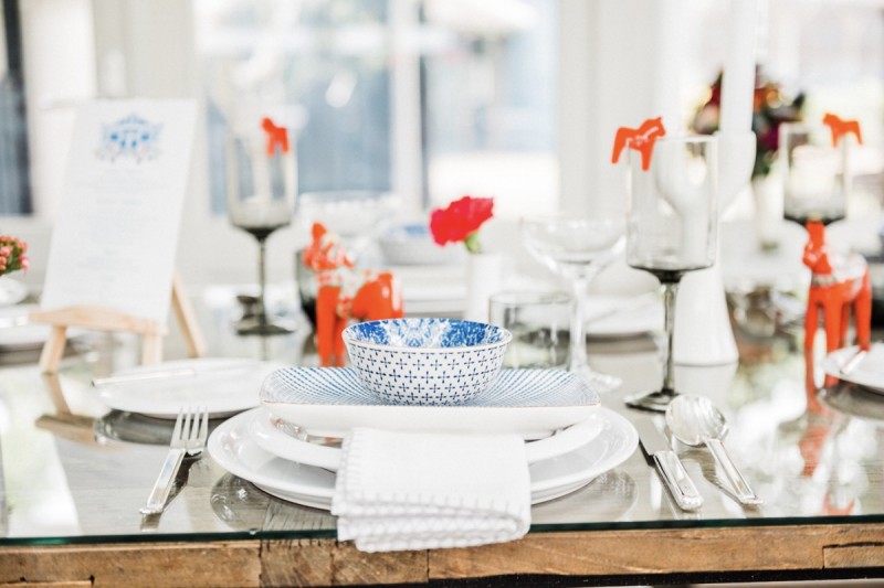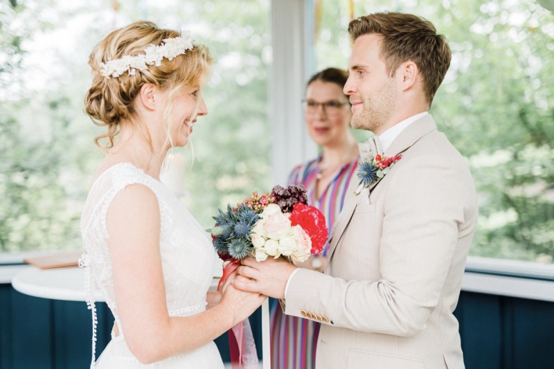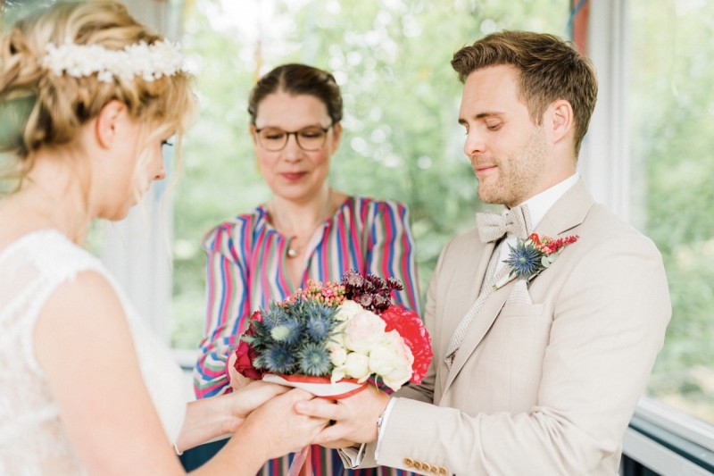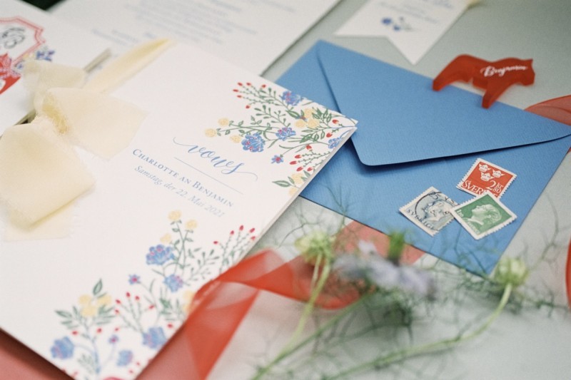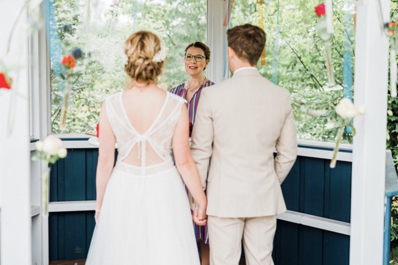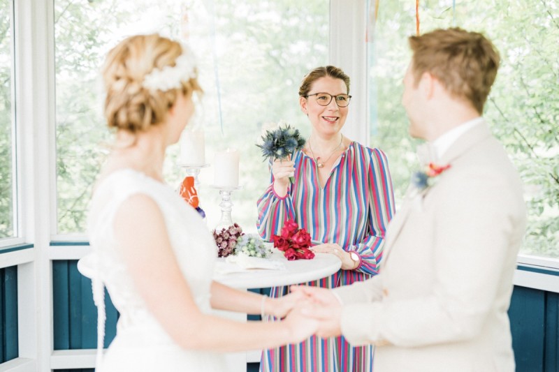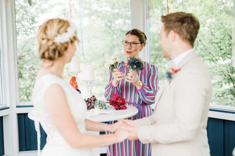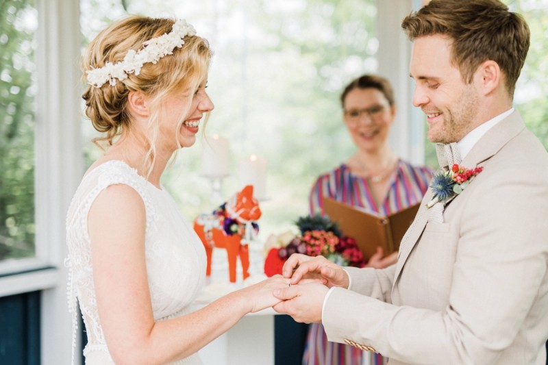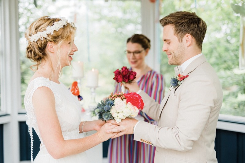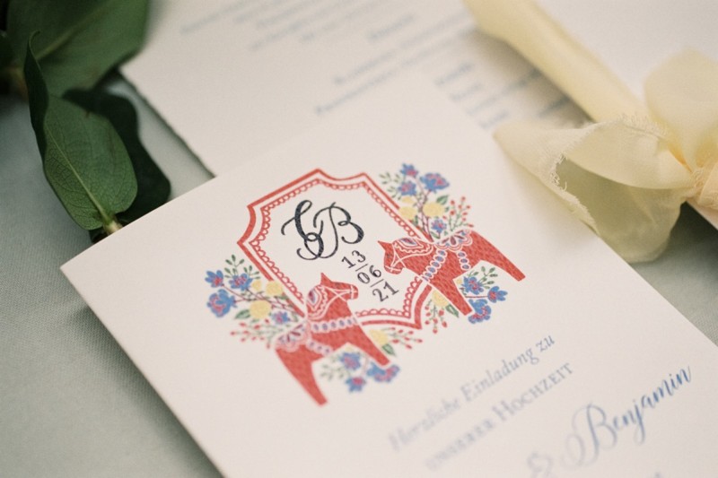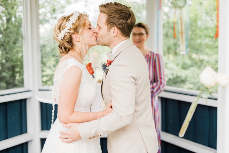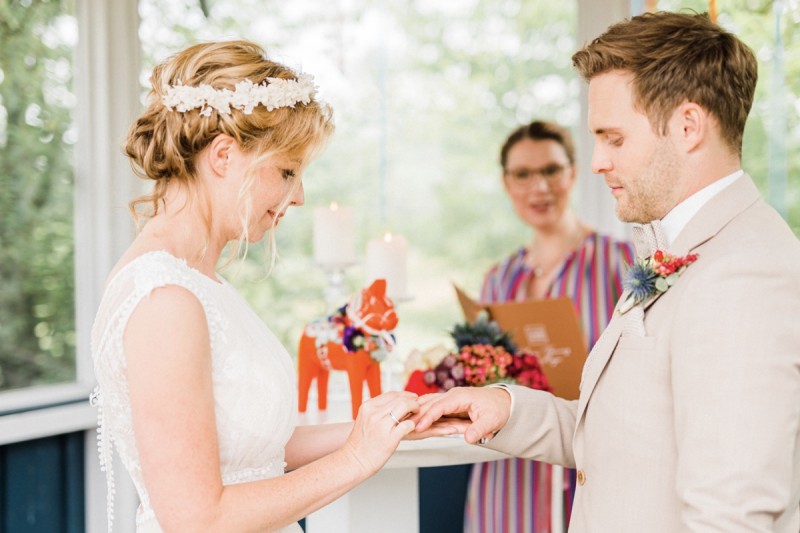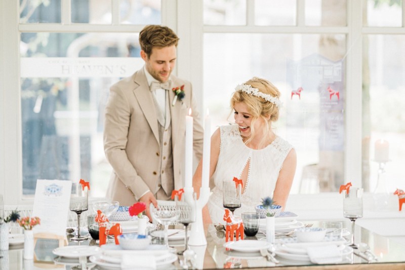 Eine Sommerhochzeit wie im schönen Skandinavien. Ein Land das für seine Natürlichkeit und seine Lebensfreude bekannt ist. Für diese Hochzeitsinspiration, einer Sommerhochzeit im skandinavischen Stil, wurden die schönsten Rituale und Bräuche Skandinaviens mit Leichtigkeit und Eleganz versehen. Farbenfroh zeigt sich hier der liebevolle Folklorestil, der in allen Farben Lebensfreude ruft. Mit Bedacht auf schlichte Details, erhält diese Inspiration einen modernen und leichten Touch, der es ermöglicht, dieses Konzept für jedermann zugänglich zu machen. Kreiert von Hochzeitsfotografin Heike Moellers, die selbstverständlich auch den fotogarfischen Part übernahm, und Hochzeitsplanerin Elke Nehring von First Weddingplanner, die zudem das Styling und die Dekoration dieser Inspiration zauberte, finden wir uns hier im schönen Restaurant Heavens wieder, das in einer blauen Holzhütte beheimatet, direkt an Skandinavien erinnert. Die Freie Trauung fand in einem schnuckeligen Pavillon statt. Geschmückt wurde dieser von Event Floristik Barion mit bunten Bändern im Inneren und im Außenbereich mit kleinen, hängenden Reagenzgläsern, die mit einzelnen Schnittblumen versehen wurden. Hier hielt Traurednerin Anja von Goldröschen eine freie Trauzeremonie für das süße Brautpaar, für die sie sich ein ganz besonderes Blumenritual überlegt hatte. Bezogen auf einen schwedischen Midsommer Mythos, gibt es sieben unterschiedliche Blumensträußchen. Jeder steht für einen besonderen Wunsch des Brautpaares. Diese werden nach und nach zu einem Strauß durch das Brautpaar selbst zusammengebunden um so die eigene Zukunft untrennbar zu vereinen. Die Ringe der beiden, die im Anschluss an dieses Trauritual getauscht wurden, warteten die Zeremonie über auf einem Dala Pferdchen, das hier als besonderes Ringkissen herhalten durfte. Dieses könnt ihr in dieser Inspiration sehr oft entdecken! Zum Beispiel in Kombination mit der farbenfrohen und detailverliebten Hochzeitspapeterie von Fanfare Paper Goods. Oder auch in der schönen Dekoration der Location für die anschließende Hochzeitsfeier. In Anlehnung an einen uralten viktorianischen Brauch, kreierte First Weddingplanner die Tischdekoration mit etwas Altem, Neuem, Blauem und Geliehenem. Damit niemand sein Glas vertauschte, fanden sich kleine Plexiglas Dala Pferchen mit dem jeweiligen Namen auf dem Weinglas. Passend dazu der Sitzplan mit einem Logo der Einladungskarte: eine Skizze der Location gedruckt und gefräst von Pimp Your Wedding. Auch der Sweet Table dieser Inspiration ist etwas anders gestaltet. Neben einer wunderschönen, blumengeschmückten Hochzeitstorte und dazu passenden Cupcakes und Cookie Cups von Cook & Cookies, gibt es hier eine Fülle von frischen Früchten. Natürlich sind auch die Blumen auf der Cremetorte essbar. So wie das erfrischende Infused Water ist alles hier zu entdeckende leicht und fruchtig. Perfekt für eine heiße Sommerhochzeit! Das süße Brautpaar, das hier mit ganz viel Natürlichkeit durch den Tag strahlt, hat diesen schönen Tag ganz offensichtlich mehr als genossen. Die Braut trug, passend zu den leichten Sommervibes, eine dezente Flower Crown in Weiß zu ihrem zarten Brautkleid von Gala Suknie Ślubne. Beides stellte das Hochzeitshaus Struck, sowie im Übrigen auch den hellen Anzug, samt Weste, des Bräutigams. Der Brautsalon kreierte der hübschen Braut zu ihrem fließenden Brautkleid und ihrem Blumenhaarschmuck ein ausdrucksstarkes Makeup und einen lockeren Dutt, die ihre natürliche Schönheit unterstrichen. So tanzten die beiden durch diese tolle Hochzeitsinspiration. Und auch ihr dürft es nun dem Brautpaar gleich tun und all die schönen Details dieser Inspiration einer skandinavischen Sommerhochzeit genießen! Ganz viel Freude euch!