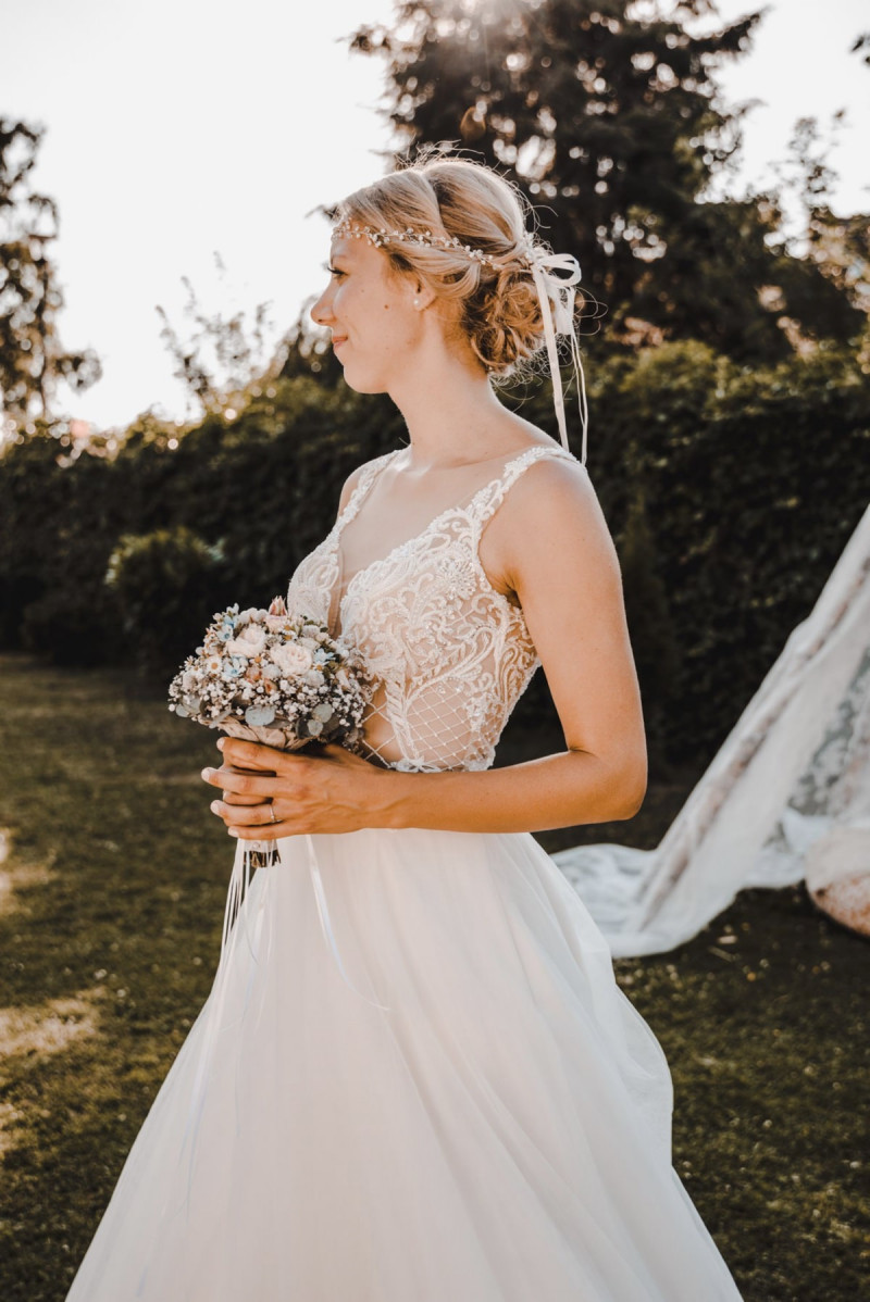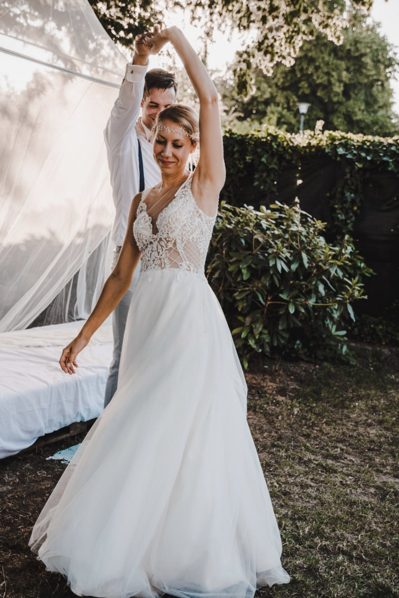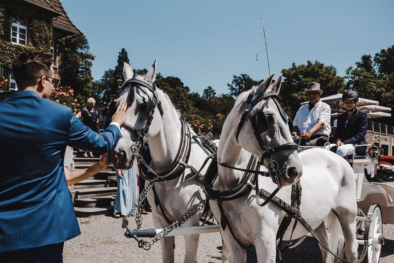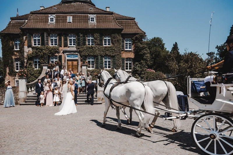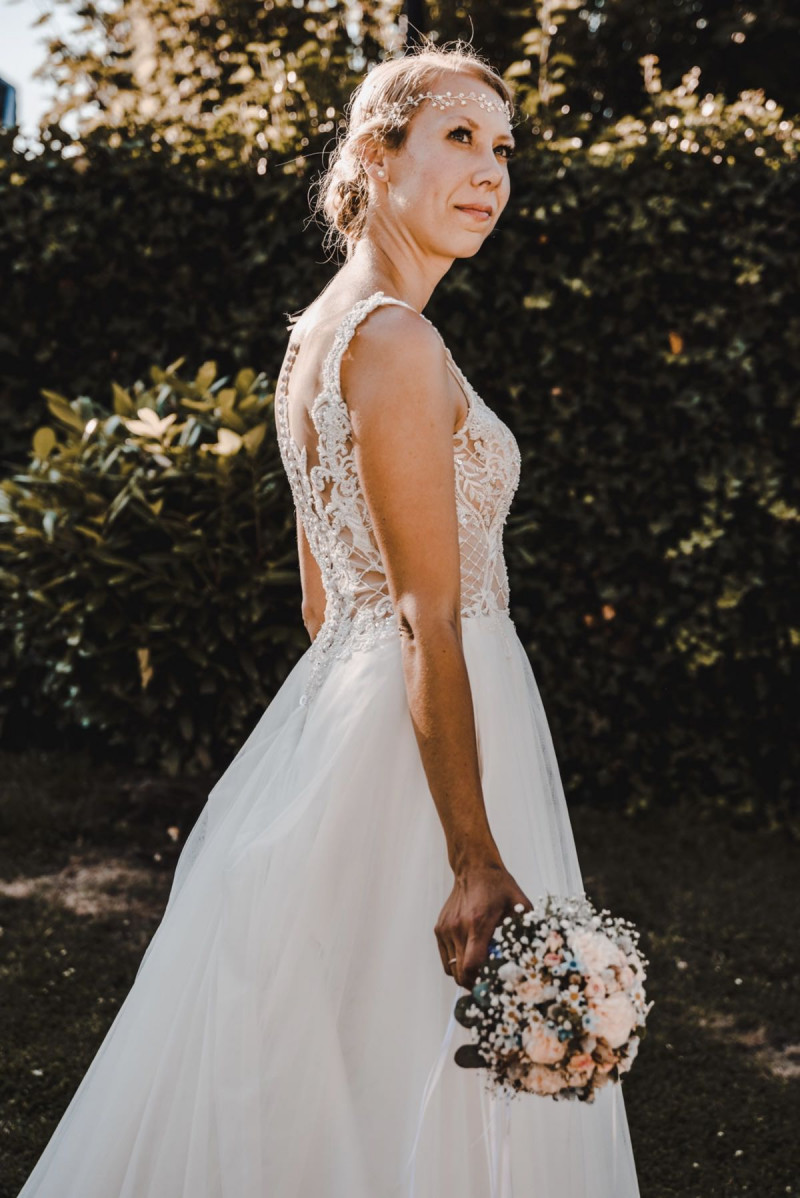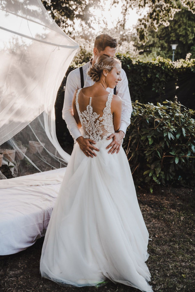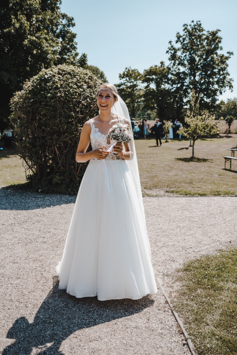 Ich freue mich riesig, euch diese wunderschöne Gartenhochzeit zeigen zu dürfen! Wie der Titel schon verrät, ging es für das Brautpaar Antonia & Alex am 30. Juni diesen Jahres, nach der standesamtlichen Trauung im hübschen Schloss Linnep, mit der Kutsche zur Hochzeitsfeier in den eigenen Garten! Der eigentliche Plan, ganz allein, nur mit den beiden geliebten Hunden, in Österreich am Wasser mit Blick auf die Berge zu heiraten, verflog sofort, als das Brautkleid wie eine Bombe einschlug. “Aber dann verliebte ich mich in mein Kleid. Von da an stand fest, mit so einem Kleid kann man nicht einfach in den See springen und heiraten.” Und so kam es, dass die beiden ihre Planung komplett umschmissen. Das Wichtigste für diesen einmaligen und besonderen Tag? “Wir wollten es für uns!” Der gesamte Tag sollte den beiden gehören und sie absolut glücklich machen. Dies zog sich wie ein roter Faden durch die ganze Planung. Offensichtlich, das absolute Erfolgsrezept! Es war wichtig, dass sich die kleine Hochzeitsgesellschaft und auch die liebevollen Dienstleister wohl fühlten. Jeder Gast war von ganzem Herzen gewünscht und trug seinen Beitrag zu dieser ganz besonderen Feier bei. Es war laut, lustig und ausgelassen! “Es war großartig!” Ich finde, die beiden haben einen Garten Eden geschaffen, in dem Liebe zu wirklicher Perfektion führt. Denn die liebevolle, kreative und detailverliebte Planung und Arbeit aller Beteiligten, führt zu eben diesem wunderschönen Tag! Eine absolut grandiose Hochzeitsinspiration für die Hochzeitsfeier im eigenen Garten oder im Grünen!