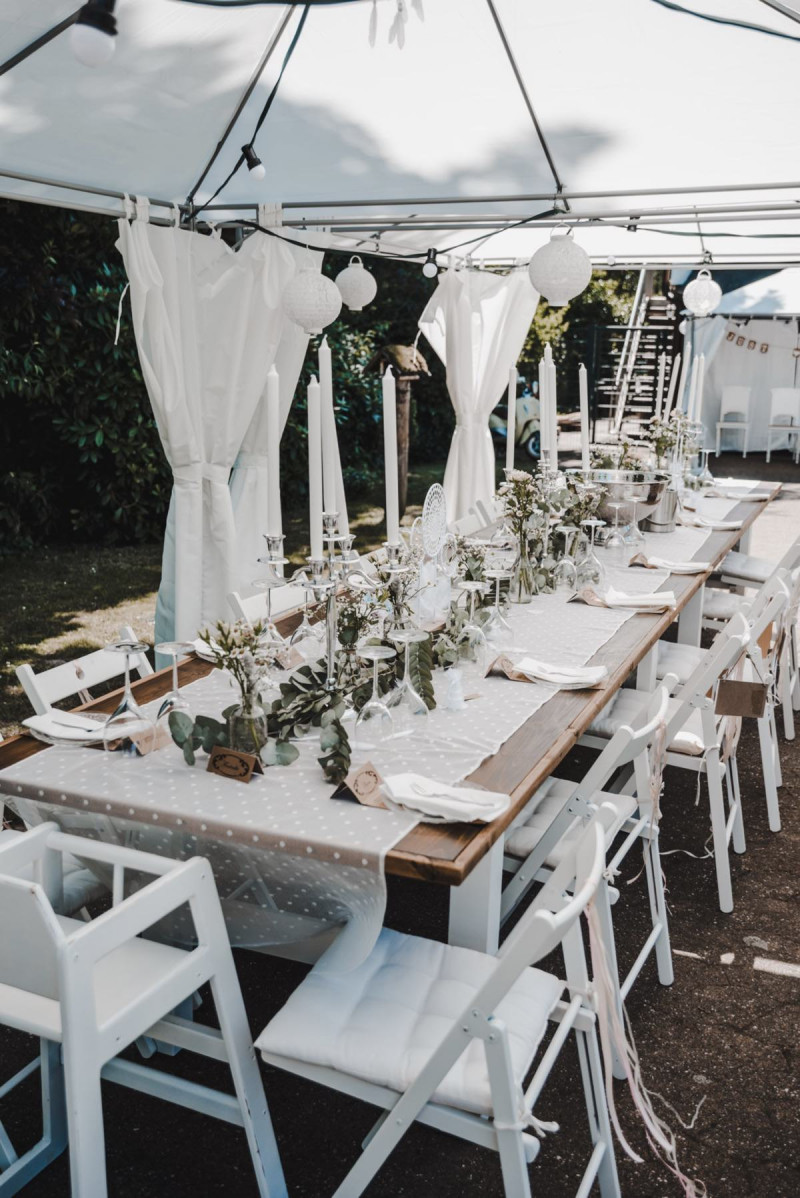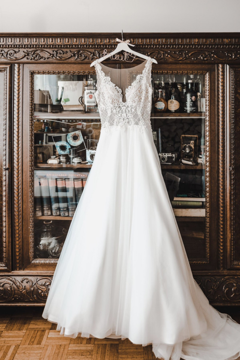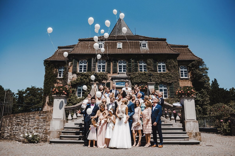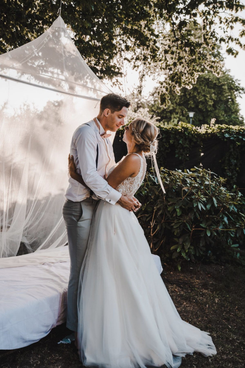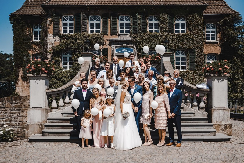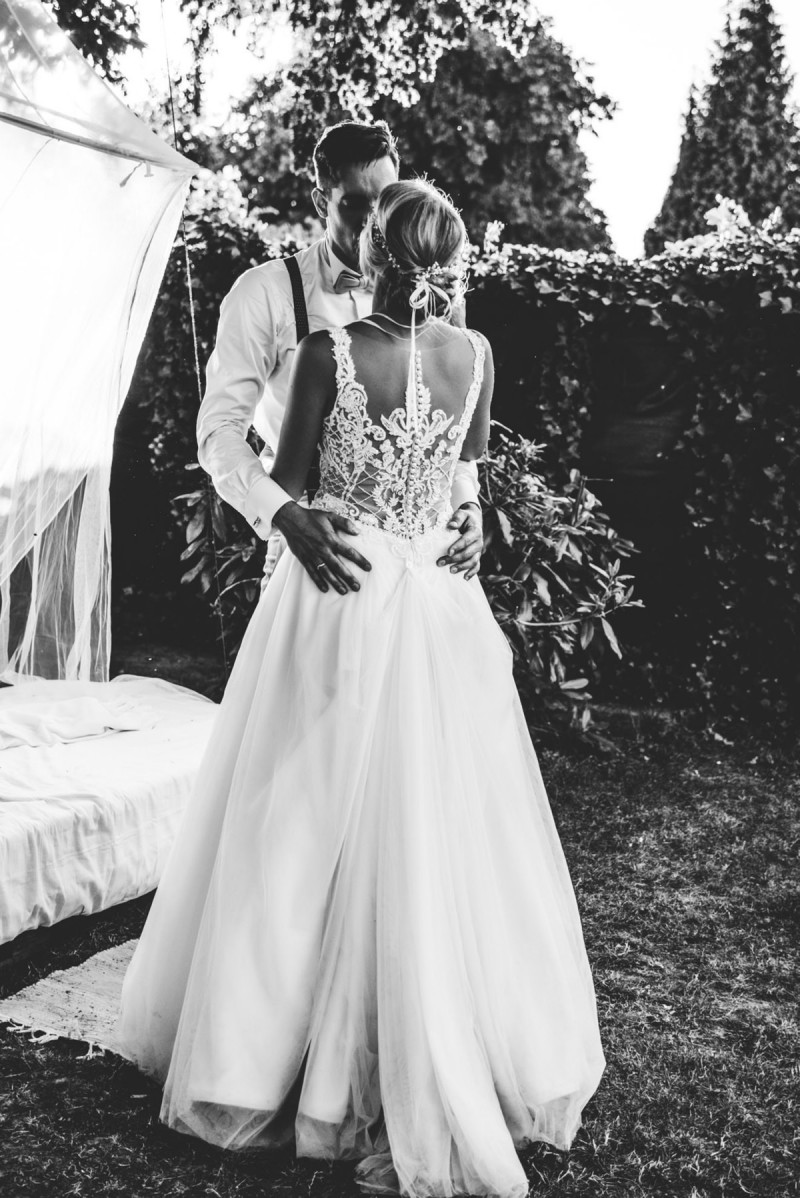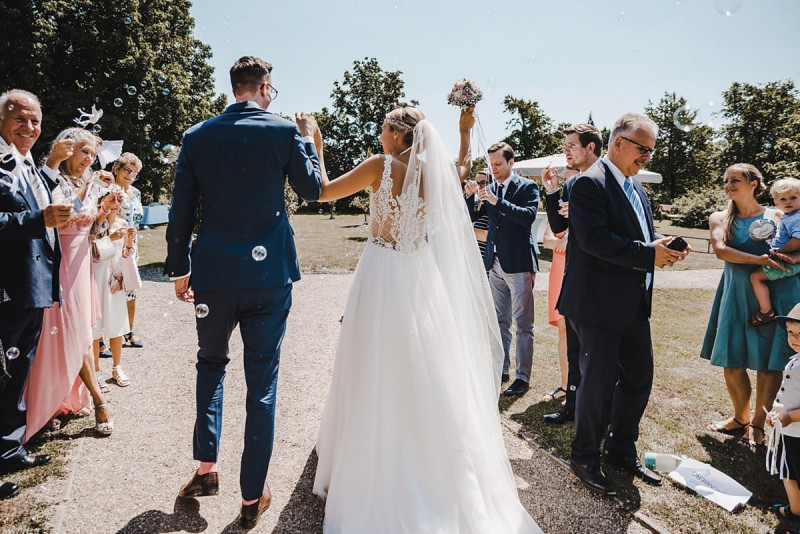 Ich freue mich riesig, euch diese wunderschöne Gartenhochzeit zeigen zu dürfen! Wie der Titel schon verrät, ging es für das Brautpaar Antonia & Alex am 30. Juni diesen Jahres, nach der standesamtlichen Trauung im hübschen Schloss Linnep, mit der Kutsche zur Hochzeitsfeier in den eigenen Garten! Der eigentliche Plan, ganz allein, nur mit den beiden geliebten Hunden, in Österreich am Wasser mit Blick auf die Berge zu heiraten, verflog sofort, als das Brautkleid wie eine Bombe einschlug. “Aber dann verliebte ich mich in mein Kleid. Von da an stand fest, mit so einem Kleid kann man nicht einfach in den See springen und heiraten.” Und so kam es, dass die beiden ihre Planung komplett umschmissen. Das Wichtigste für diesen einmaligen und besonderen Tag? “Wir wollten es für uns!” Der gesamte Tag sollte den beiden gehören und sie absolut glücklich machen. Dies zog sich wie ein roter Faden durch die ganze Planung. Offensichtlich, das absolute Erfolgsrezept! Es war wichtig, dass sich die kleine Hochzeitsgesellschaft und auch die liebevollen Dienstleister wohl fühlten. Jeder Gast war von ganzem Herzen gewünscht und trug seinen Beitrag zu dieser ganz besonderen Feier bei. Es war laut, lustig und ausgelassen! “Es war großartig!” Ich finde, die beiden haben einen Garten Eden geschaffen, in dem Liebe zu wirklicher Perfektion führt. Denn die liebevolle, kreative und detailverliebte Planung und Arbeit aller Beteiligten, führt zu eben diesem wunderschönen Tag! Eine absolut grandiose Hochzeitsinspiration für die Hochzeitsfeier im eigenen Garten oder im Grünen!