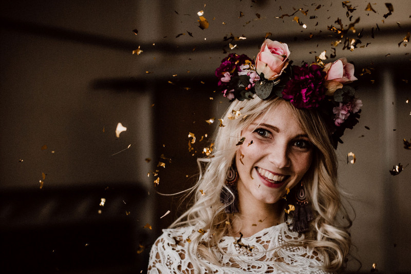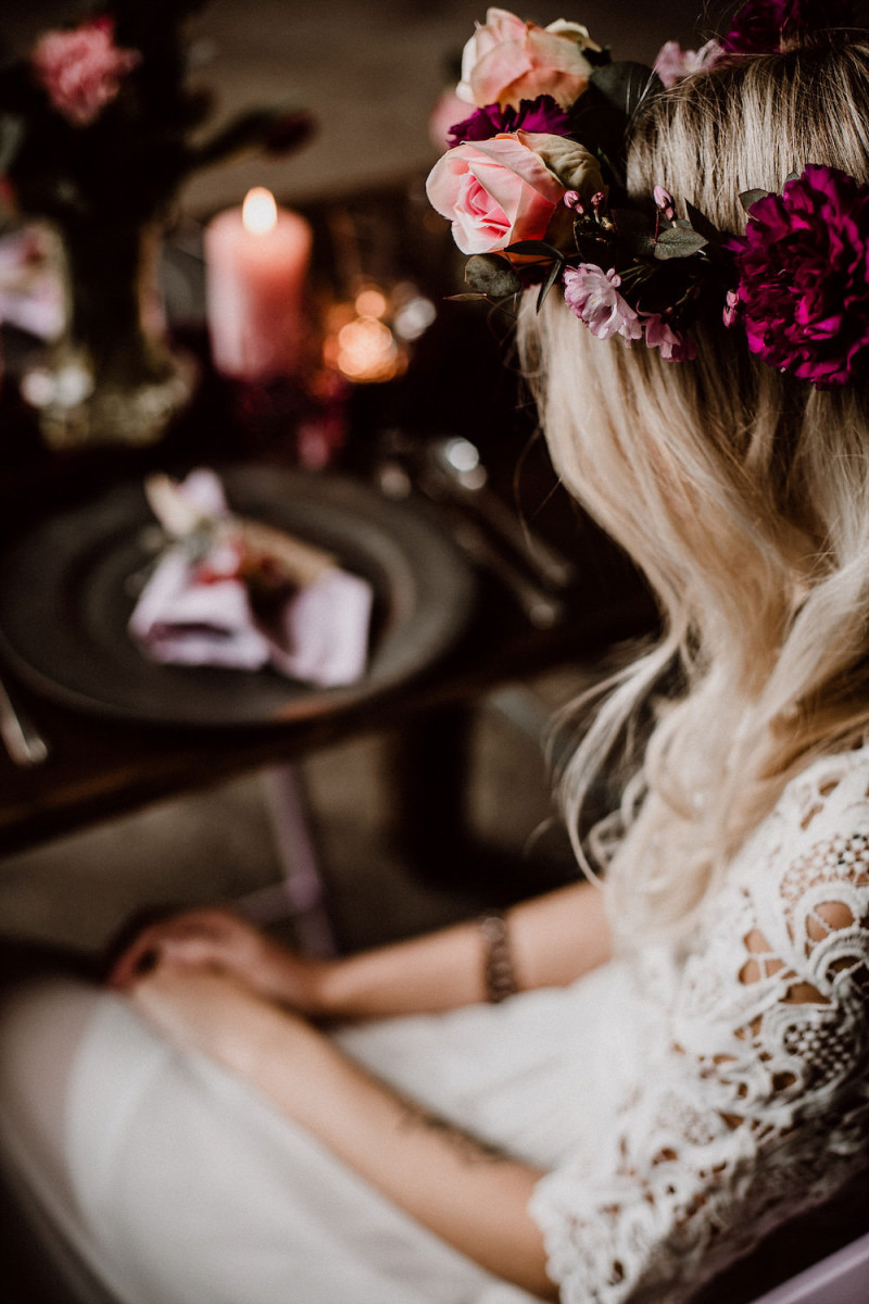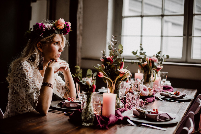 Heute erwartet euch eine rustikale Hochzeitsinspiration, die mit ihren warmen Farben perfekt für Herbsthochzeiten ist. Warme Beerentöne treffen hier auf zartes Blush und feine Pinktöne. Dabei stand vor allem fest, dass es nur wenig für diese Inspiration brauchen sollte! Die liebe Bente von B.L.ichtet Fotografie hat sich spontan die hübsche Saskia und ihre Hündin Emma geschnappt und in 24 Stunden dieses Shooting organisiert. Das Kribbeln in den Fingern musste einfach sofort umgesetzt werden. Und so organisierte sie die Blumen aus Supermärkten und Blumenläden, zog Saskia ein Kleidchen aus ihrem Kleiderschrank an und schmückte das Mobiliar von Sitzplätzchen unteranderem mit einem Schal. Hübsche Gläser, Vasen und Geschirr dazu und zack, los ging es! Passend zur floralen Tischdekoration zauberte Bente noch die hübsche Flowercrown der Braut. Hier wurden, neben frischen Blumen auch Kunstblumen verwendet. Wenig Aufwand aber ein maximal schönes Ergebnis. Aber überzeugt euch selbst.