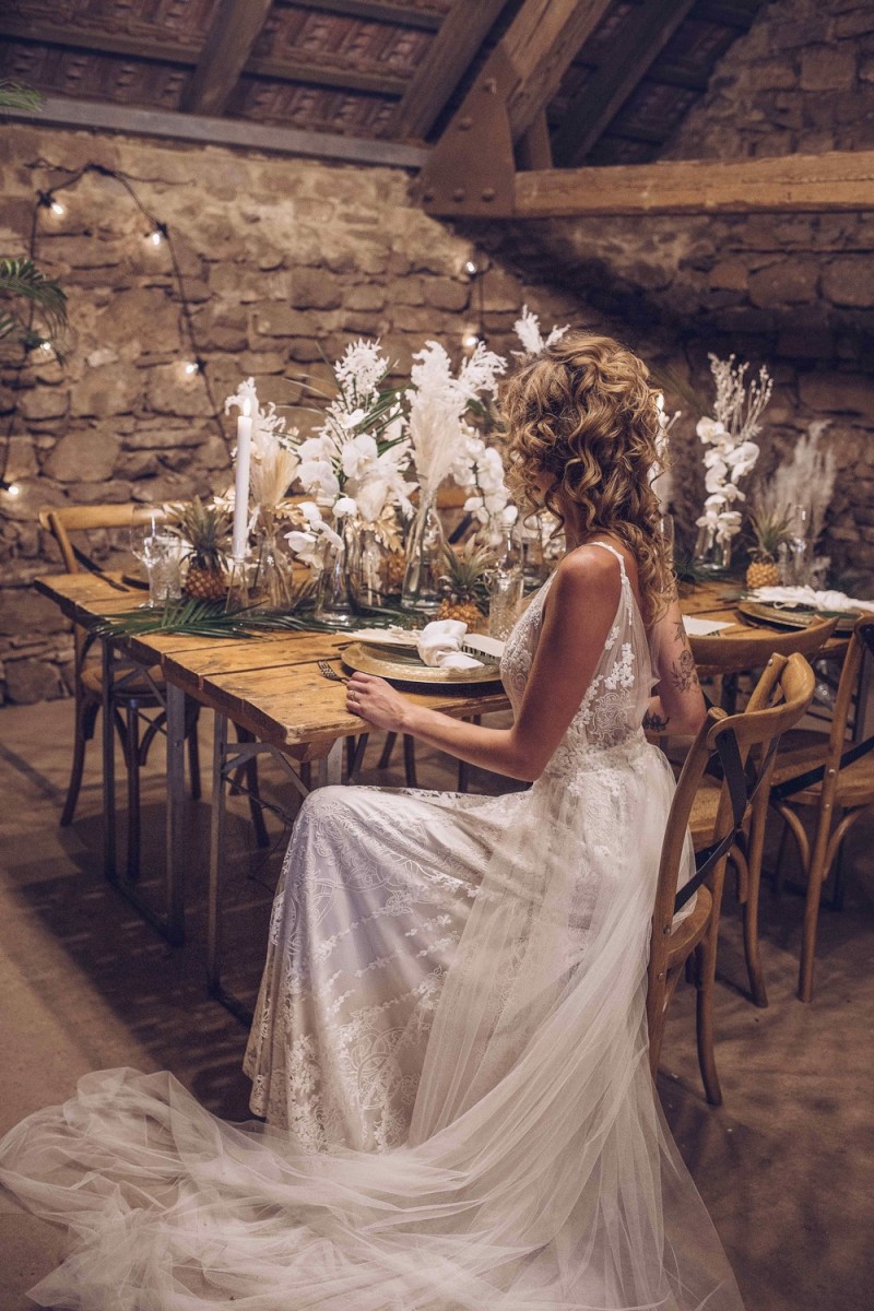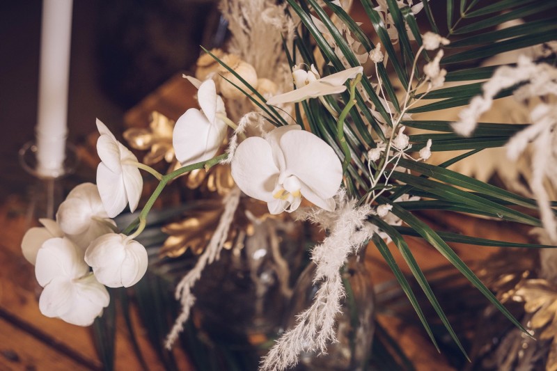 Doch bleiben wir für den Moment noch etwas in der schönen Scheune, die noch einiges für uns bereithält. Die Vorfreude auf unbeschwerte Sommerhochzeiten wird bei diesem besonderen Konzept noch verstärkt, durch die stillvoll gewählten tropischen Details, die sich überall wiederfinden. Kleine Mini-Ananasse finden sich als feine Gastgeschenke genauso, wie strahlendweiße, exotische Orchideen. Umgeben von rauem Gestein, hölzernen Balken und unter der hohen Scheunendecke, kreierten Eva & Michael von Blütensturm ein wunderschönes Blumenmeer für das Tischsetting. Auf dem warmen Holz des Tisches finden sich goldene Platzteller, die umgeben von langen weißen Stabkerzen sowie Gläsern und Kerzenständern aus Glas und Kristall, mit grünen und gebleichten Palmenblättern dekoriert wurden. Neben den echten, kleinen Ananassen wurde das Setting mit gebleichtem Ruscus, weißem Mohn, gebleichtem Pampasgras und einer Vielzahl an weißen Orchideen kreiert. Auf den Tellern finden sich kleine, runde Namenskärtchen aus Acrylglas neben der Menükarte aus Kraftpapier. Ein wunderschöner Blickfang, wie auch die Tischnumer aus rundem Acrylglas mit goldener Schrift. Die liebe Katja von Frau Kopfkino schuf mit dieser Hochzeistpapeterie-Serie einen tollen Mix aus modernem Acrylglas und elegantem Kraftpapier, das wie die Kombination aus Holz und Acryl, edel kombiniert zu den feinen goldenen Details der Schrift und der Platzteller, einen gekonnten Stilbruch hervorbringt.