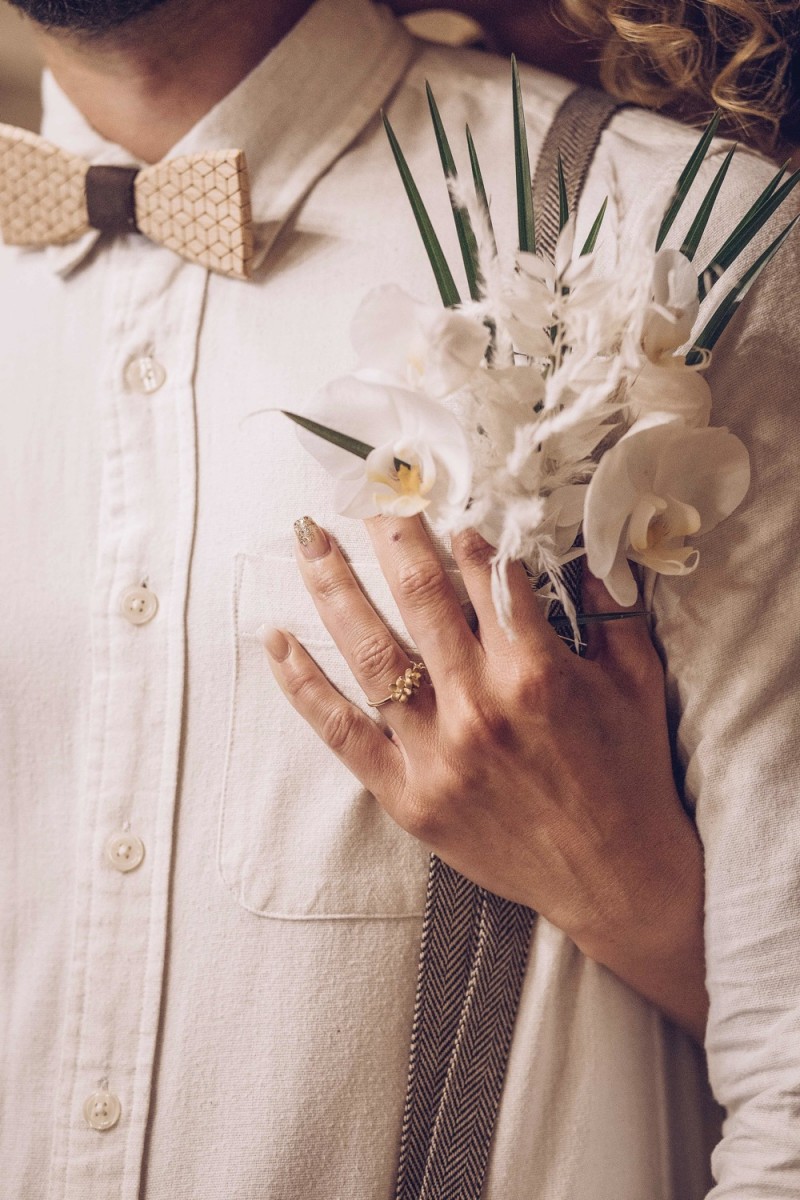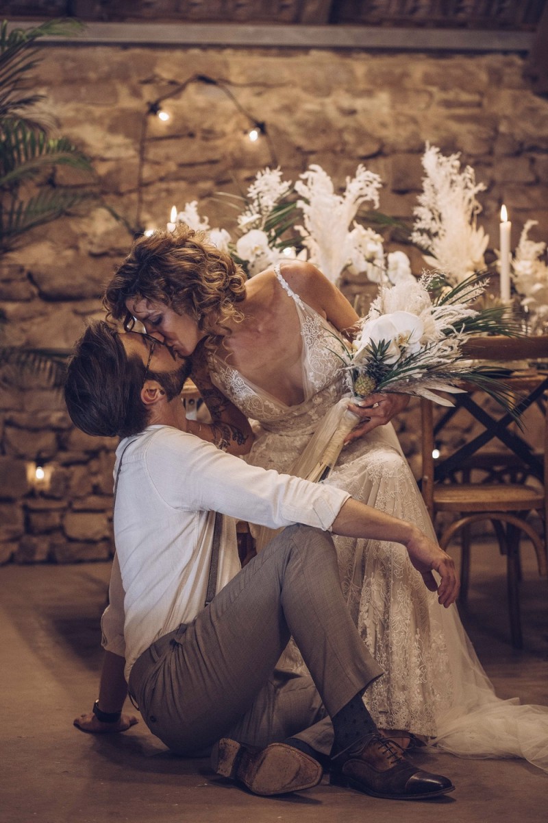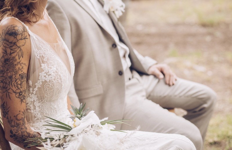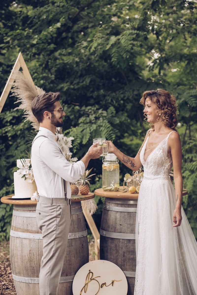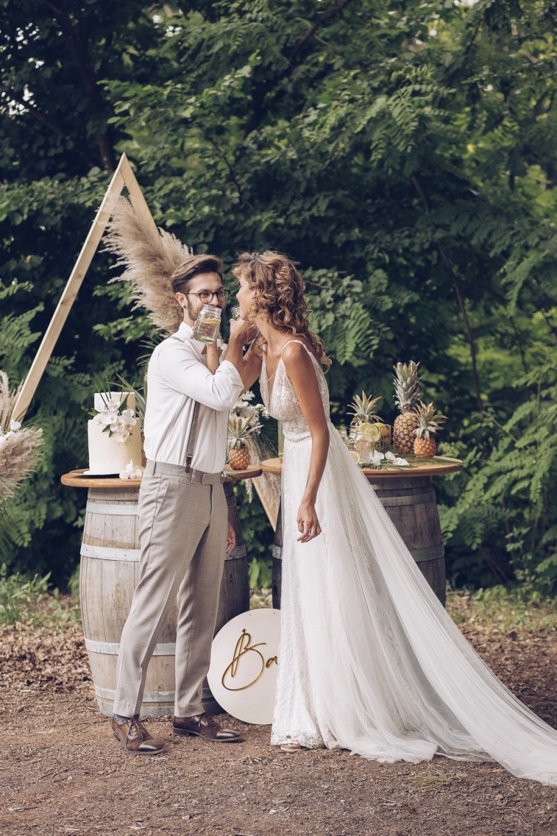 Vor der freien Trauung im Grünen, bei der ebenfalls ein tolles Stück aus Acrylglas zum Einsatz kommt, traf sich das süße Brautpaar hier in der Scheune. Jen strahlt mit ihren champagner-blonden Locken und dem sommerlichen Makeup, beides kreiert von Makeup Artist Giulia Capizzi, und ihrem wunderschönen und zugleich luftig, locker-fließenden Brautkleid aus dem Brautatelier Elena Victoria, mit der Sommersonne um die Wette! Barfuß, mit eigens für diesen Tag angefertigtem Schmuck von der Schmuckgestalterei, bestehend aus feinen goldenen Ananas-Ohrringen und geschmiedeten Goldringen mit Blumendekor, und mit einem tropischen Brautstrauß im Arm, verliert man sich in ihrem herrlichen Sommerbraut-Look und den Spitzendetails auf dem semitransparenten Stoff ihres eleganten Brautkleides. Ihr Bräutigam Daniel trägt, perfekt abgestimmt auf ihren Look, einen beige-grauen Anzug, mit Hosenträger, einer Holzfliege und dem passenden Blumenanstecker.