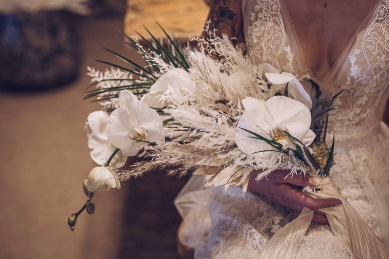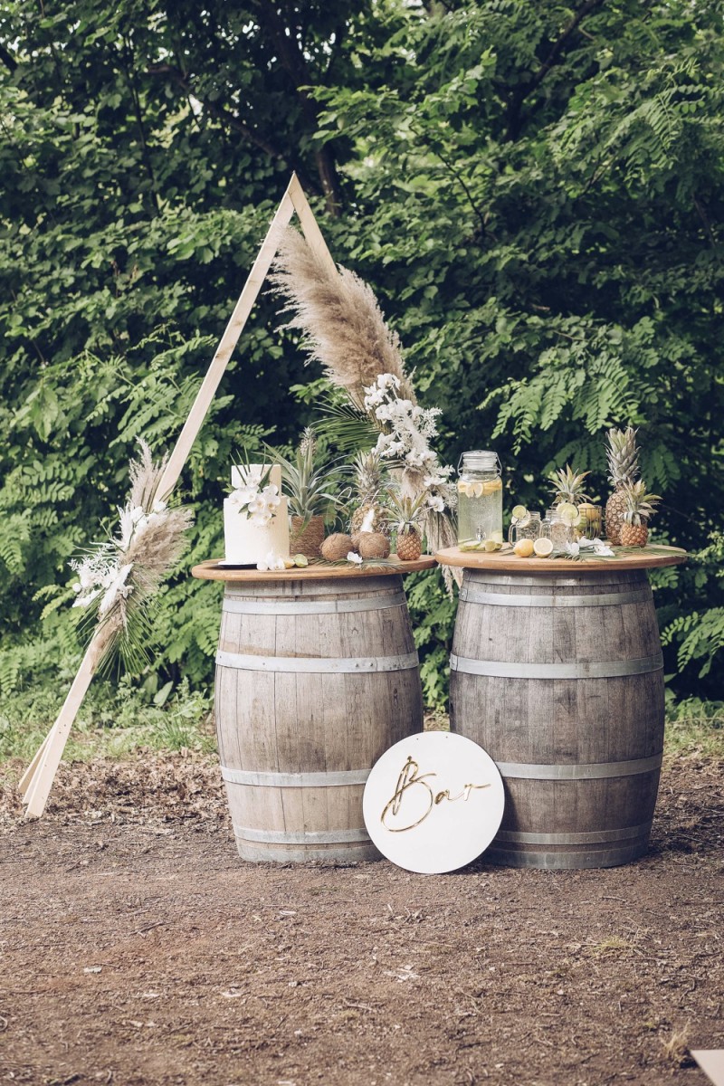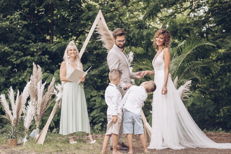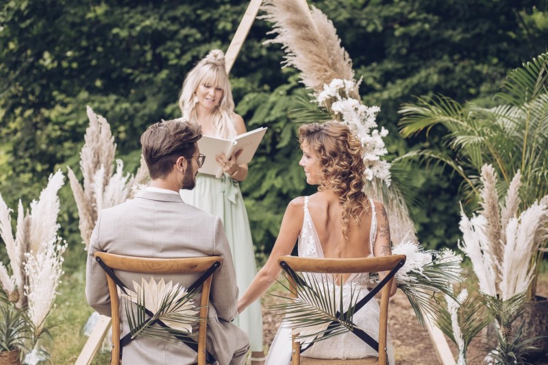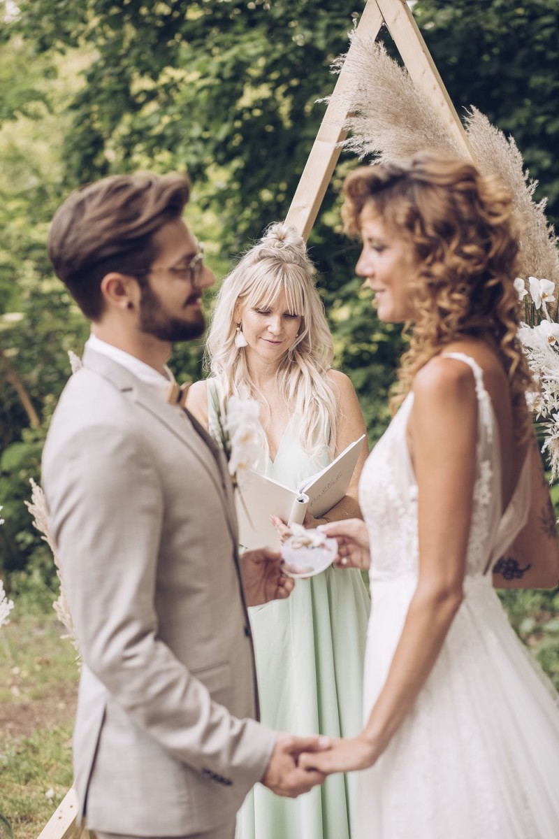 Im Außenbereich des Forsthauses erwartete das Brautpaar, nach der romantischen Zweisamkeit in der Scheune, eine tropische freie Trauung mit Traurednerin Frau Liebe, unterm freien Himmel. Ein herrliches Setting mit einem großen Traubogen, viel Pampasgras, Palmenblättern und weißen Orchideen strahlte regelrecht vor dem dichten Grün des Waldes. Die drei süßen Kids der beiden wurden natürlich in die intime Trauzeremonie einbezogen, was diese noch emotionaler machte.