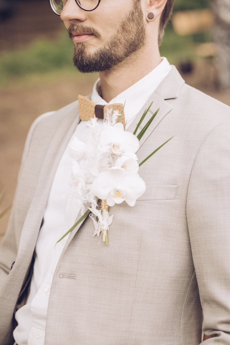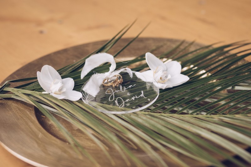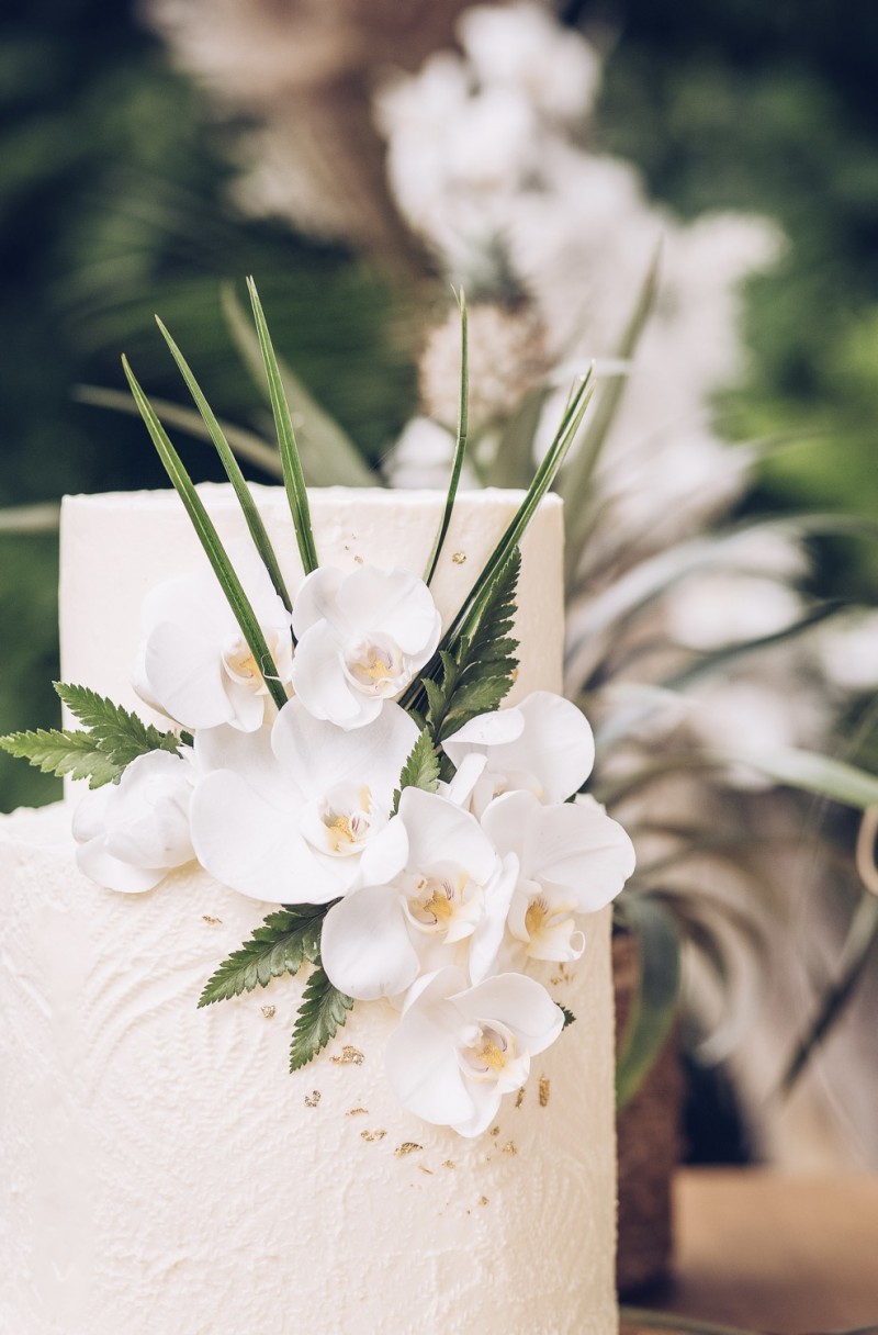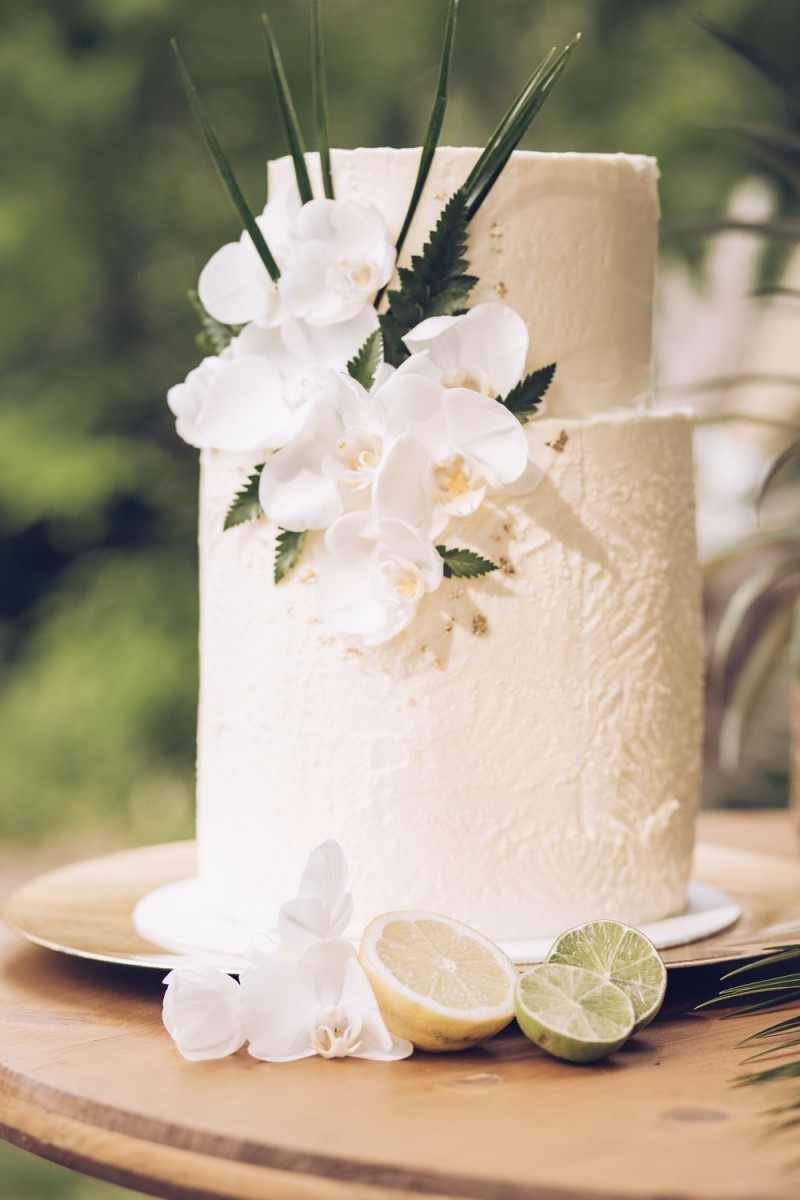 An der grandiosen Fruit Bar, gleich in der Nähe, gab es nach der Trauung für alle eine fruchtige Erfrischung. Umrandet von Kokosnüssen, Ananassen, Limonen und Zitronen stand hier leckere Limonade bereit und eine wunderschöne, strahlende Hochzeitstorte von Lieber backen. Sophie zauberte mit dieser weißen Hochzeitstorte aus einer sommerlich-leichten Creme und mit Orchideen verziert, sicherlich nicht nur den drei Kids ein Lächeln ins Gesicht! Und genau das soll diese Inspiration bei uns allen bewirken! Lasst uns mutig und aufgeschlossen sein! Lasst uns den Spaß, die Freude und die Unbeschwertheit nicht vergessen, die uns das Leben und besonders Hochzeiten schenken! Egal ob es sich um die Lust auf endlose Sommertage, tropische Sommerhochzeiten oder die Vorfreude auf’s Heiraten handelt – wir geben die Hoffnung nicht auf! Und jetzt wünsche ich euch ganz viel Freude mit dieser kontrastreichen Inspiration für tropische Sommerhochzeiten!