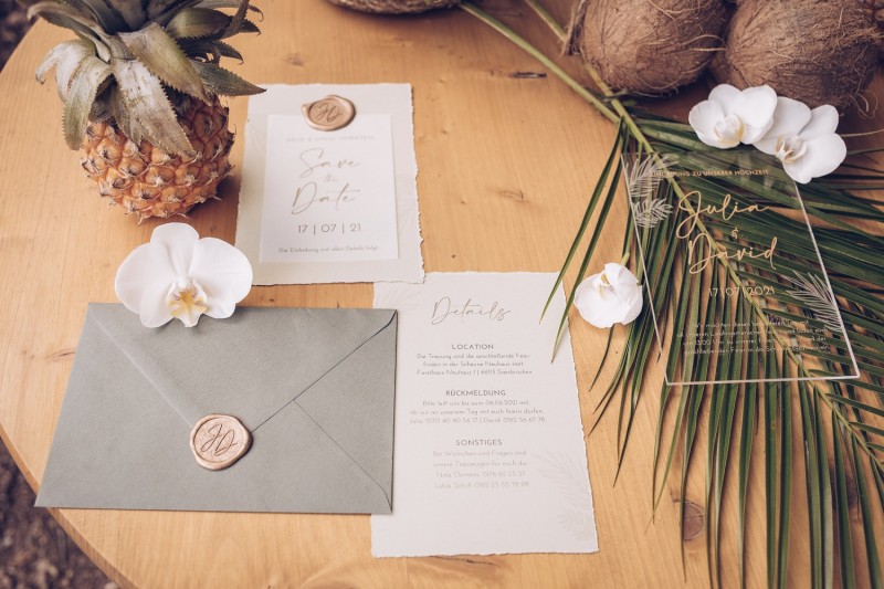 Ein Hauch Südsee-Feeling, das erwartet uns in dieser schönen Sommerinspiration, die uns mit tropischen Vibes und einem charmanten Spiel von Kontrasten verzaubert. Fotografiert von Hochzeitsfotografin Jennifer Spurk, dürfen wir es uns im schönen Forsthaus Neuhaus gemütlich machen. In der rustikalen Scheune der Eventlocation findet sich eine sommerlich-leichte Farbpalette, die frische Grüntöne, sanfte Cremetöne, elegantes Weiß und edles Gold kombiniert. Diese sommerlich-lässige Eleganz gibt der wunderschönen Scheune einen ganz neuen Charakter und vereint die schönsten Züge beider Welten zu einem kontrastreichen aber sehr harmonischen Konzept. Hochzeitsplanerin und Traurednerin Corinne Huberty, auch bekannt als Frau Liebe, hat dieses tolle Konzept kreiert, das inspirierende Shooting geplant und on top die romantische Trauung unter freiem Himmel gehalten.
