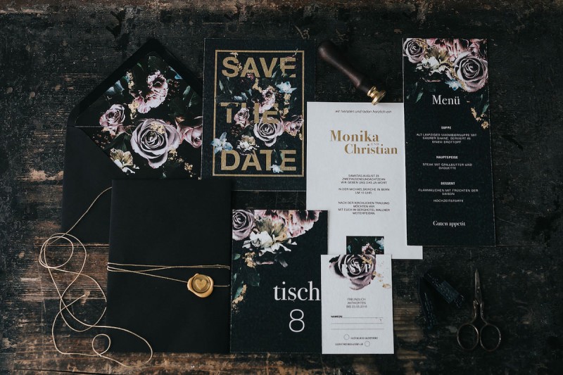 Warme Goldtöne treffen auf dominante Schwarztöne. Durch große, wilde Blumen in dunklen Tönen, wird der Kontrast aufgebrochen und verbunden.