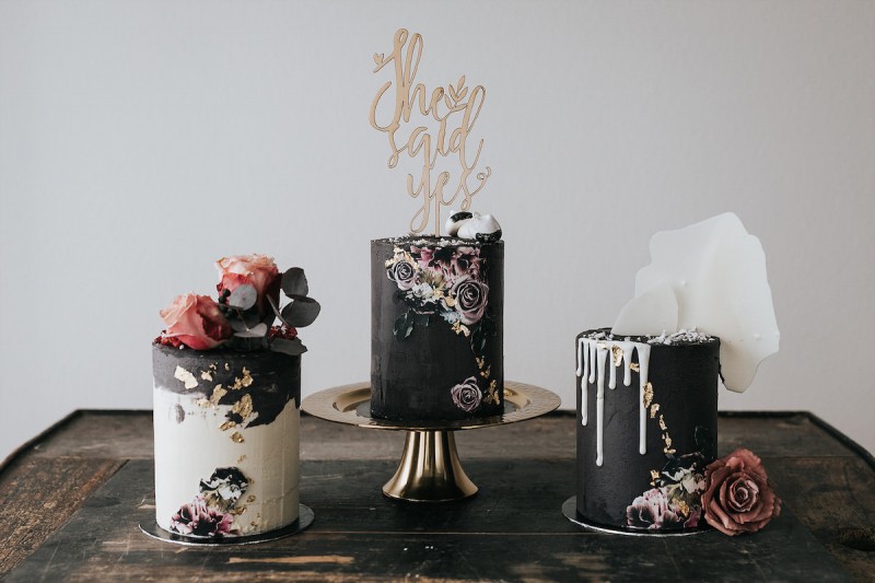 Dunkle, gar schwarze Torten als Leinwand zur künstlerischen Darstellung der Blumenmuster. Verbunden mit großen Rosen in warmen und lieblichen Tönen. Leichtes Verwelken der Blumen bricht den Perfektionismus künstlicher Blumen auf und gibt den Torten einen Ausdruck der Echtheit und des Purismus.