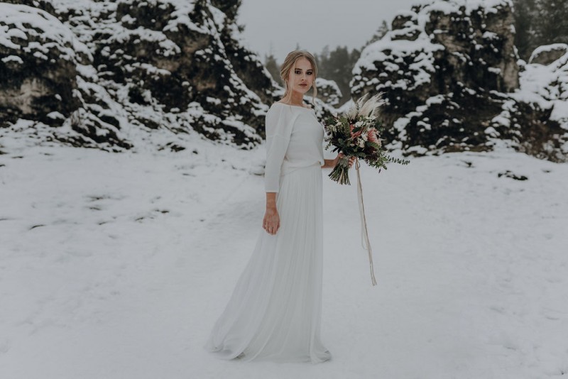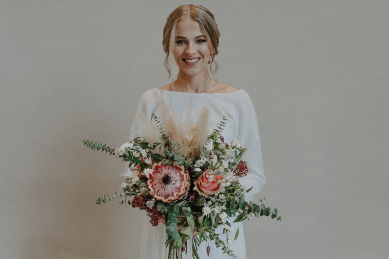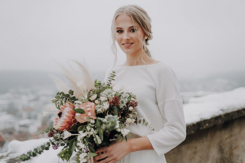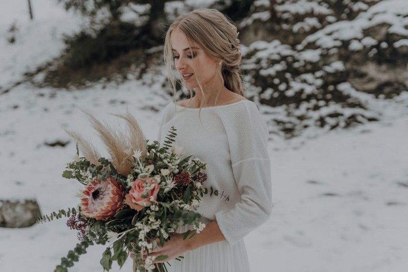 Passend zum schwächelnden Frühling geht es für uns in dieser schönen Brautstrauß Inspiration noch einmal in ein verschneites Winter Wonderland. Fotografiert von Hochzeitsfotografin Nicole Bühler, erwartet uns eine bezaubernde Winterbraut im verschneiten Wald. Mit einem ausdruckstarken und zugleich märchenhaften Brautstyling, kreiert von Nicol Gehrmann, und in einem wunderschönen Winterlook – bestehend aus einem kuscheligen Brautpullover von Ivory and Blush, einem langen fließenden Rock von Catherine Deane und sehr feinen Schmuck von Lovely Adorned – tanzt diese hübsche Braut, mit ihrem aufregenden Brautstrauß, durch den Pullverschnee und den dichten Wald. Blumen Heller zauberte ihr einen lebendigen Brautstrauß, der mit frischem, zart-süßlich duftendem Eukalyptus der Sorte Baby Blue, grünen Edeldisteln, wunderschönen silbrig-rosanen Beetrosen namens Hermosa, japanischen Blütenskimmien in Dunkelrot und einer farbenprächtigen Protea Barbigera Queen wild, feurig und edel zugleich ist. Weiße Sterndolden, Clematis, gebleichte sternförmige Nigella und weiße Euphorbien – auch Zauberschnee genannt – geben den schönen Akzenten in Rosa und Rot einen verschneiten Wintertouch. Fluffiges Pampasgras ergänzt den wilden Look und versprüht einen dezenten Hauch Boho. Gebunden mit einigen Spitzenbändern und Juteschnüren, ist er der perfekte Brautstrauß für eine Winterhochzeit im schönen Boho-Vintage Stil.