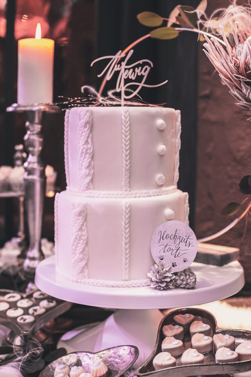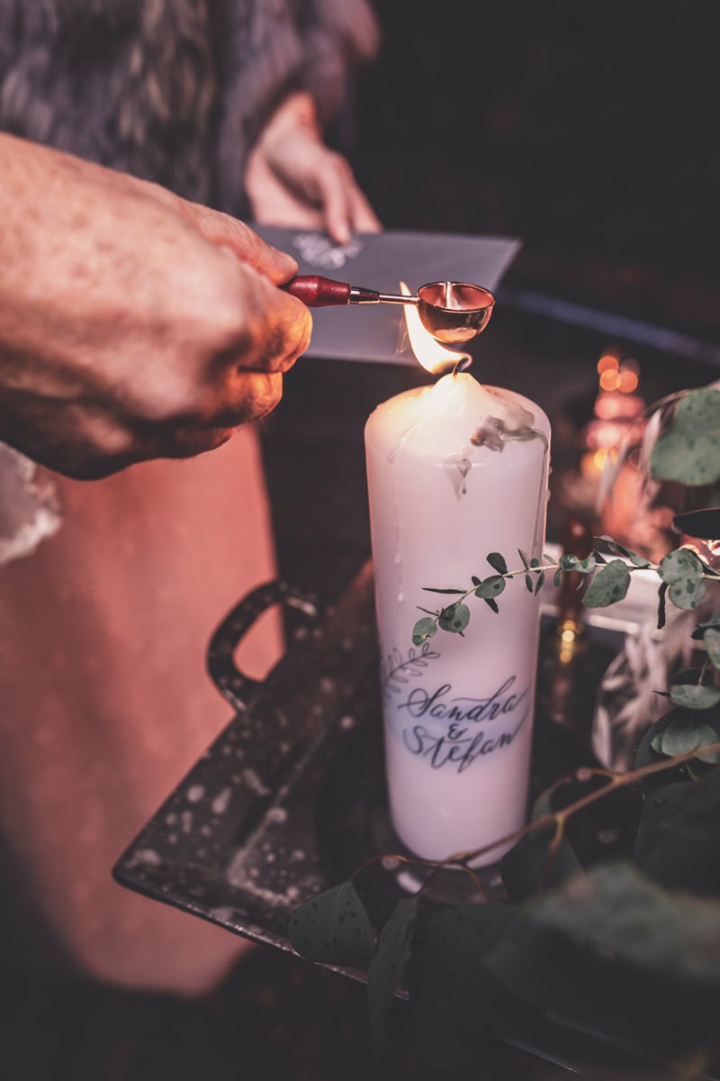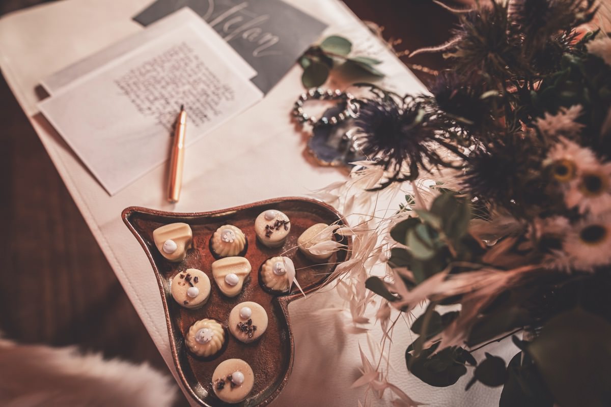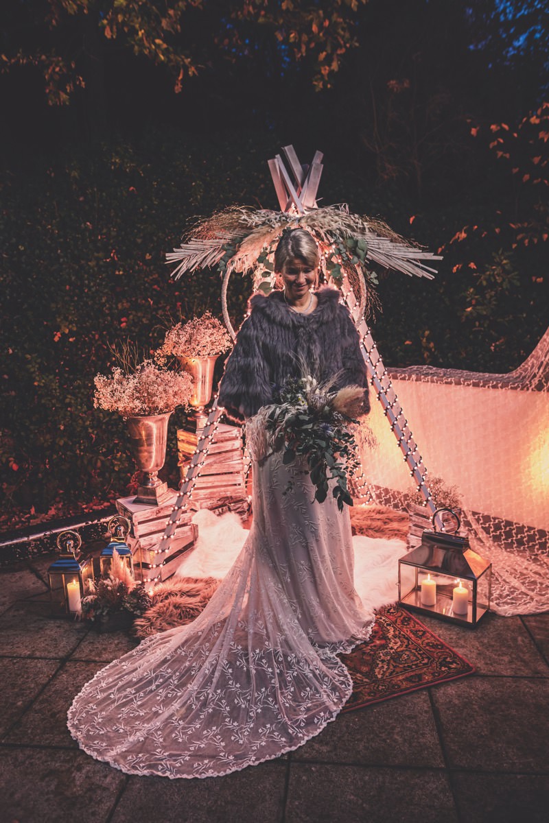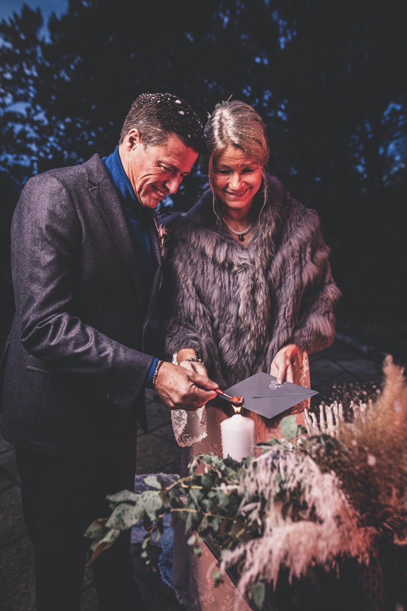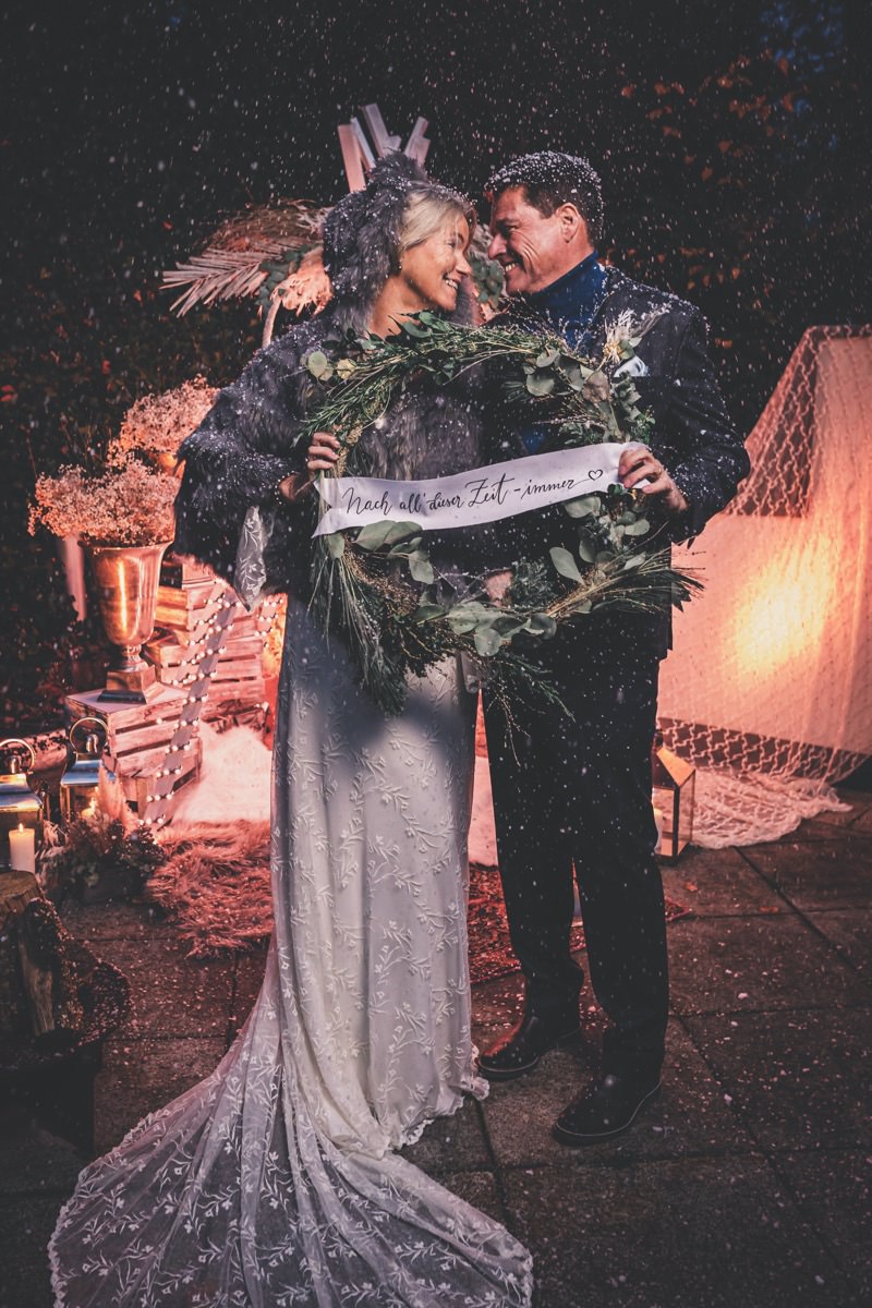 Wenn uns in diesem Jahr, wie leider in so vielen, schon kein Schnee vergönnt ist an Weihnachten und Neujahr, dann müssen wir uns das Winterwonderland eben erträumen! Und mit dieser Inspiration hier, dürfte euch das nicht schwer fallen. Euch erwartet eine romantische Eheerneuerung von einem Paar, das damit die vielen Jahre ihrer Ehe feiern möchte. Umgeben von Bohodetails und im Schnee feierten sie diesen besonderen Tag. Die kreativen Köpfe, die ich euch gleich vorstellen darf, sind gemeinsam die Crew der Hochzeitsmesse Hattingen heiratet. Ein Verbund aus Dienstleistern, die diese Inspiration für euch kreiert haben. Fotografiert wurde diese Inspiration einer verschneiten Eheerneuerung, im Diergardt Hattingen, von HK Photographics . Schon die Location ruft ganz laut Winterwonderland. Neben Kerzenschein und kuscheligen Wintervibes, sorgte EventikS mit Licht und Sound für besonders viel romantische Stimmung. Dank der videografischen Unterstützung von Mumukuba, erwartet euch unter den Bildern dieser Inspiration auch noch ein wunderschönes Video dieses Winterwonderlands. Geplant und konzeptionalisiert wurde der Tag von der lieben Anja von Goldröschen. Und so dürfen wir all diese schönen Details entdecken, die diese Inspiration bereithält. Dazu zählen neben einer wirklich romantischen Zeremonie im Freien, gehalten von dem Traufräulein, auch ein schönes Getting Ready, bei dem das Brautpaar füreinander Liebesbriefe schrieb, die bei der Zeremonie, musikalisch begleitet von Lea Bergen, unter die Haut gingen. Schon die Hochzeitspapeterie, die zu diesem besonderen Tag einlädt, ist ein totaler Wintertraum. Kreiert wurde sie von Sandra Semelink Kalligraphie & Design. Die gesamte Floristik dieser Inspiration vereint zarte Boho- und Wintervibes, gezaubert Floristik Monika Zink. Diese verschönerte auch den Sweet Table, der einer Winterhochzeit wirklich mehr als gerecht wird. Eine wunderschöne Hochzeitstorte aus weißem Fondant mit feinen Strickdetails sowie kleine Sweets, von der Konditorei Kartenberg, wartete dort auf das Brautpaar. Der passende Caketopper ist, wie auch die Kerze beim Getting Ready und die Lasercut Schilder an den Stühlen ‚Braut‘ und ‚Bräutigam‘, von meiner Bloggerkollegin Barbara vom Hochzeitsblog The Little Wedding Corner. Doch kommen wir zum Brautpaar. Unsere Braut wurde bei ihrem Getting Ready von Lina on Tour gestylt und schlüpfte in ein winterliches Brautoutfit von Pretty Woman Brautmode. Passend dazu, trägt ihr Bräutigam in ein wirklich tolles und winterliches Bräutigamoutfit von Eiskirch Atelier. Bei der Zeremonie, wo sich die beiden unter Schneeflocken wiederfanden, tauschten sie erneut ihre Ringe aus. Diese sind von Jörg Faatz Goldschmied. Wie ich finde mehr als verdient nach so vielen Jahren gemeinsam. Das sollte mehr als nur ein Grund zum Feiern sein! Umso mehr freue ich mich, euch so eine schöne Inspiration zu zeigen! Ganz viel Freude euch damit!