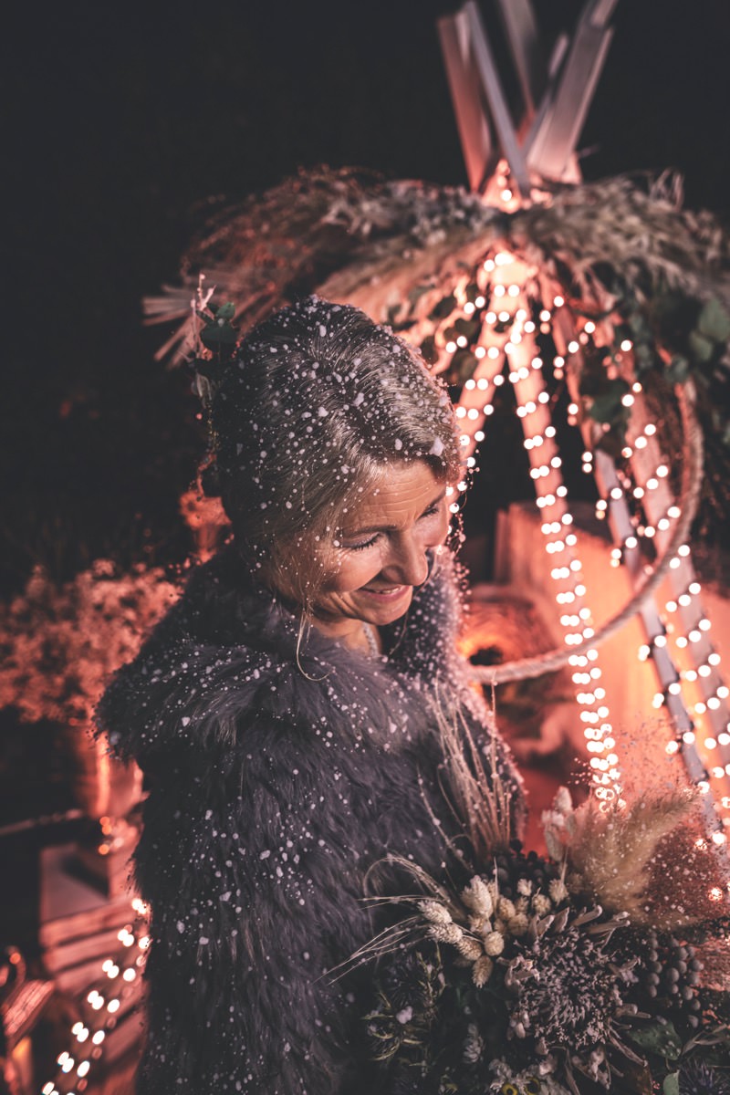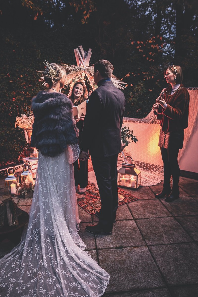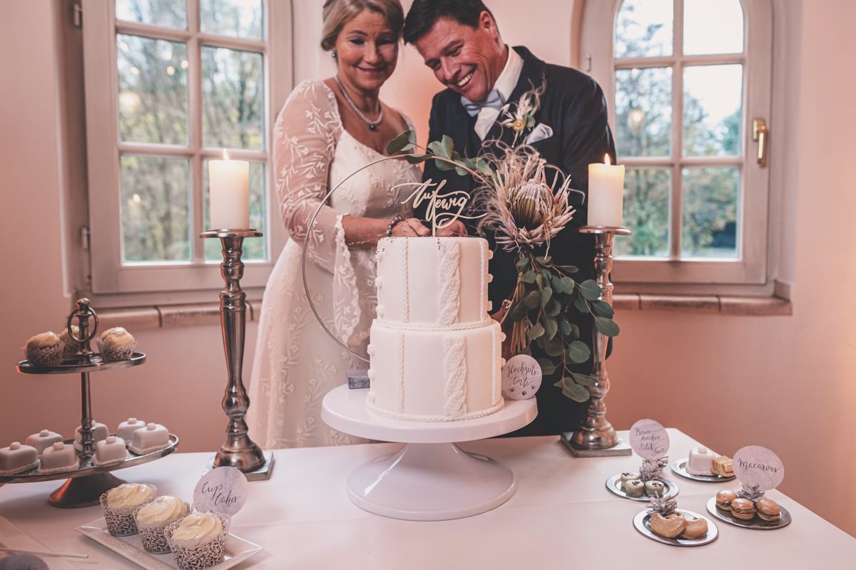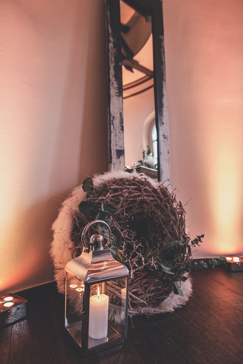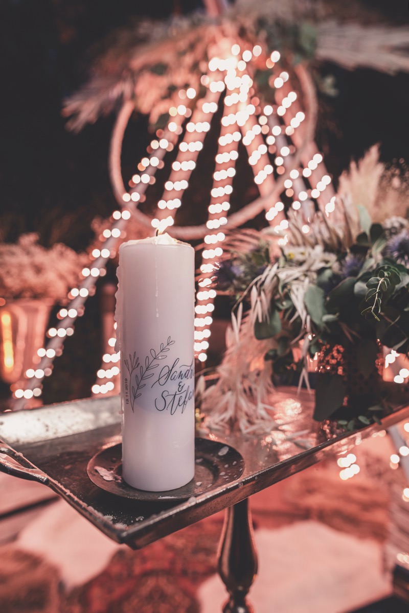 Wenn uns in diesem Jahr, wie leider in so vielen, schon kein Schnee vergönnt ist an Weihnachten und Neujahr, dann müssen wir uns das Winterwonderland eben erträumen! Und mit dieser Inspiration hier, dürfte euch das nicht schwer fallen. Euch erwartet eine romantische Eheerneuerung von einem Paar, das damit die vielen Jahre ihrer Ehe feiern möchte. Umgeben von Bohodetails und im Schnee feierten sie diesen besonderen Tag. Die kreativen Köpfe, die ich euch gleich vorstellen darf, sind gemeinsam die Crew der Hochzeitsmesse Hattingen heiratet. Ein Verbund aus Dienstleistern, die diese Inspiration für euch kreiert haben. Fotografiert wurde diese Inspiration einer verschneiten Eheerneuerung, im Diergardt Hattingen, von HK Photographics . Schon die Location ruft ganz laut Winterwonderland. Neben Kerzenschein und kuscheligen Wintervibes, sorgte EventikS mit Licht und Sound für besonders viel romantische Stimmung. Dank der videografischen Unterstützung von Mumukuba, erwartet euch unter den Bildern dieser Inspiration auch noch ein wunderschönes Video dieses Winterwonderlands. Geplant und konzeptionalisiert wurde der Tag von der lieben Anja von Goldröschen. Und so dürfen wir all diese schönen Details entdecken, die diese Inspiration bereithält. Dazu zählen neben einer wirklich romantischen Zeremonie im Freien, gehalten von dem Traufräulein, auch ein schönes Getting Ready, bei dem das Brautpaar füreinander Liebesbriefe schrieb, die bei der Zeremonie, musikalisch begleitet von Lea Bergen, unter die Haut gingen. Schon die Hochzeitspapeterie, die zu diesem besonderen Tag einlädt, ist ein totaler Wintertraum. Kreiert wurde sie von Sandra Semelink Kalligraphie & Design. Die gesamte Floristik dieser Inspiration vereint zarte Boho- und Wintervibes, gezaubert Floristik Monika Zink. Diese verschönerte auch den Sweet Table, der einer Winterhochzeit wirklich mehr als gerecht wird. Eine wunderschöne Hochzeitstorte aus weißem Fondant mit feinen Strickdetails sowie kleine Sweets, von der Konditorei Kartenberg, wartete dort auf das Brautpaar. Der passende Caketopper ist, wie auch die Kerze beim Getting Ready und die Lasercut Schilder an den Stühlen ‚Braut‘ und ‚Bräutigam‘, von meiner Bloggerkollegin Barbara vom Hochzeitsblog The Little Wedding Corner. Doch kommen wir zum Brautpaar. Unsere Braut wurde bei ihrem Getting Ready von Lina on Tour gestylt und schlüpfte in ein winterliches Brautoutfit von Pretty Woman Brautmode. Passend dazu, trägt ihr Bräutigam in ein wirklich tolles und winterliches Bräutigamoutfit von Eiskirch Atelier. Bei der Zeremonie, wo sich die beiden unter Schneeflocken wiederfanden, tauschten sie erneut ihre Ringe aus. Diese sind von Jörg Faatz Goldschmied. Wie ich finde mehr als verdient nach so vielen Jahren gemeinsam. Das sollte mehr als nur ein Grund zum Feiern sein! Umso mehr freue ich mich, euch so eine schöne Inspiration zu zeigen! Ganz viel Freude euch damit!