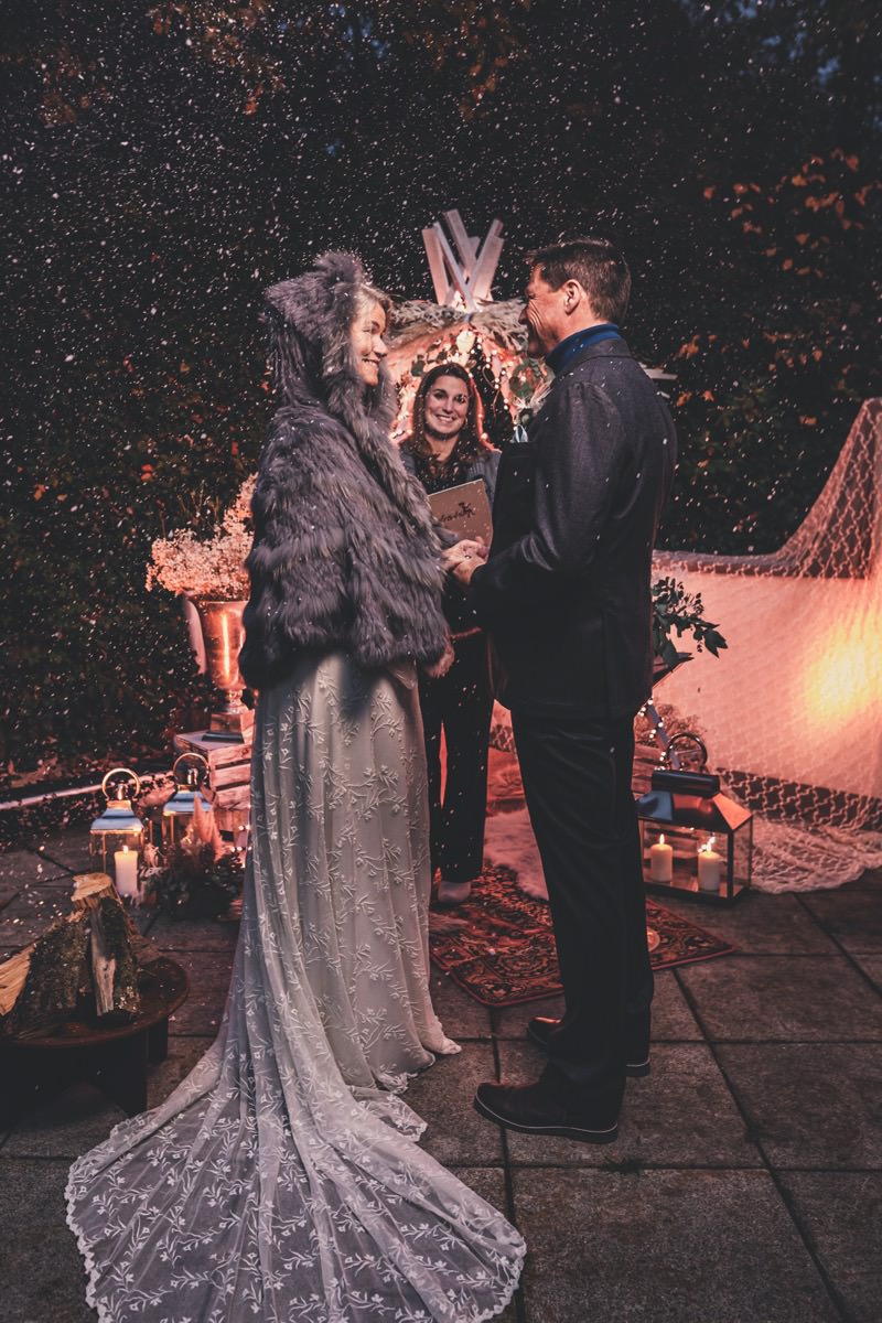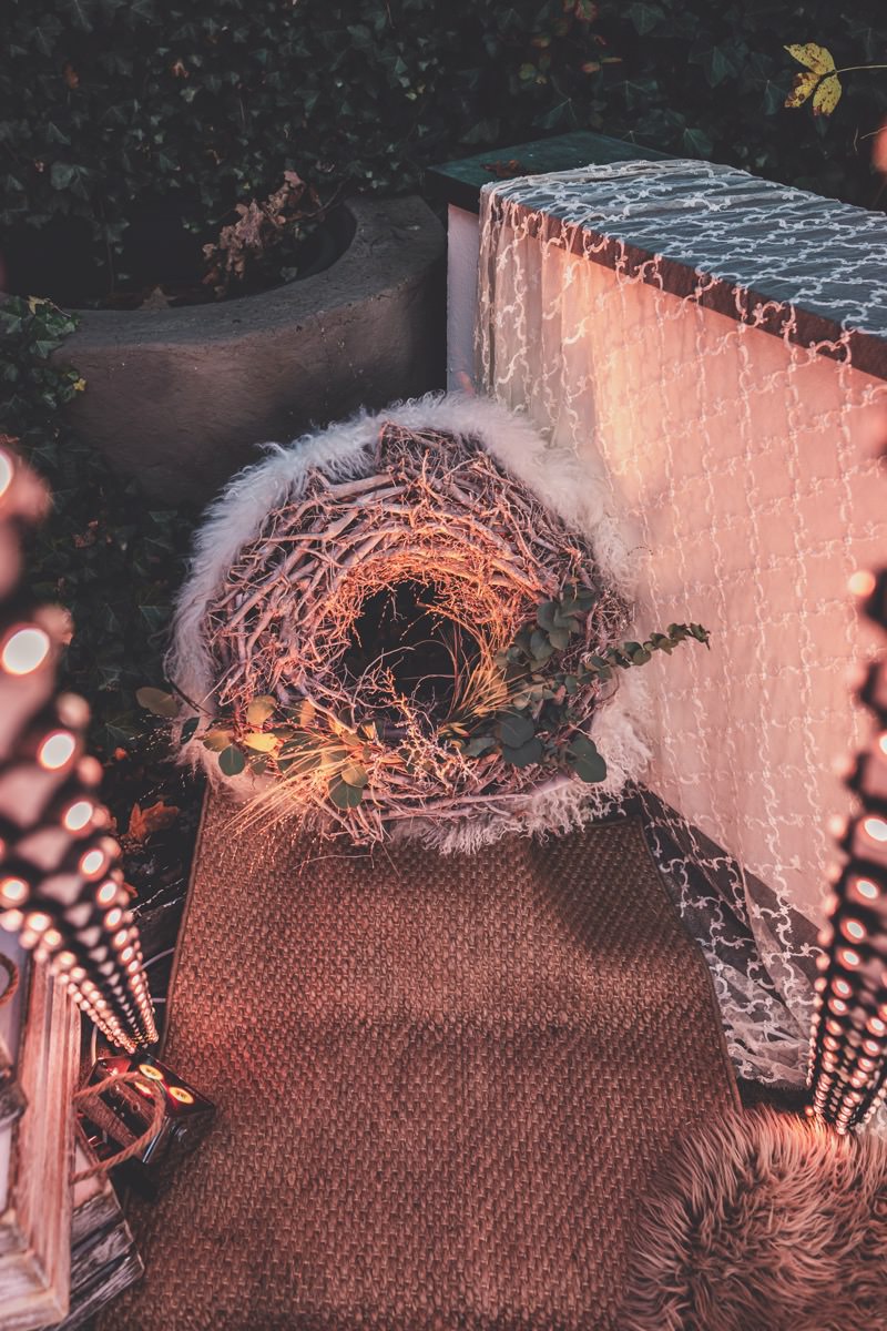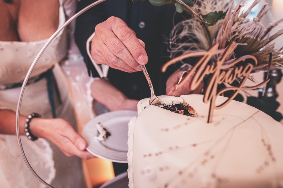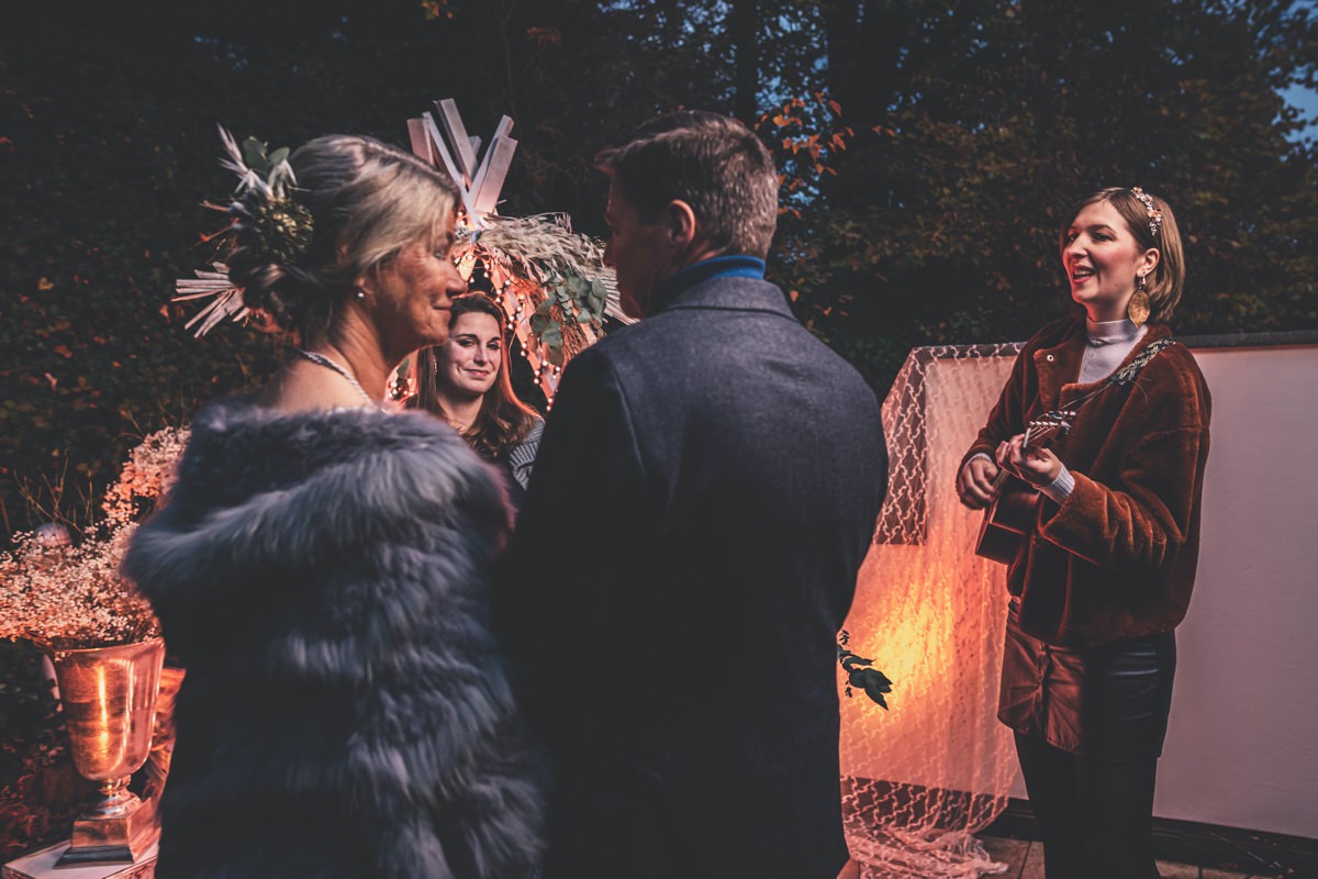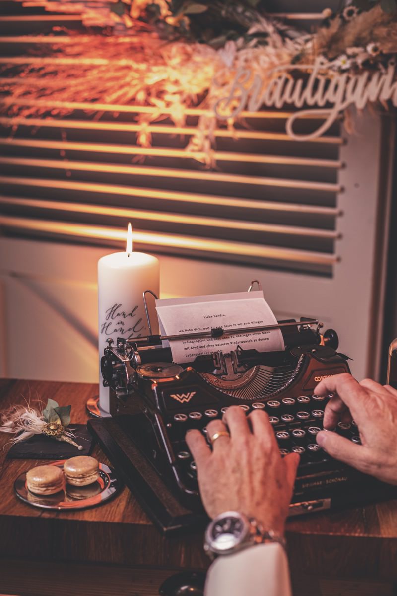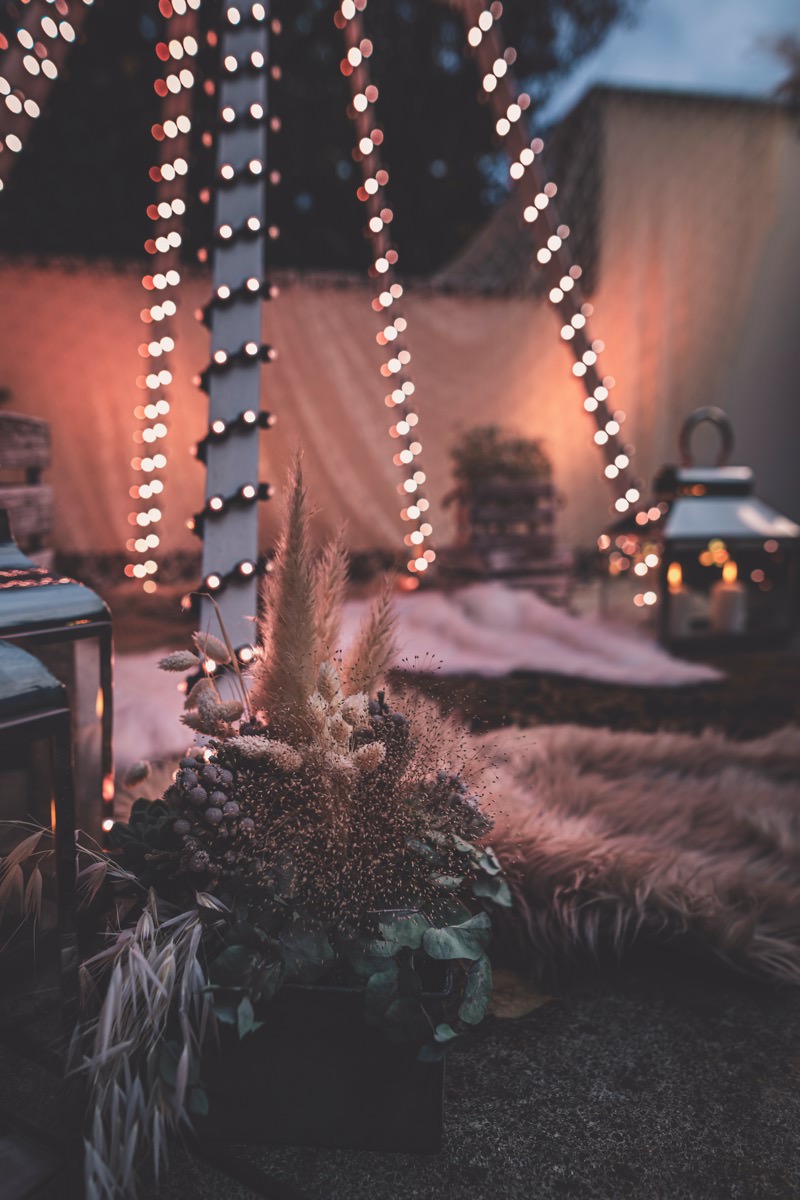 Wenn uns in diesem Jahr, wie leider in so vielen, schon kein Schnee vergönnt ist an Weihnachten und Neujahr, dann müssen wir uns das Winterwonderland eben erträumen! Und mit dieser Inspiration hier, dürfte euch das nicht schwer fallen. Euch erwartet eine romantische Eheerneuerung von einem Paar, das damit die vielen Jahre ihrer Ehe feiern möchte. Umgeben von Bohodetails und im Schnee feierten sie diesen besonderen Tag. Die kreativen Köpfe, die ich euch gleich vorstellen darf, sind gemeinsam die Crew der Hochzeitsmesse Hattingen heiratet. Ein Verbund aus Dienstleistern, die diese Inspiration für euch kreiert haben. Fotografiert wurde diese Inspiration einer verschneiten Eheerneuerung, im Diergardt Hattingen, von HK Photographics . Schon die Location ruft ganz laut Winterwonderland. Neben Kerzenschein und kuscheligen Wintervibes, sorgte EventikS mit Licht und Sound für besonders viel romantische Stimmung. Dank der videografischen Unterstützung von Mumukuba, erwartet euch unter den Bildern dieser Inspiration auch noch ein wunderschönes Video dieses Winterwonderlands. Geplant und konzeptionalisiert wurde der Tag von der lieben Anja von Goldröschen. Und so dürfen wir all diese schönen Details entdecken, die diese Inspiration bereithält. Dazu zählen neben einer wirklich romantischen Zeremonie im Freien, gehalten von dem Traufräulein, auch ein schönes Getting Ready, bei dem das Brautpaar füreinander Liebesbriefe schrieb, die bei der Zeremonie, musikalisch begleitet von Lea Bergen, unter die Haut gingen. Schon die Hochzeitspapeterie, die zu diesem besonderen Tag einlädt, ist ein totaler Wintertraum. Kreiert wurde sie von Sandra Semelink Kalligraphie & Design. Die gesamte Floristik dieser Inspiration vereint zarte Boho- und Wintervibes, gezaubert Floristik Monika Zink. Diese verschönerte auch den Sweet Table, der einer Winterhochzeit wirklich mehr als gerecht wird. Eine wunderschöne Hochzeitstorte aus weißem Fondant mit feinen Strickdetails sowie kleine Sweets, von der Konditorei Kartenberg, wartete dort auf das Brautpaar. Der passende Caketopper ist, wie auch die Kerze beim Getting Ready und die Lasercut Schilder an den Stühlen ‚Braut‘ und ‚Bräutigam‘, von meiner Bloggerkollegin Barbara vom Hochzeitsblog The Little Wedding Corner. Doch kommen wir zum Brautpaar. Unsere Braut wurde bei ihrem Getting Ready von Lina on Tour gestylt und schlüpfte in ein winterliches Brautoutfit von Pretty Woman Brautmode. Passend dazu, trägt ihr Bräutigam in ein wirklich tolles und winterliches Bräutigamoutfit von Eiskirch Atelier. Bei der Zeremonie, wo sich die beiden unter Schneeflocken wiederfanden, tauschten sie erneut ihre Ringe aus. Diese sind von Jörg Faatz Goldschmied. Wie ich finde mehr als verdient nach so vielen Jahren gemeinsam. Das sollte mehr als nur ein Grund zum Feiern sein! Umso mehr freue ich mich, euch so eine schöne Inspiration zu zeigen! Ganz viel Freude euch damit!