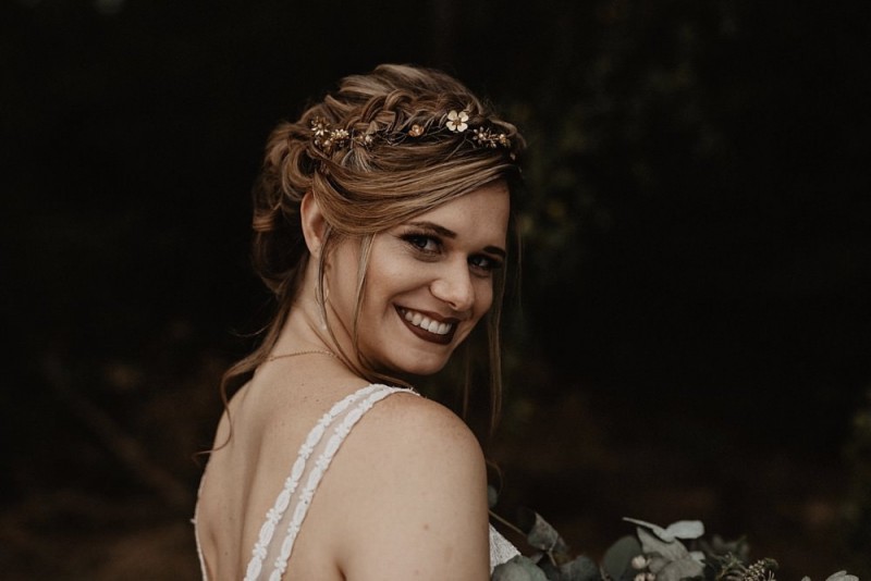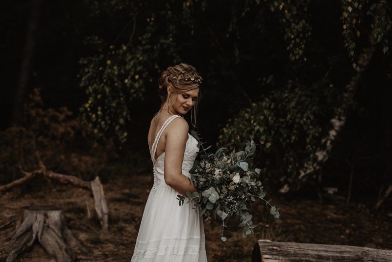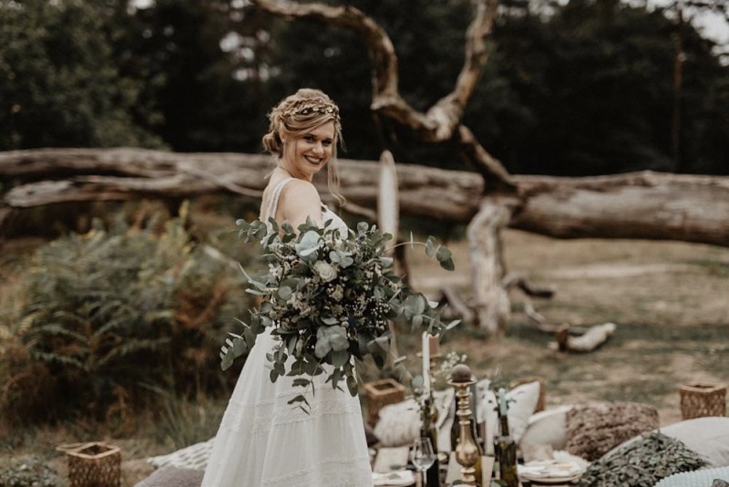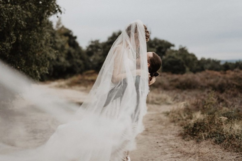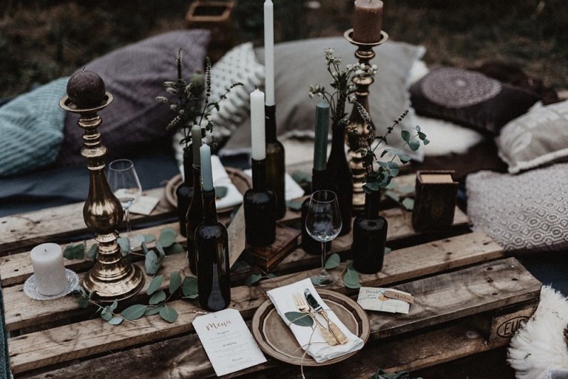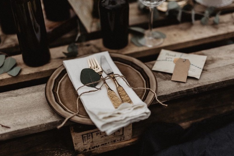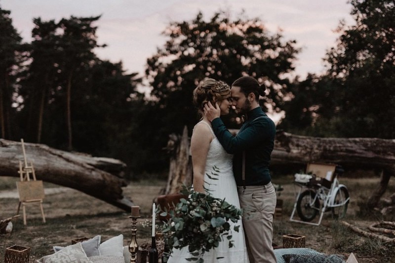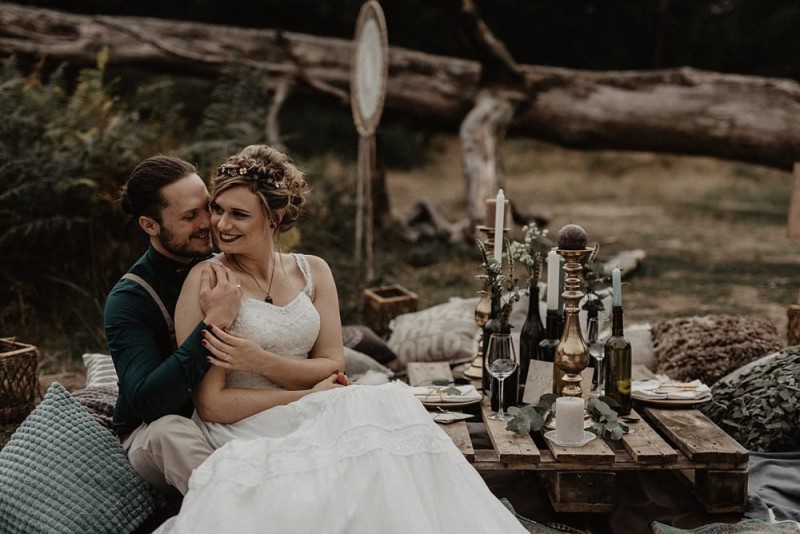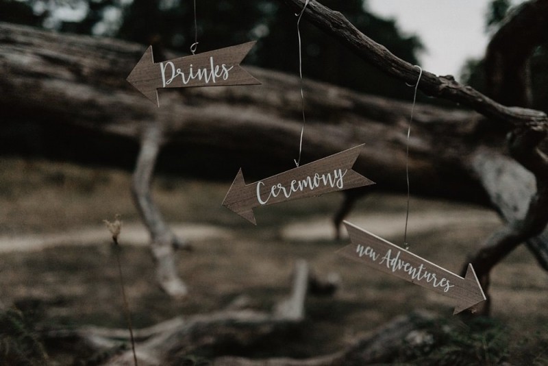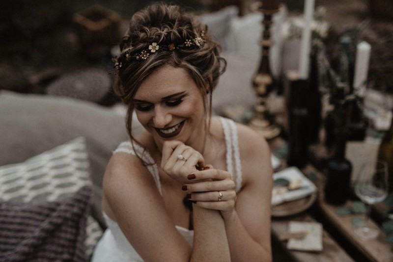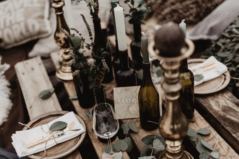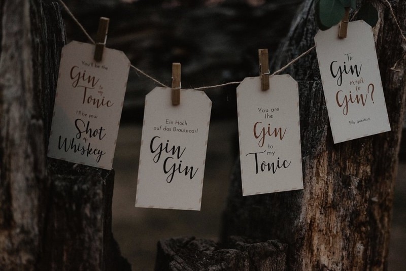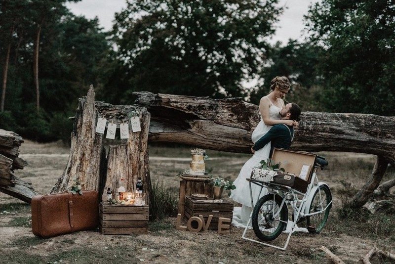 Die dekorativen Details sind nicht nur wunderschön anzusehen, sie sind auch voller Charaktere. Altes, wie zum Beispiel die Paletten für die coole Gin- und Salty Bar, das Fahrrad oder die Kerzenständer aus Altglas, findet zu neuem Glanz. DIY leicht gemacht. heartbeat PROJECTSkreierte diese besondere Dekoration und die wilde Floristik. Die passende Papeterie aus Kraftpapier, entworfen von Frau Kopfkino, greift die Reiselust auf und ist an die Weltkarte angelehnt und mit Reisezitaten verziert. Edel wird es, neben den goldenen Details in der Dekoration, durch den zarten Goldschmuck der Braut von Refined Bohemia, ihr anmutiges und schickes Styling von Ivonne Frerix und durch ihr tolles Brautkleid samt langem Schleier von White Design Rhein. Die coolen Schilder designte Claudia’s Kreativitäten. All diese kleinen und großen Details, dieses Zusammenspiel, wie auch die Staffelei, der alte Koffer samt Polaroidkamera in Kombination mit der glamourösen Hochzeitstorte in Gold von Christiane’s Conditor Creations, zeigt so wundervoll wie verschiedene Stile, Materialien und Farben eingesetzt werden können. Ich bin total verliebt und wünsche euch ganz viel Freude mit dieser wunderschönen Hochzeitsinspiration aus der Wahner Heide, voller Wildheit und Vintageliebe!
