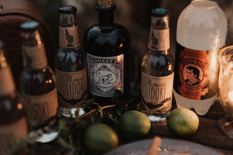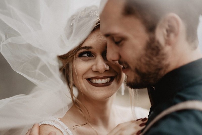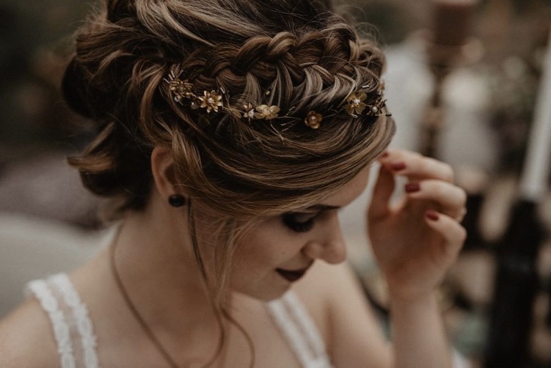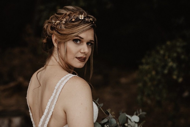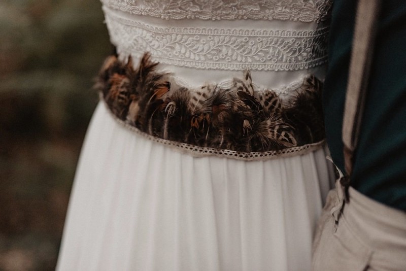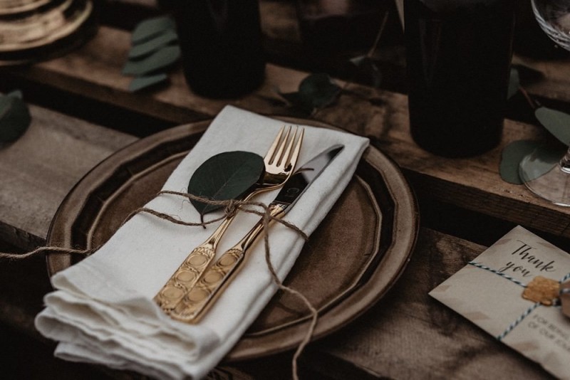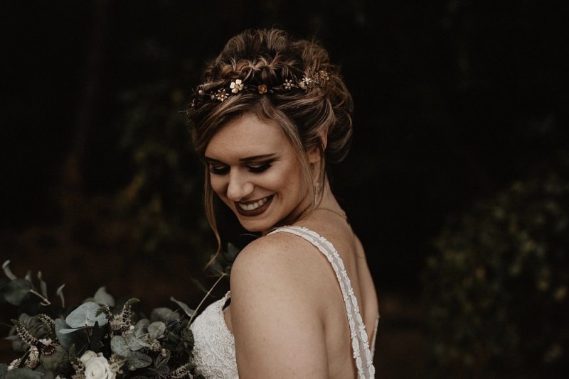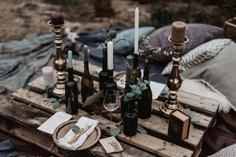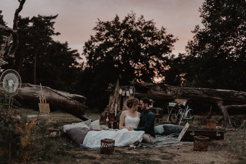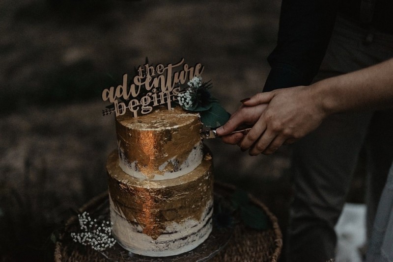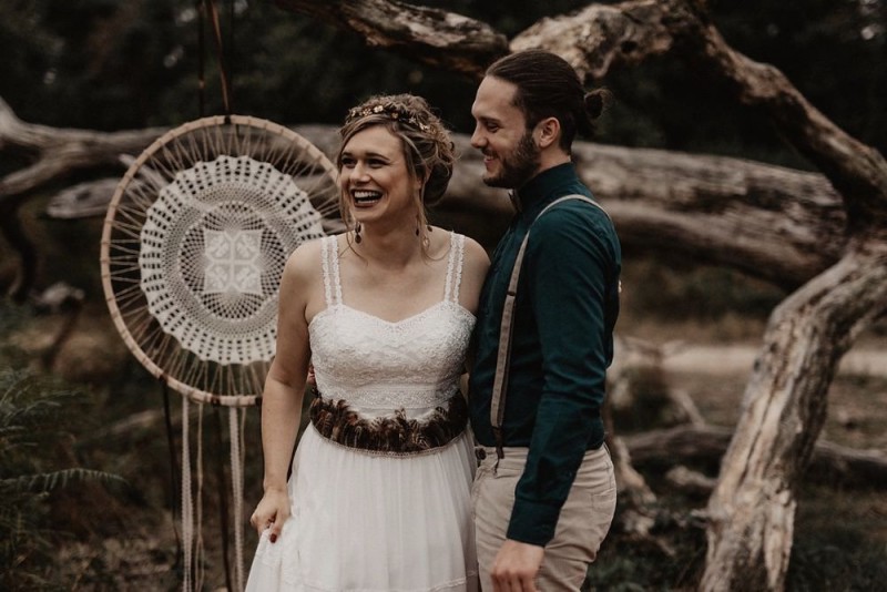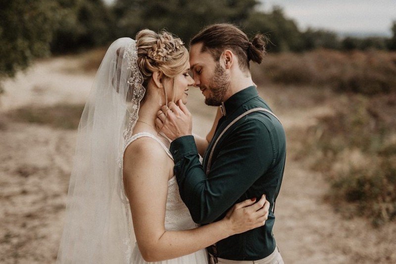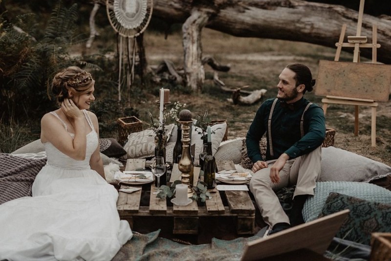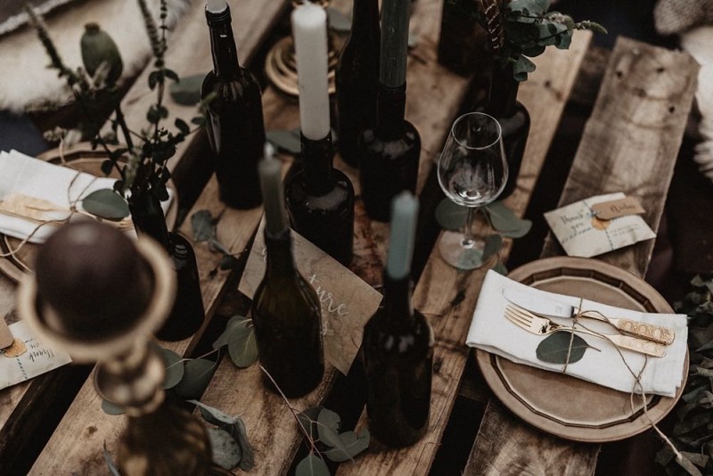 Die dekorativen Details sind nicht nur wunderschön anzusehen, sie sind auch voller Charaktere. Altes, wie zum Beispiel die Paletten für die coole Gin- und Salty Bar, das Fahrrad oder die Kerzenständer aus Altglas, findet zu neuem Glanz. DIY leicht gemacht. heartbeat PROJECTSkreierte diese besondere Dekoration und die wilde Floristik. Die passende Papeterie aus Kraftpapier, entworfen von Frau Kopfkino, greift die Reiselust auf und ist an die Weltkarte angelehnt und mit Reisezitaten verziert. Edel wird es, neben den goldenen Details in der Dekoration, durch den zarten Goldschmuck der Braut von Refined Bohemia, ihr anmutiges und schickes Styling von Ivonne Frerix und durch ihr tolles Brautkleid samt langem Schleier von White Design Rhein. Die coolen Schilder designte Claudia’s Kreativitäten. All diese kleinen und großen Details, dieses Zusammenspiel, wie auch die Staffelei, der alte Koffer samt Polaroidkamera in Kombination mit der glamourösen Hochzeitstorte in Gold von Christiane’s Conditor Creations, zeigt so wundervoll wie verschiedene Stile, Materialien und Farben eingesetzt werden können. Ich bin total verliebt und wünsche euch ganz viel Freude mit dieser wunderschönen Hochzeitsinspiration aus der Wahner Heide, voller Wildheit und Vintageliebe!