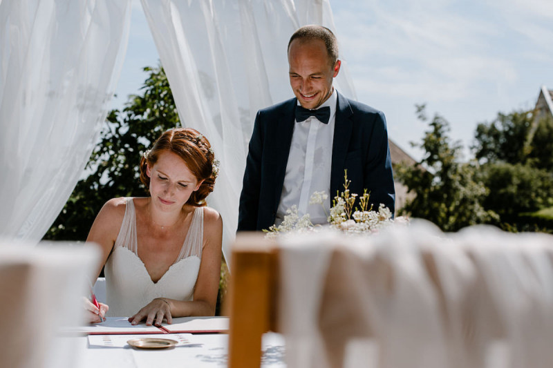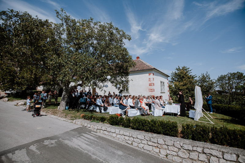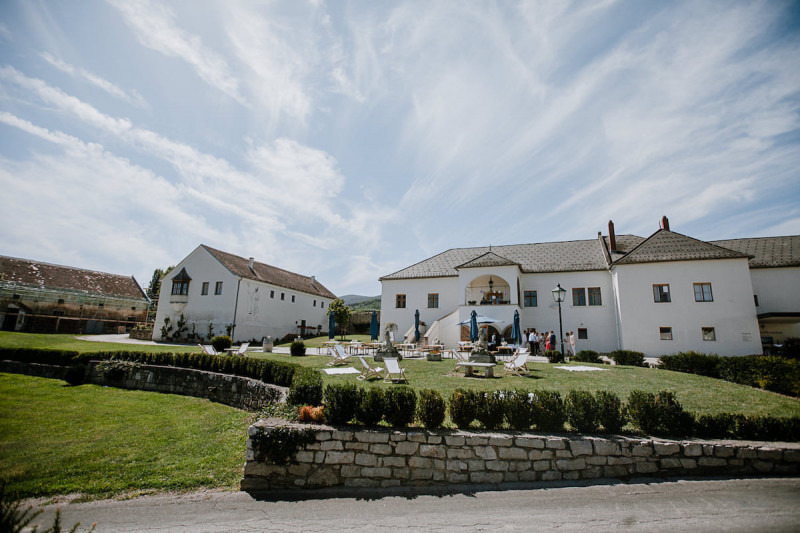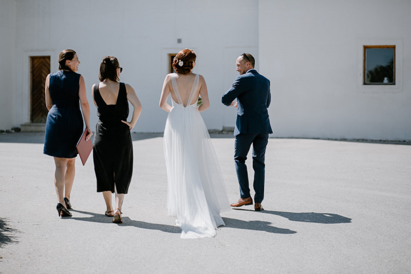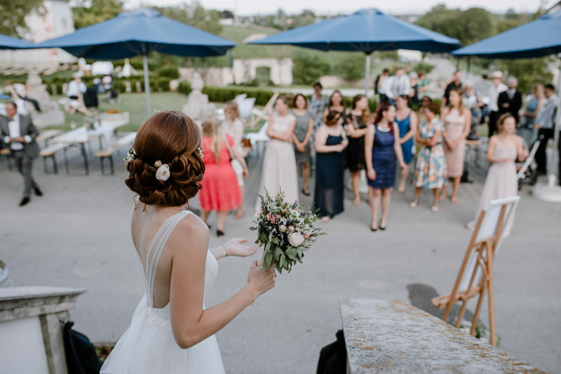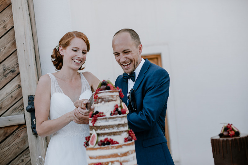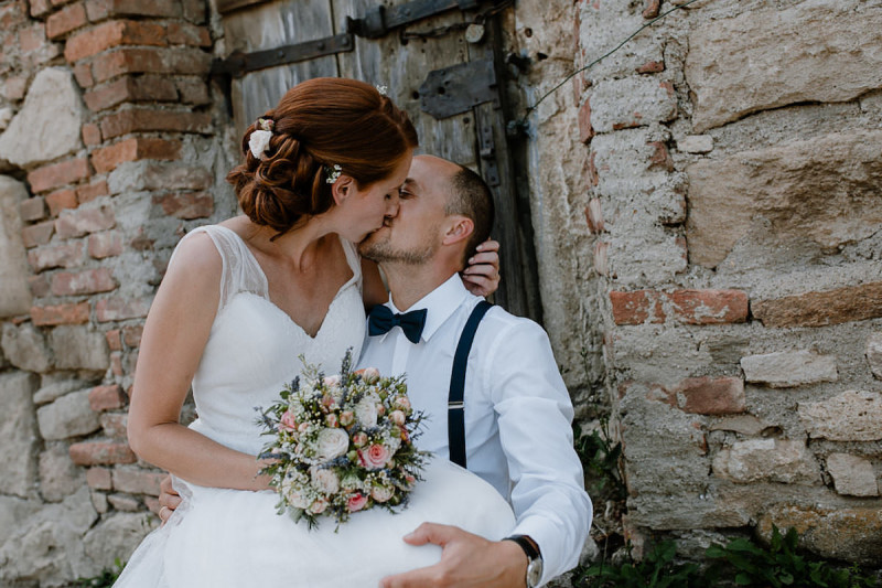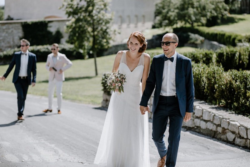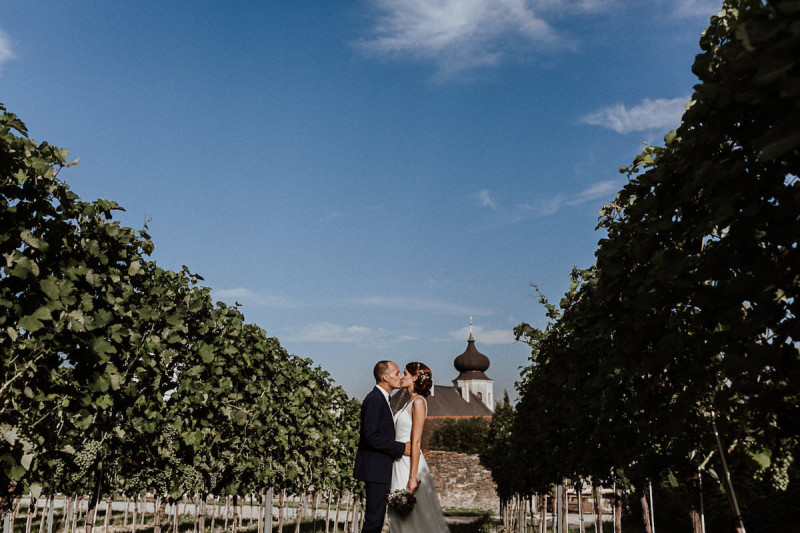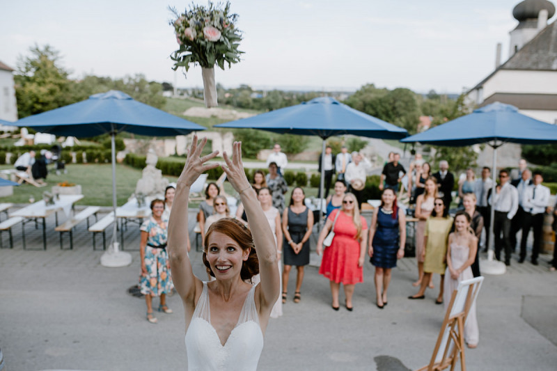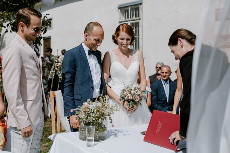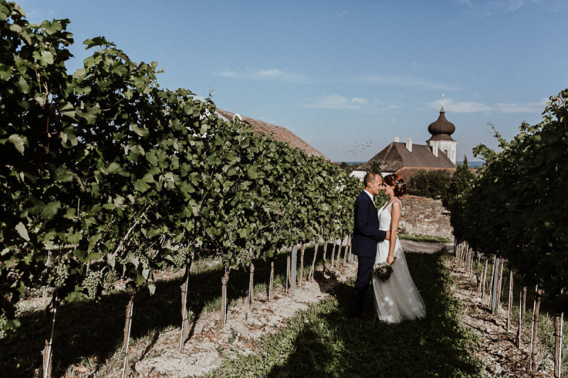 Wer jetzt im Dezember von warmen Sonnenstrahlen träumt, der ist bei dieser Hochzeitsreportage genau richtig. Die Sommerhochzeit von Eli & Lukas, samt standesamtlicher Trauung unter freiem Himmel, bietet wirklich alles für’s sommerliebende Herz! Am 5. Juli diesen Jahres fand diese tolle Hochzeit im ruhig gelegenen Freigut Thallern, einem Weingut in Niederösterreich, statt. Hochzeitsfotografin Anna Obermeier Photography begleitete den Hochzeitstag der beiden fotografisch, weshalb wir uns heute ins sonnige Österreich träumen dürfen. Und es gibt wie immer einiges zu entdecken. Im hellen Klostergasthaus wurde alles sommerlich frisch geschmückt für das Hochzeitsessen. Die Braut selbst hat sich dabei sowohl um die Dekoration als auch die Floristik gekümmert. Nur beim Brautstrauß wählte sie die professionelle Kreation von Blumen Schonsky. In einem zart fließenden Brautkleid mit grandiosem Rückenausschnitt, von Heyday, und einem sommerlich leichten Styling von Haarcult Baden, ging es für sie und Lukas, in einem Anzug von Peek & Cloppenburg, gemeinsam zur standesamtlichen Trauung in den weißen Garten des Freiguts. Wie im Gasthaus wählte Eli hier vor allem unschuldiges Weiß und frischte es mit einigen zarten Farbtupfern in der Floristik auf. Nach der Trauung und der wohl schönsten Unterschrift, gab es für die Hochzeitsgesellschaft eine leckere Erfrischung und einen traumhaften Sweet Table. Wenn zwei Schokoholics heiraten… Fruchtig frisch trifft auf saftiges Nougat und Schokolade. Aber staunt selbst! Für das Brautpaarshooting ging es selbstverständlich in die Weinberge und durch den Garten des Weinguts. Unter der warmen Abendsonne und den vielen Apfelbäumen sind einige tolle Hochzeitsbilder entstanden. Das süße Brautpaar zeigt sich hier, wie ihre ganze Hochzeit, locker und entspannt. Ganz viel Spaß euch mit all diesen Eindrücken und Details dieser feinen Sommerhochzeit in Niederösterreich!
