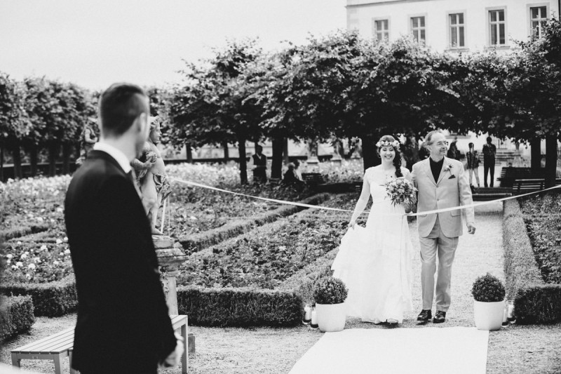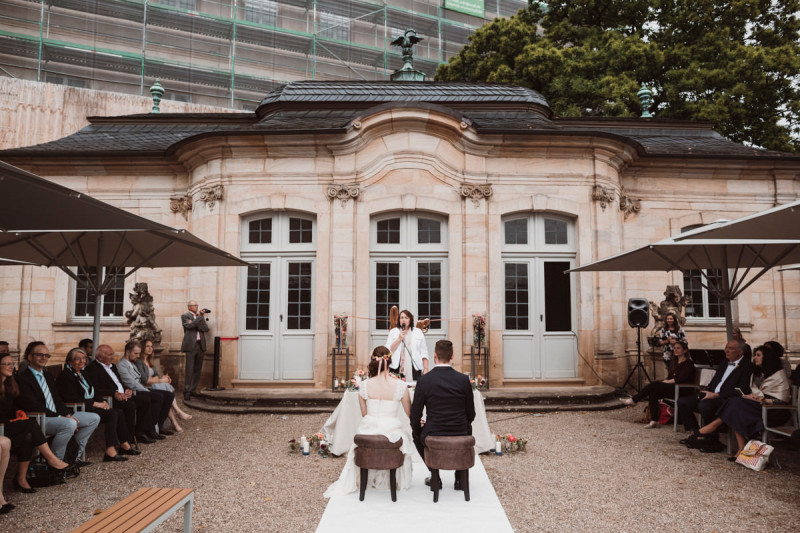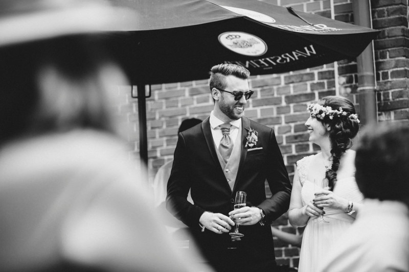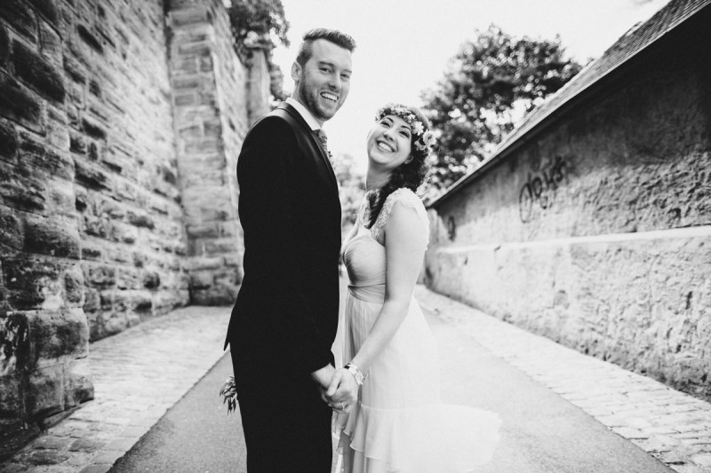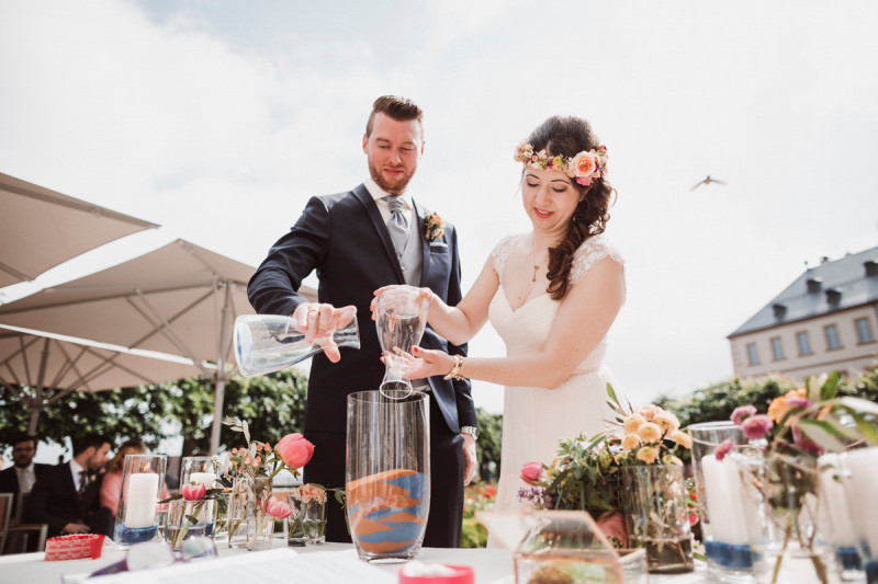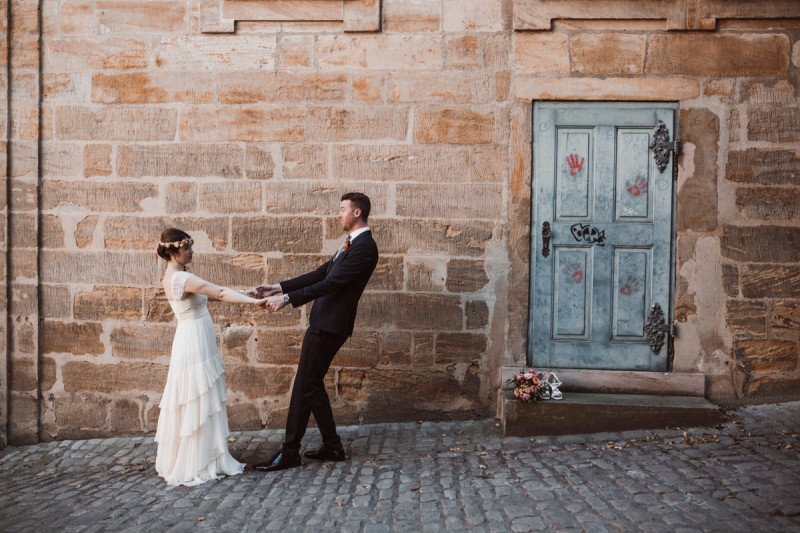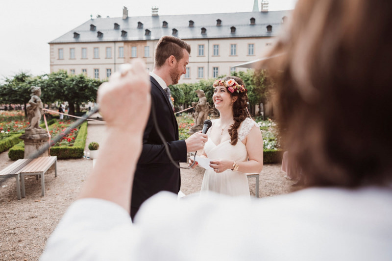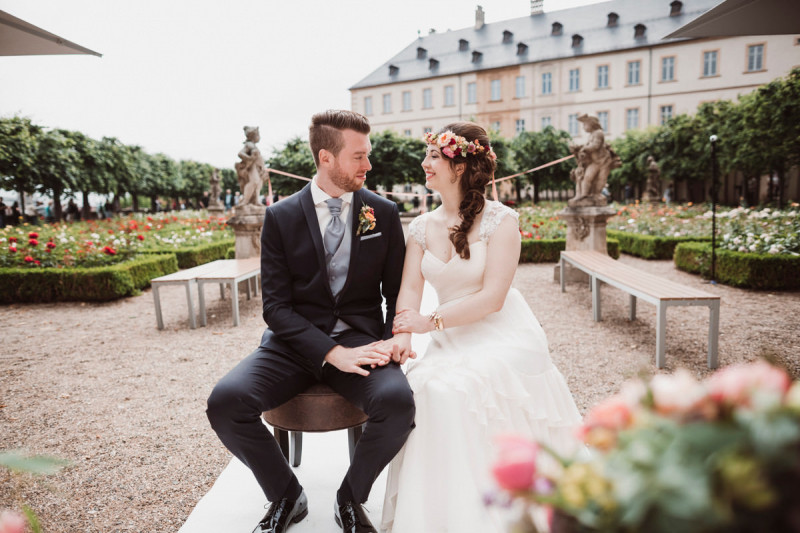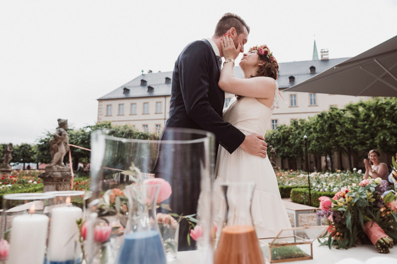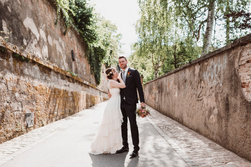Am 10. Juni 2017 feierten Janna & Bret ihre Liebe, bei einer freien Trauung, im wunderschönen Rosengarten am Domplatz in Bamberg. Gemeinsam mit ihren liebsten Menschen, ging es nach der romantischen Trauung im Freien, in den Ziegelbau, wo ordentlich gefeiert wurde. Um sich der Vorfreude völlig stressfrei hingeben zu können, gab das Brautpaar die gesamte Organisation an Christine Görtz von Bube Dame Görtz, die gemeinsam mit der Dekoration von CK-Deal, den perfekten Hochzeitstag arrangierte. Das Styling der Braut ist von Simone Weghorn. Ich bin total verliebt in die tolle Location und die aufregende Umsetzung einer Trauung im Freien, mit Wohnzimmercharm. Ein Hingucker ist auch die Scotch & Whisky  Bar! Begleitet wurde der große Tag der beiden von Mario Schmitt. Lasst euch inspirieren!