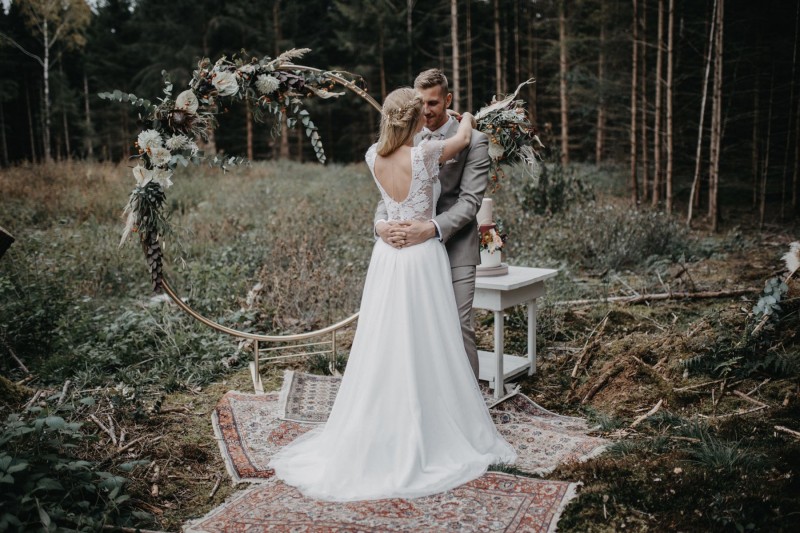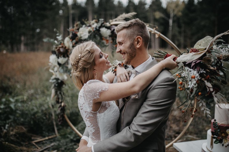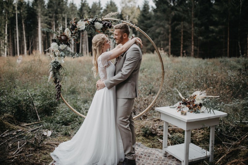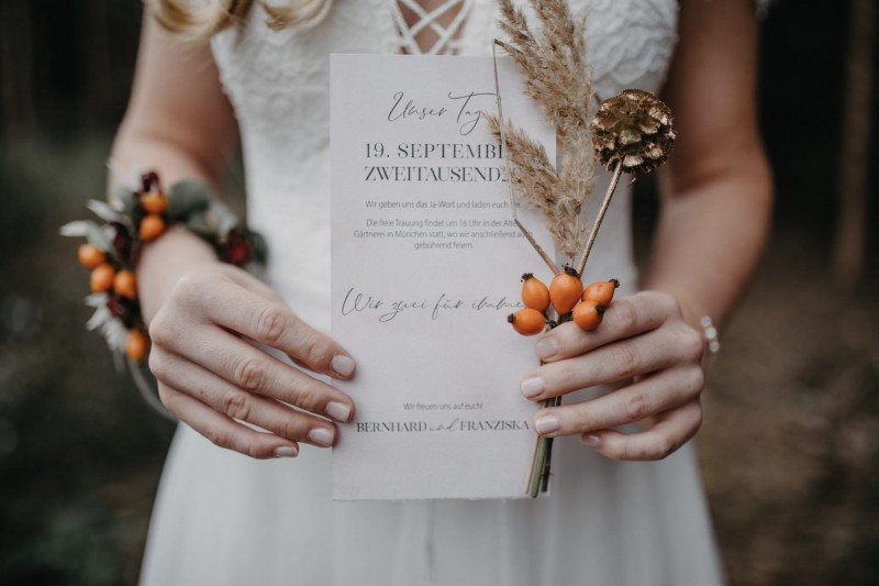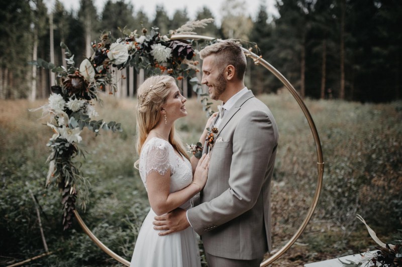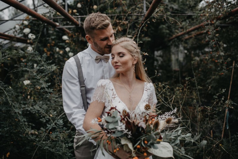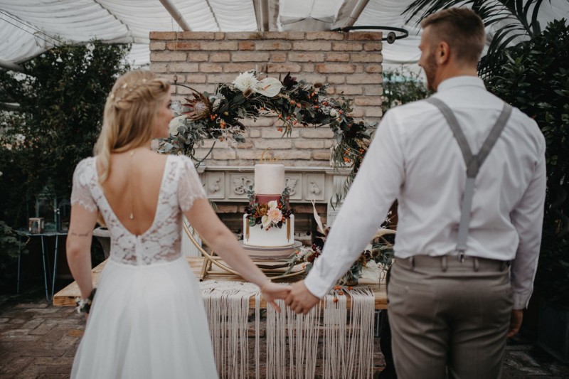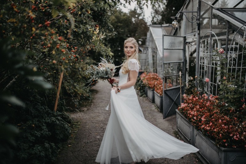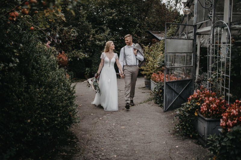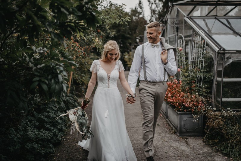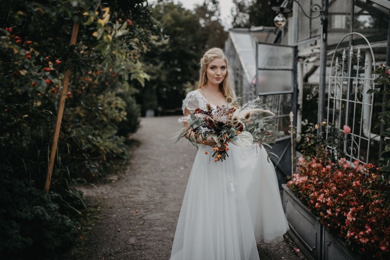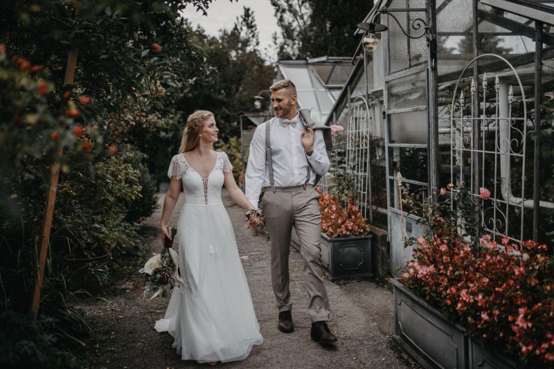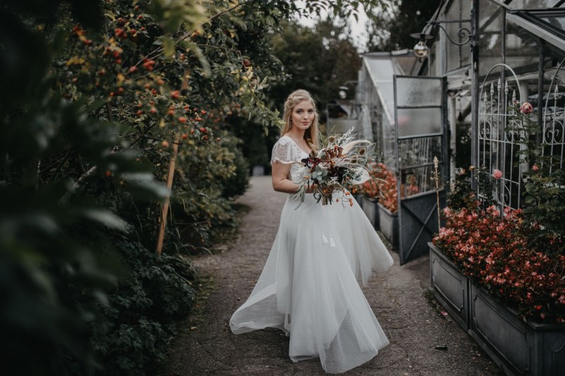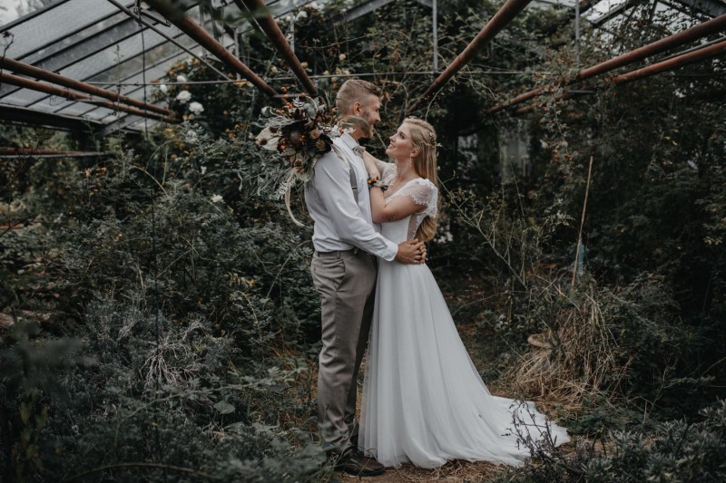 September diesen Jahres. Die Alte Gärtnerei Taufkirchen, ihre verwunschenen Gewächshäuser, die wild zugewachsen sind. Dazu bohoinspirierte Floristik sowie Dekoration in Farben, die den goldenen Herbst nicht schöner zeichnen könnten. Und mitten drin ein verliebtes Brautpaar. Das und noch mehr erwartet euch in dieser wunderschönen Inspiration für herbstliche Bohohochzeiten. Die Liebe zum goldenen Herbst ist wohl einfach erklärt. Das Beste aus zwei Jahreszeiten trifft aufeinander. Die letzten warmen Sonnenstrahlen des Sommers zeigen sich und treffen auf das besondere Spiel leuchtender Farben, die es so nur im Herbst gibt. Das und eine ordentliche Portion Boholiebe gibt es für euch nun in dieser Hochzeitsinspiration. In den verwachsenen Gewächshäusern und weiteren gemütlichen Räumen dieser Location, hielt Hochzeitsfotografin Sarah von Wildflower Blossoms Photography jedes zauberhafte Detail dieses Styled Shoots für uns fotografisch fest. In den romantischen und zugleich verspielten Räumlichkeiten dieser Münchener Location, kreierte Blütenstil und Blattwerk Gastl einige floristische Highlights. Ob opulentes Centerpiece auf dem Tisch, hängende Flowerloops oder florale Ergänzung zum Platzkärtchen – die warmen Farbtöne und die Farbtupfer in Gold ziehen sich durch das gesamte Konzept. Die warmen Holztöne und das frische Grün von Sukkulenten und Eukalyptus laden, neben großen Makramees und indirektem Licht, ebenfalls ein. Die gesamte Hochzeitpapeterie, gestaltet von marygoesaround, die einen der Flowerloops übrigens zu einem wunderschönen Sitzplan macht, greift dieses warme und natürliche Konzept perfekt auf. Wie die Dekoration und Floristik nicht überladen, sondern zurückhaltend aber ausdrucksstark. In dieser wunderschönen Szenerie durfte das Brautpaar, Laura & Dominik, den ganzen Tag verbringen. Hierfür schlüpfte die hübsche Laura in ein Brautkleid von Herve Paris via Brautmoden Melanie und feine Brautschuhe von Elsa Coloured Shoes. Der fließende Stoff ihres Rocks und die feinen Spitzendetails am Oberteil, sowie der tiefausgeschnittene, semi-transparente Rücken, sind einfach zu schön! Ihr zartes Hair & Makeup, kreiert von Lisa Fesenmeir, wurde durch den zarten Haar- & Brautschmuck von Crystal Art Schmuckdesign perfekt in Szene gesetzt. Ihr opulenter Brautstrauß, ebenfalls kreiert von Blütenstil und Blattwerk Gastl und ganz im floralen Konzept gehalten, rundet ihren leichten sowie verspielten Look mit seinen herbstlichen Details perfekt ab. Und natürlich wurde auch Dominik entsprechend eingekleidet. Er trägt ein Outfit von Wilvorst via Eckerle Herrenausstatter. Das helle Grau passt einfach perfekt in das Farbkonzept und wirkt elegant aber legere. Nach dem Getting Ready ging es für die beiden nach draußen, wo eine Feld und Wiesen Idylle, mit weißen Stühlen, auf Teppichen stehend und mit Blumen verziert, auf sie wartete. Hier vor dem großen, mit Blumen geschmückten, runden Traubogen fand ihre freie Trauung mit Traurednerin Birgitta Lauterbach statt. Eine emotionale Zeremonie, mit der die beiden einander feierten und mit den Trauringen von Sandra Rohrhirsch besiegelten. Zur Feier des Tages gab es natürlich auch eine Hochzeitstorte, die fast zu schade war, für den Anschnitt. Auch hier finden sich die warmen Farbtöne, das glitzernde Gold und die runden Blumendetails. Sie wurde von Tortenstudio Sweet Diana kreiert und perfekt abgestimmt. Wer an dieser Stelle sein Herz an diese Inspiration noch nicht verloren hat, den wird spätestens das romantische Brautpaarshooting in den verwachsenen Gewächshäusern einfangen. Eine wirklich magische Kulisse. Verliebte Blicke inklusive!
