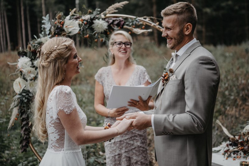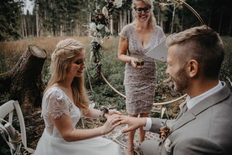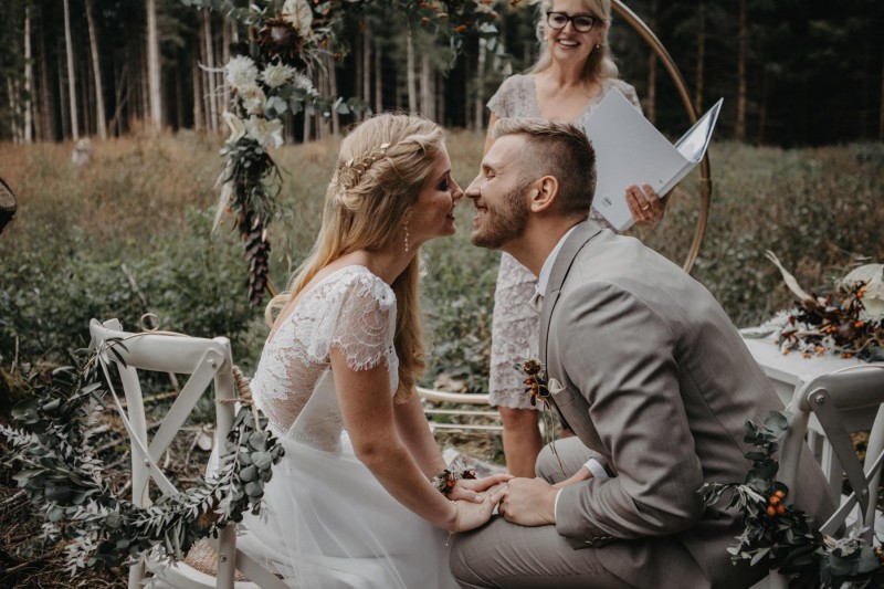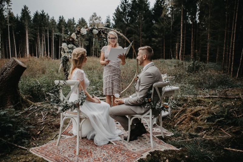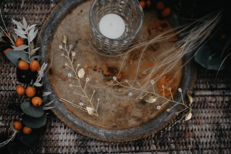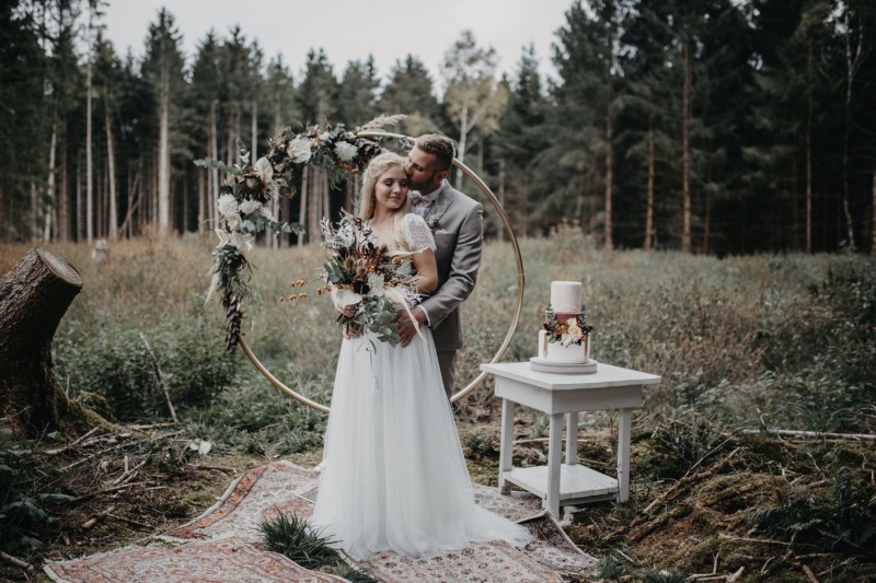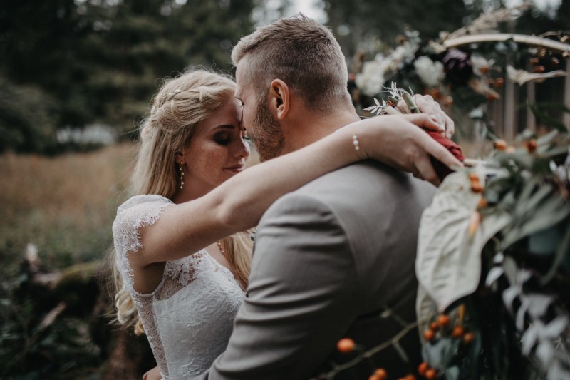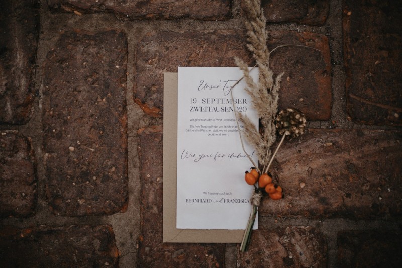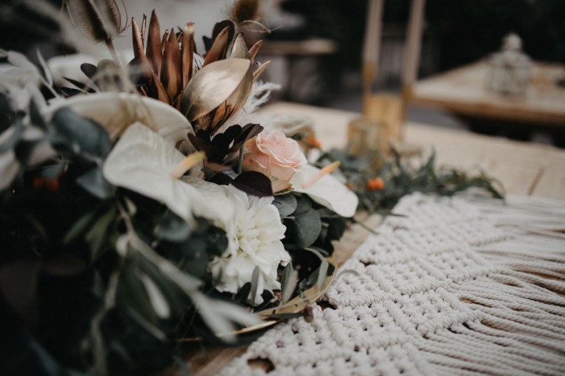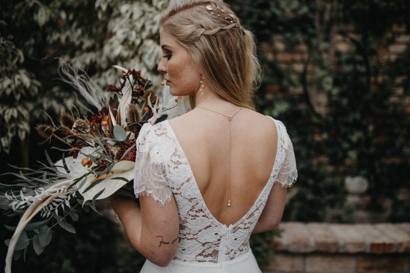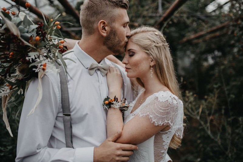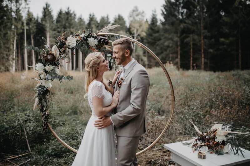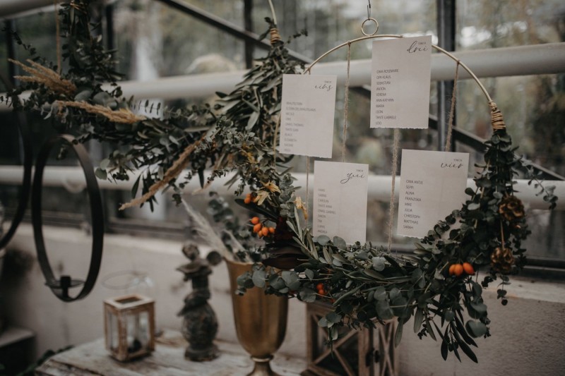 September diesen Jahres. Die Alte Gärtnerei Taufkirchen, ihre verwunschenen Gewächshäuser, die wild zugewachsen sind. Dazu bohoinspirierte Floristik sowie Dekoration in Farben, die den goldenen Herbst nicht schöner zeichnen könnten. Und mitten drin ein verliebtes Brautpaar. Das und noch mehr erwartet euch in dieser wunderschönen Inspiration für herbstliche Bohohochzeiten. Die Liebe zum goldenen Herbst ist wohl einfach erklärt. Das Beste aus zwei Jahreszeiten trifft aufeinander. Die letzten warmen Sonnenstrahlen des Sommers zeigen sich und treffen auf das besondere Spiel leuchtender Farben, die es so nur im Herbst gibt. Das und eine ordentliche Portion Boholiebe gibt es für euch nun in dieser Hochzeitsinspiration. In den verwachsenen Gewächshäusern und weiteren gemütlichen Räumen dieser Location, hielt Hochzeitsfotografin Sarah von Wildflower Blossoms Photography jedes zauberhafte Detail dieses Styled Shoots für uns fotografisch fest. In den romantischen und zugleich verspielten Räumlichkeiten dieser Münchener Location, kreierte Blütenstil und Blattwerk Gastl einige floristische Highlights. Ob opulentes Centerpiece auf dem Tisch, hängende Flowerloops oder florale Ergänzung zum Platzkärtchen – die warmen Farbtöne und die Farbtupfer in Gold ziehen sich durch das gesamte Konzept. Die warmen Holztöne und das frische Grün von Sukkulenten und Eukalyptus laden, neben großen Makramees und indirektem Licht, ebenfalls ein. Die gesamte Hochzeitpapeterie, gestaltet von marygoesaround, die einen der Flowerloops übrigens zu einem wunderschönen Sitzplan macht, greift dieses warme und natürliche Konzept perfekt auf. Wie die Dekoration und Floristik nicht überladen, sondern zurückhaltend aber ausdrucksstark. In dieser wunderschönen Szenerie durfte das Brautpaar, Laura & Dominik, den ganzen Tag verbringen. Hierfür schlüpfte die hübsche Laura in ein Brautkleid von Herve Paris via Brautmoden Melanie und feine Brautschuhe von Elsa Coloured Shoes. Der fließende Stoff ihres Rocks und die feinen Spitzendetails am Oberteil, sowie der tiefausgeschnittene, semi-transparente Rücken, sind einfach zu schön! Ihr zartes Hair & Makeup, kreiert von Lisa Fesenmeir, wurde durch den zarten Haar- & Brautschmuck von Crystal Art Schmuckdesign perfekt in Szene gesetzt. Ihr opulenter Brautstrauß, ebenfalls kreiert von Blütenstil und Blattwerk Gastl und ganz im floralen Konzept gehalten, rundet ihren leichten sowie verspielten Look mit seinen herbstlichen Details perfekt ab. Und natürlich wurde auch Dominik entsprechend eingekleidet. Er trägt ein Outfit von Wilvorst via Eckerle Herrenausstatter. Das helle Grau passt einfach perfekt in das Farbkonzept und wirkt elegant aber legere. Nach dem Getting Ready ging es für die beiden nach draußen, wo eine Feld und Wiesen Idylle, mit weißen Stühlen, auf Teppichen stehend und mit Blumen verziert, auf sie wartete. Hier vor dem großen, mit Blumen geschmückten, runden Traubogen fand ihre freie Trauung mit Traurednerin Birgitta Lauterbach statt. Eine emotionale Zeremonie, mit der die beiden einander feierten und mit den Trauringen von Sandra Rohrhirsch besiegelten. Zur Feier des Tages gab es natürlich auch eine Hochzeitstorte, die fast zu schade war, für den Anschnitt. Auch hier finden sich die warmen Farbtöne, das glitzernde Gold und die runden Blumendetails. Sie wurde von Tortenstudio Sweet Diana kreiert und perfekt abgestimmt. Wer an dieser Stelle sein Herz an diese Inspiration noch nicht verloren hat, den wird spätestens das romantische Brautpaarshooting in den verwachsenen Gewächshäusern einfangen. Eine wirklich magische Kulisse. Verliebte Blicke inklusive!