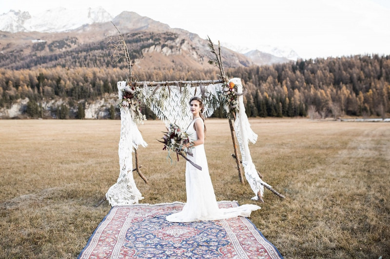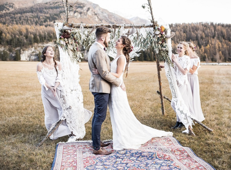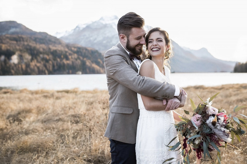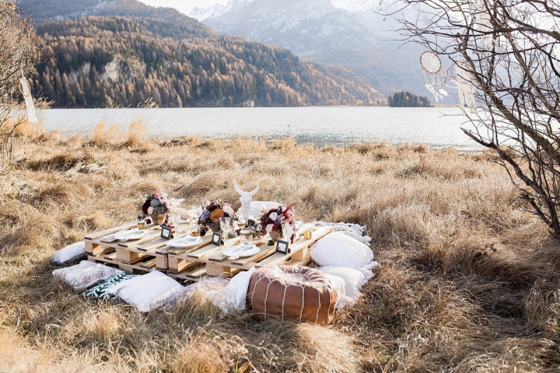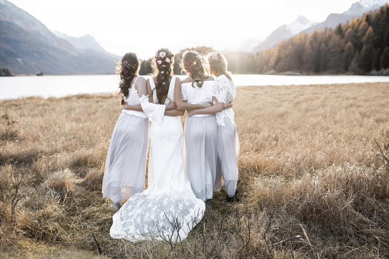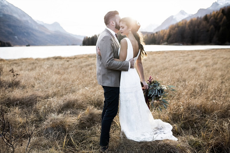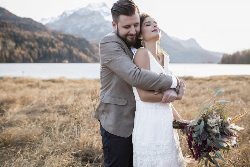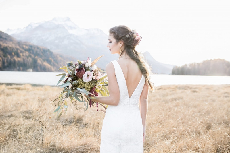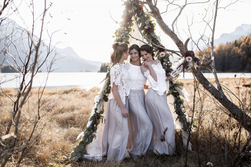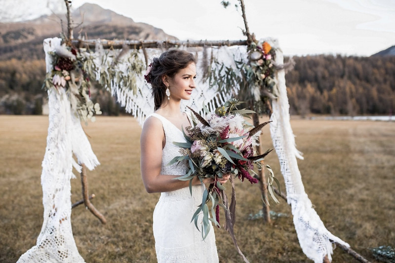 Dieses wunderschöne Styled Shoot eines verträumten Elopements am Silsersee, hat es mir total angetan! Das herbstliche Abendlicht scheint auf das Brautpaar herab, während sie umgeben von Bergen und Wäldern, eine Elopement Wedding feiern. Die wilde Floristik von Fleur Deluxe, die bezaubernde Dekoration von Tipiyeah und die liebevolle Papeterie von YourSign, hüllen das Paar in einen Traum aus Boho und Vintage ein. Gold, Orange, Rot und Magenta greifen die herbstliche Stimmung auf, während Grau-, Silber- und Grüntöne die Verbindung zum Wasser schaffen. Es entsteht ein Einklang mit der Natur. Durch die verwendete Floristik wie Protea, Pampasgras, Sukkulenten, Eukalyptus aber auch Federn und Granatäpfeln, bleibt es spektakulär. Das zarte Brautkleid mit tiefem Rückenausschnitt von Lacely lässt die Braut mit der harmonischen Kulisse um die Wette strahlen. Auch ihr Makeup von Miracle Beauty & Makeup ist in den warmen Farbtönen gehalten. Zur Unterstützung hat die Braut ihre geliebten Brautjungfern dabei. Sie führen sie zu ihrem Bräutigam, der am imposanten Traubogen schon auf seine Braut wartet. Geschminkt wurden die Brautjungfern von Tania Vernucci. Der Schmuck ist von Boutique Steinkult. Gefeiert wird die Liebe des Brautpaares an einem wundervoll gedeckten Tisch, der mit einer Hochzeitstorte von Cake Ladies Switzerland aufwartet. Festgehalten hat diese grandiose Hochzeitsinspiration Melanie Munoz Photography. Lasst euch von den warmen Farbtönen, dem weichem Licht und den Funken zwischen dem Brautpaar, verzaubern!