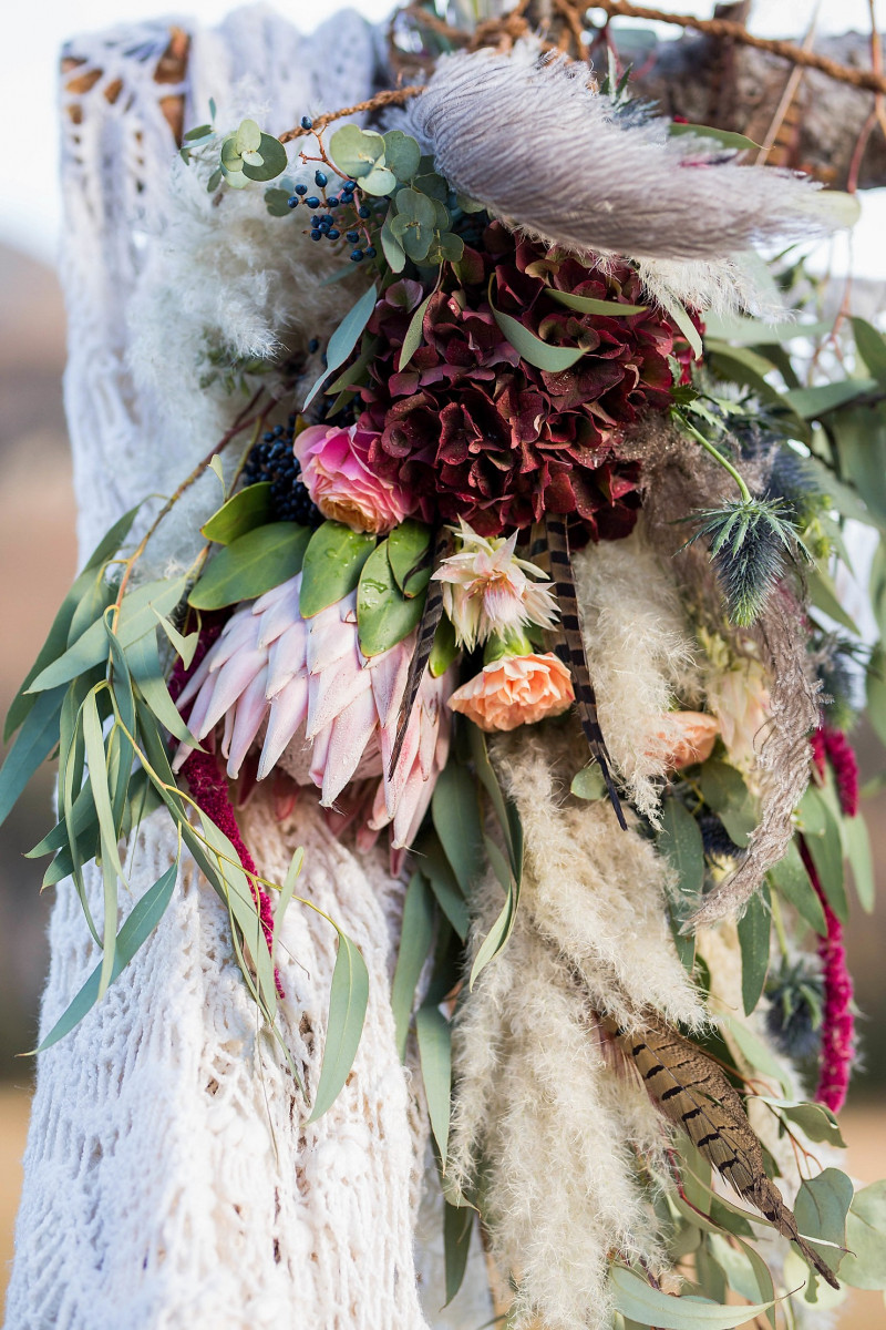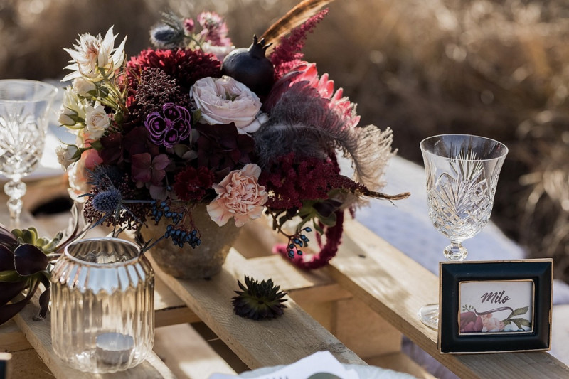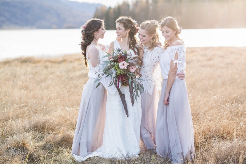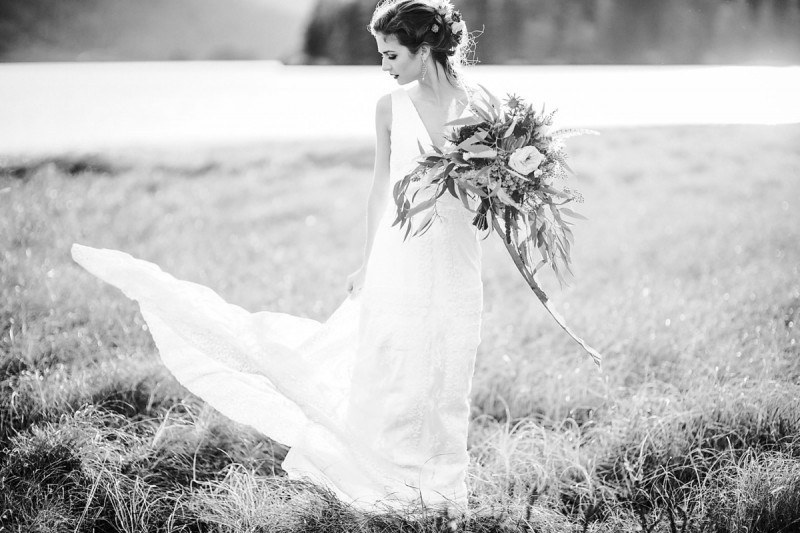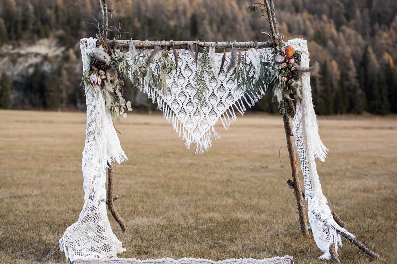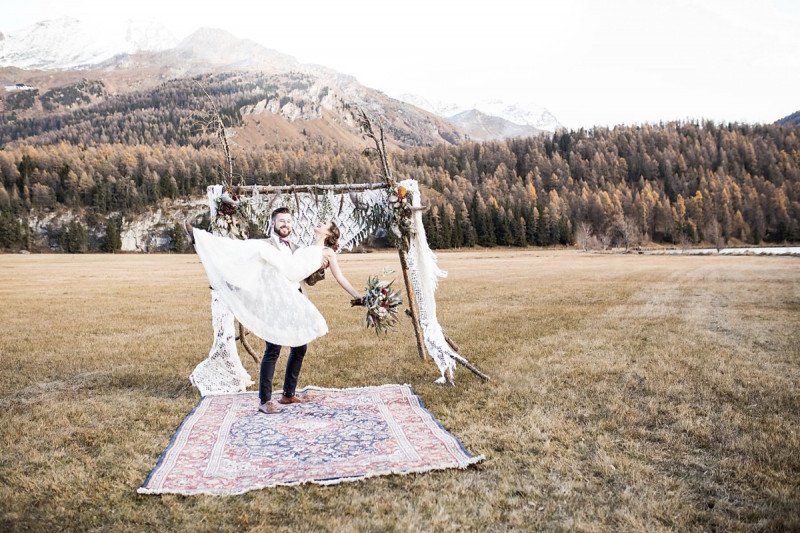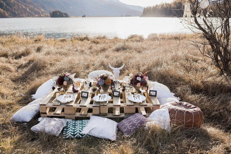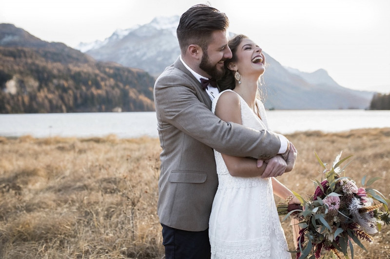 Dieses wunderschöne Styled Shoot eines verträumten Elopements am Silsersee, hat es mir total angetan! Das herbstliche Abendlicht scheint auf das Brautpaar herab, während sie umgeben von Bergen und Wäldern, eine Elopement Wedding feiern. Die wilde Floristik von Fleur Deluxe, die bezaubernde Dekoration von Tipiyeah und die liebevolle Papeterie von YourSign, hüllen das Paar in einen Traum aus Boho und Vintage ein. Gold, Orange, Rot und Magenta greifen die herbstliche Stimmung auf, während Grau-, Silber- und Grüntöne die Verbindung zum Wasser schaffen. Es entsteht ein Einklang mit der Natur. Durch die verwendete Floristik wie Protea, Pampasgras, Sukkulenten, Eukalyptus aber auch Federn und Granatäpfeln, bleibt es spektakulär. Das zarte Brautkleid mit tiefem Rückenausschnitt von Lacely lässt die Braut mit der harmonischen Kulisse um die Wette strahlen. Auch ihr Makeup von Miracle Beauty & Makeup ist in den warmen Farbtönen gehalten. Zur Unterstützung hat die Braut ihre geliebten Brautjungfern dabei. Sie führen sie zu ihrem Bräutigam, der am imposanten Traubogen schon auf seine Braut wartet. Geschminkt wurden die Brautjungfern von Tania Vernucci. Der Schmuck ist von Boutique Steinkult. Gefeiert wird die Liebe des Brautpaares an einem wundervoll gedeckten Tisch, der mit einer Hochzeitstorte von Cake Ladies Switzerland aufwartet. Festgehalten hat diese grandiose Hochzeitsinspiration Melanie Munoz Photography. Lasst euch von den warmen Farbtönen, dem weichem Licht und den Funken zwischen dem Brautpaar, verzaubern!