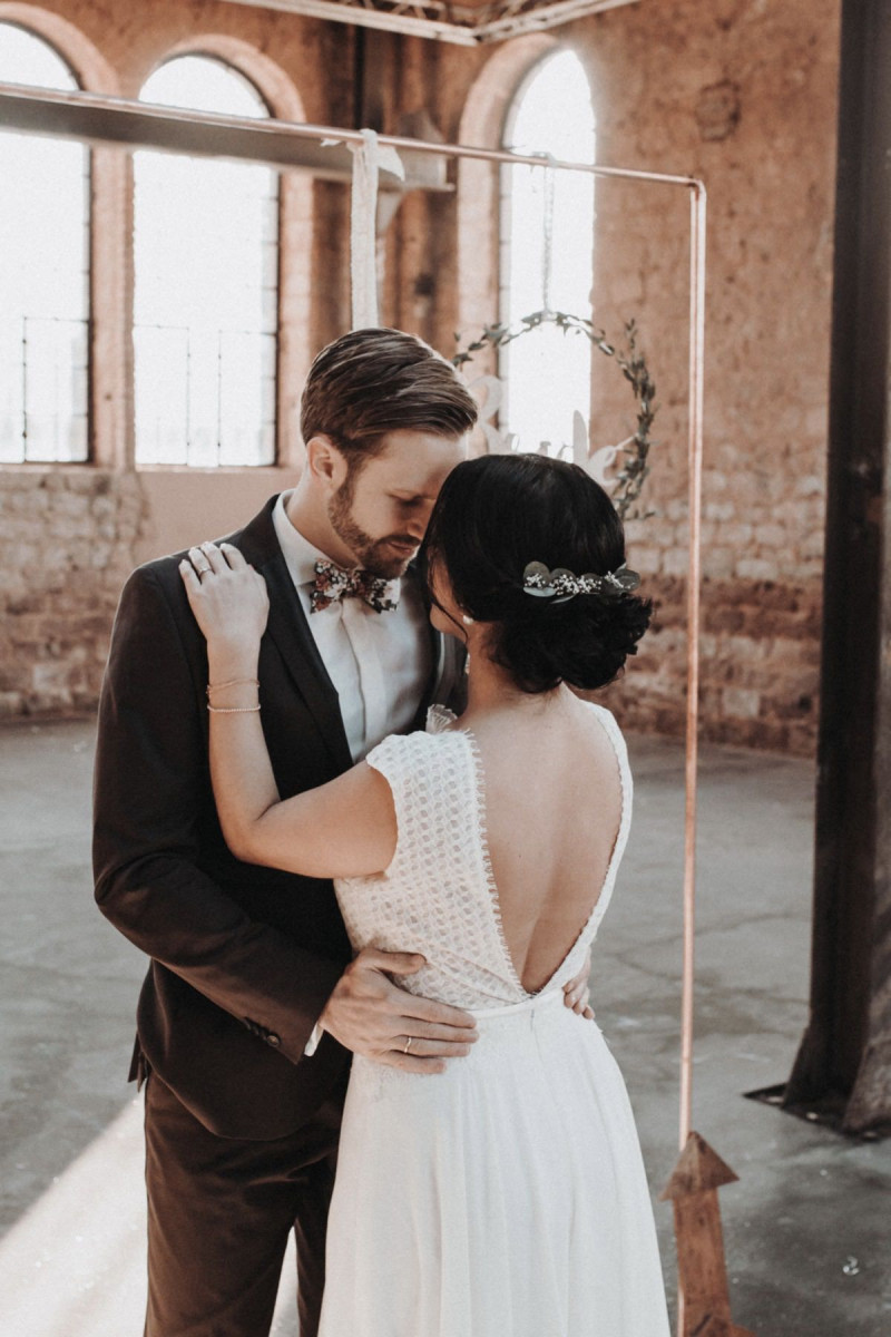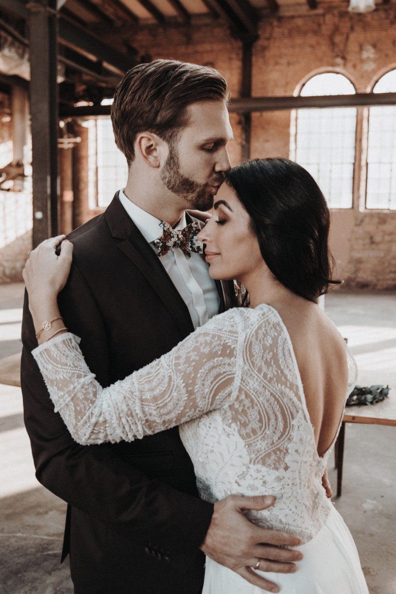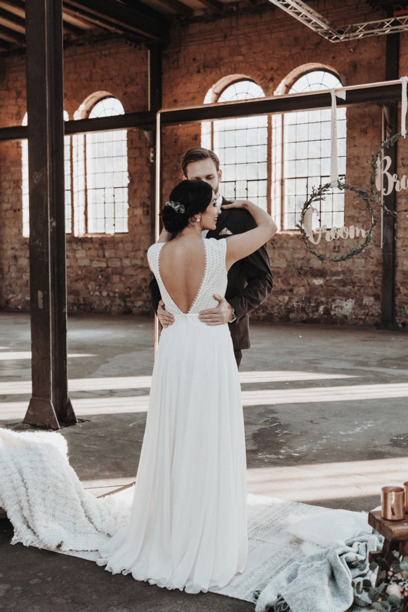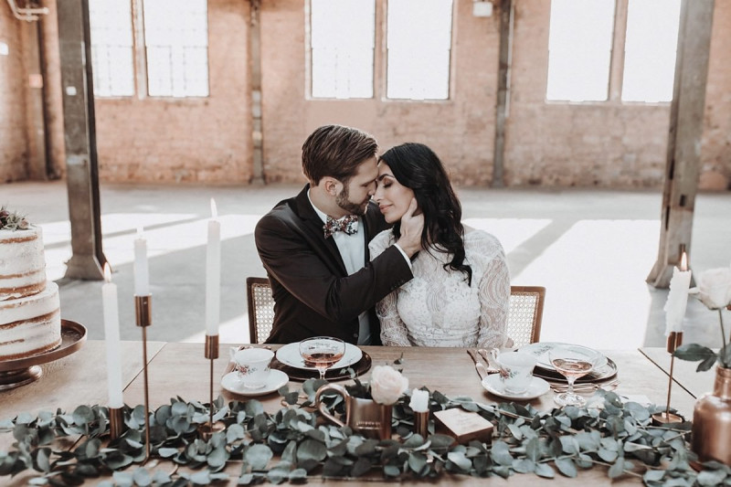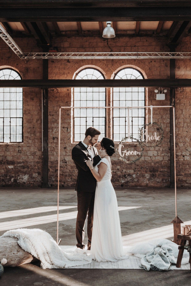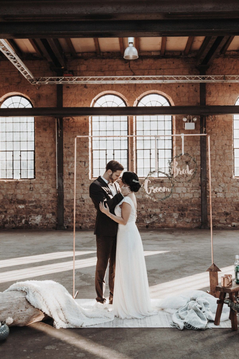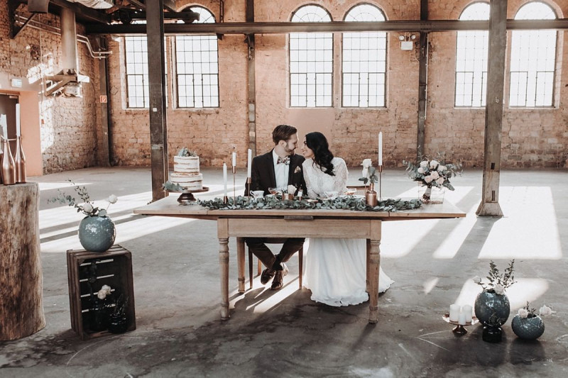 Dies ist die zweite Hochzeitsinspiration einer Industrial Wedding, das auf dem Blog einzieht. Ich finde den Charm des Unfertigen so toll! Ecken & Kanten, Materialmix – kombiniert mit ganz viel Grün, ein wenig Kupfer und zarten Blushtönen. Die feinen Details der Dekoration, die zarte Spitze des Brautkleides, der betörende Naked-Cake und das verliebte Brautpaar. Ein wunderschönes Gesamtkonzept, dessen kühle Materialien der Location und der Grün- & Minttöne durch die Akzente in zartem Blush und die Romantik des Brautpaares aufgebrochen wird. Und schön aufpassen, die Braut trägt gleich zwei bezaubernde Brautkleider aus dem Brautmoden Atelier von Elena Victoria, kreiert von Therese & Luise.Fotografiert hat diese wunderschöne Hochzeitsinspiration von KundK Photography. Zum Strahlen brachte die hübsche Braut neben den Traumroben und dem Schmuck von Lavendu das wundervolle Makeup von Elena Thul. Ihren hübschen Bräutigam kleidete ein Herrenmode Kraemer. Das perfekte Detail: Die Fliege von Mytieshop. Nun kommen wir zur grandiosen Dekoration. Die hübsche Papeterie ist von Stennie, die perfekt zu den hölzernen Details von Liebding Manufaktur passt. Und für den Tortentraum sorgte Zuckerduft. Ich freu mich sehr, euch diese tolle Hochzeitsinspiration zeigen zu dürfen. Es lockert nicht nur die starren Vorstellungen von Hochzeiten auf. In diesen Konzepten sind auch kleine Fehler erlaubt. Denn den eigenen Stil hineinzubringen, auch mal etwas auszulassen, macht es so individuell. Das entspannt auch jede wundervolle Bridezilla. Ganz viel Freude euch!!