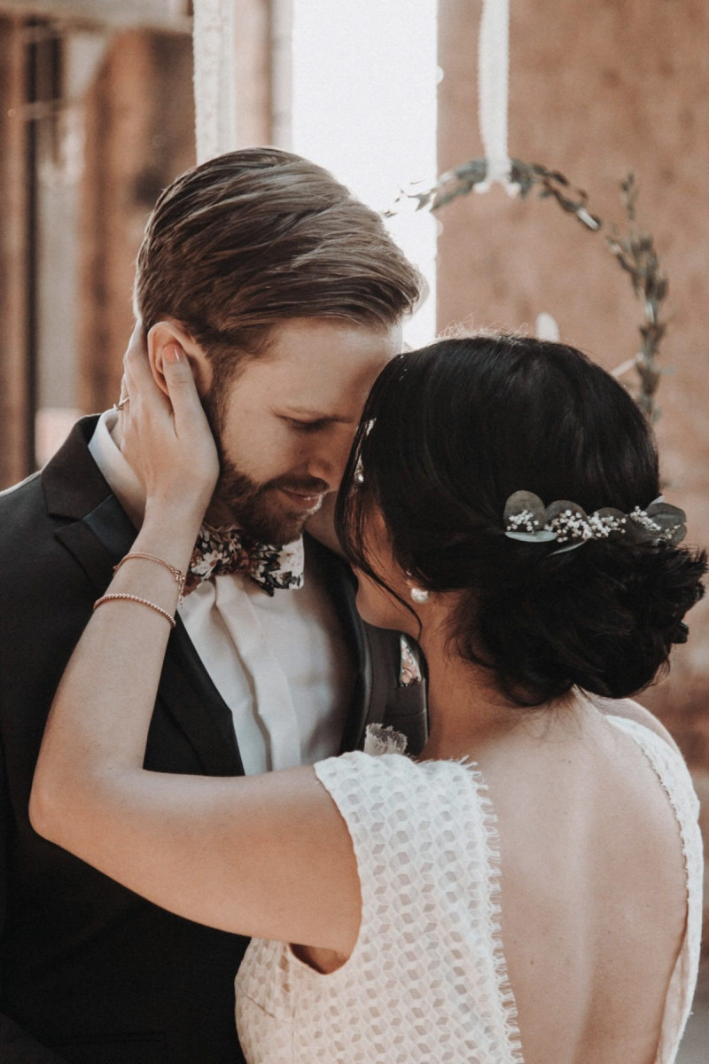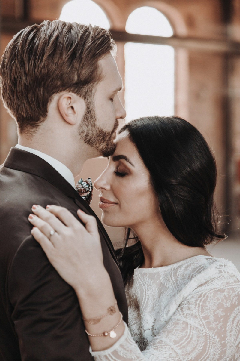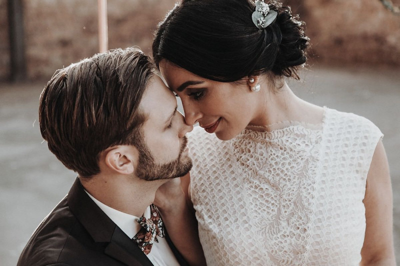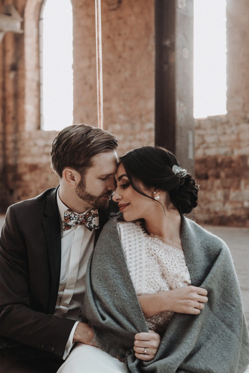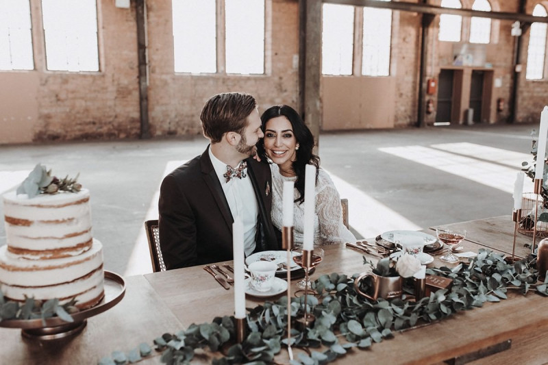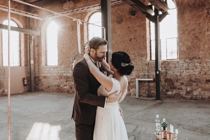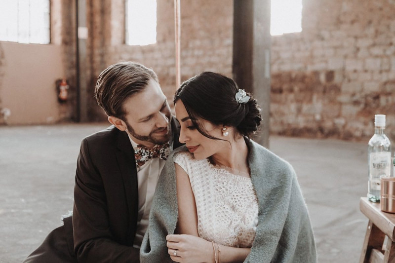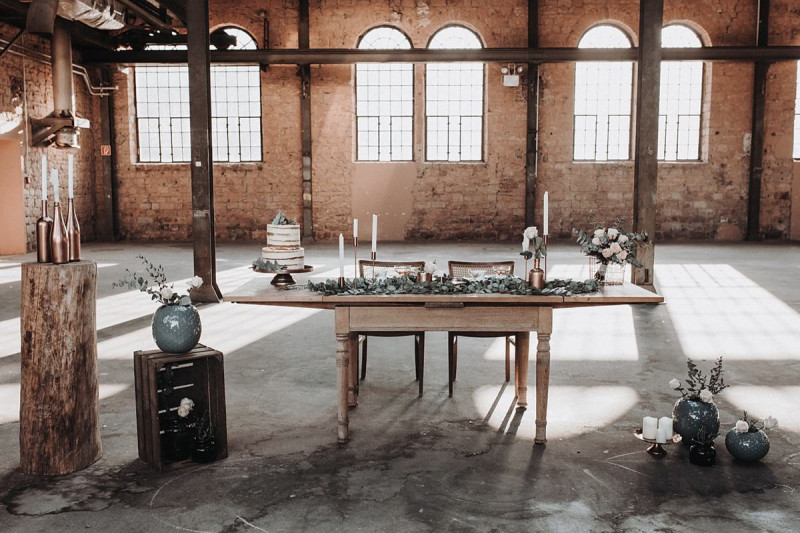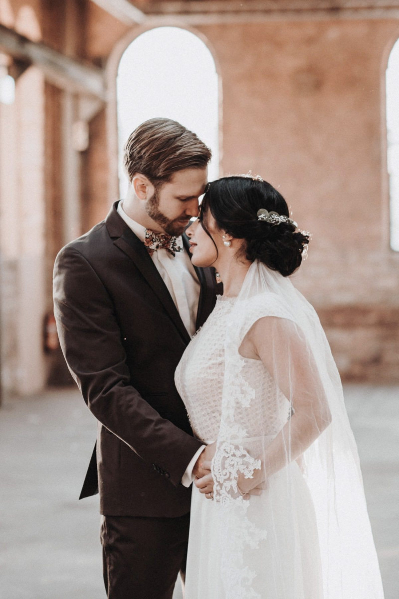 Dies ist die zweite Hochzeitsinspiration einer Industrial Wedding, das auf dem Blog einzieht. Ich finde den Charm des Unfertigen so toll! Ecken & Kanten, Materialmix – kombiniert mit ganz viel Grün, ein wenig Kupfer und zarten Blushtönen. Die feinen Details der Dekoration, die zarte Spitze des Brautkleides, der betörende Naked-Cake und das verliebte Brautpaar. Ein wunderschönes Gesamtkonzept, dessen kühle Materialien der Location und der Grün- & Minttöne durch die Akzente in zartem Blush und die Romantik des Brautpaares aufgebrochen wird. Und schön aufpassen, die Braut trägt gleich zwei bezaubernde Brautkleider aus dem Brautmoden Atelier von Elena Victoria, kreiert von Therese & Luise.Fotografiert hat diese wunderschöne Hochzeitsinspiration von KundK Photography. Zum Strahlen brachte die hübsche Braut neben den Traumroben und dem Schmuck von Lavendu das wundervolle Makeup von Elena Thul. Ihren hübschen Bräutigam kleidete ein Herrenmode Kraemer. Das perfekte Detail: Die Fliege von Mytieshop. Nun kommen wir zur grandiosen Dekoration. Die hübsche Papeterie ist von Stennie, die perfekt zu den hölzernen Details von Liebding Manufaktur passt. Und für den Tortentraum sorgte Zuckerduft. Ich freu mich sehr, euch diese tolle Hochzeitsinspiration zeigen zu dürfen. Es lockert nicht nur die starren Vorstellungen von Hochzeiten auf. In diesen Konzepten sind auch kleine Fehler erlaubt. Denn den eigenen Stil hineinzubringen, auch mal etwas auszulassen, macht es so individuell. Das entspannt auch jede wundervolle Bridezilla. Ganz viel Freude euch!!