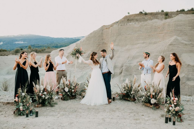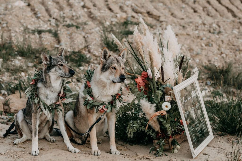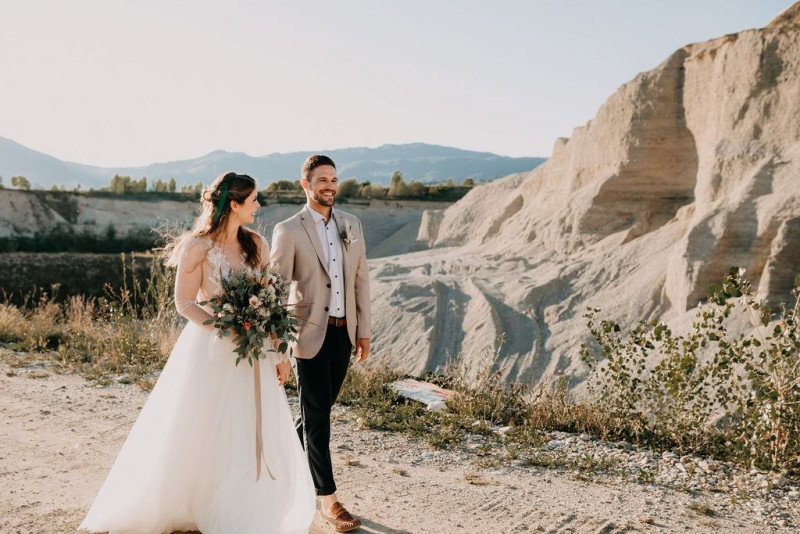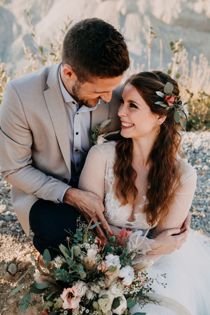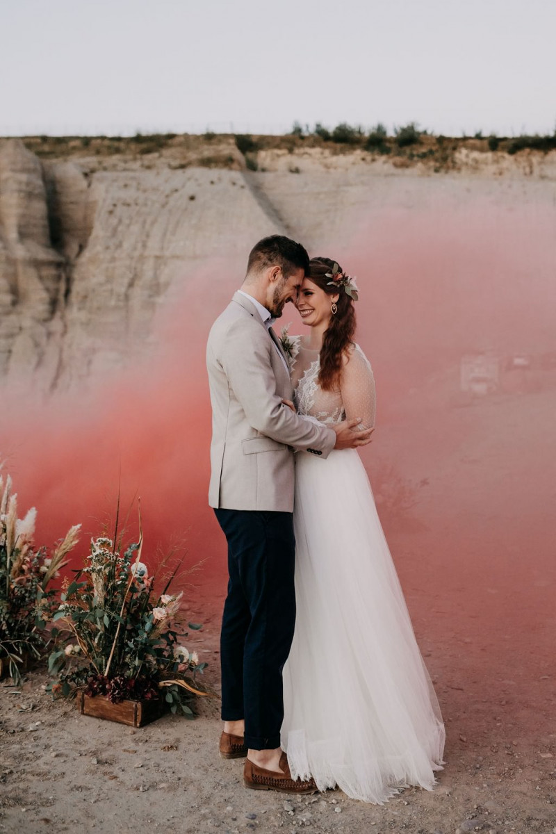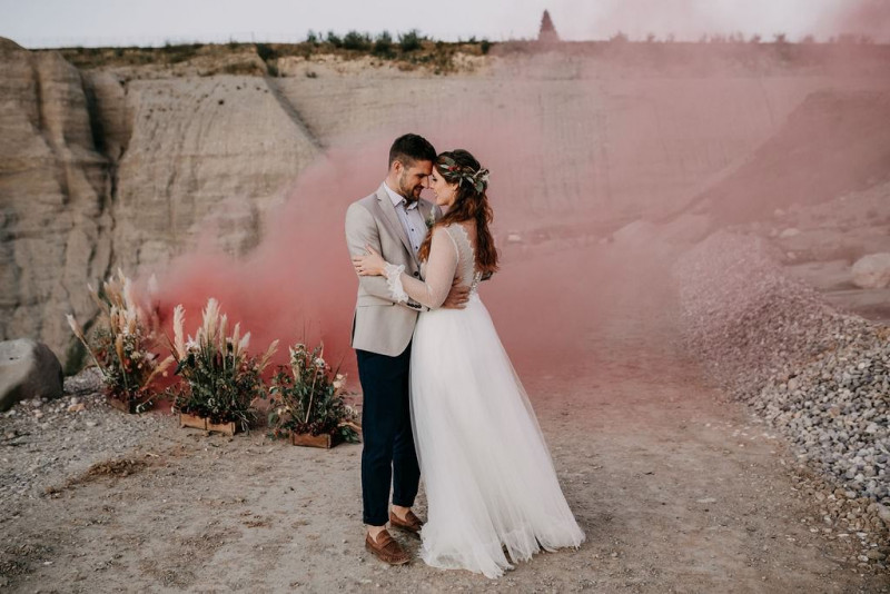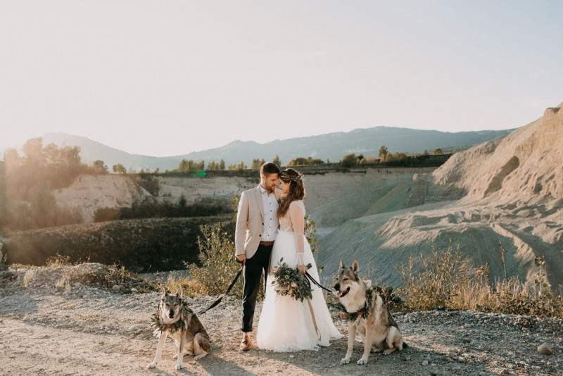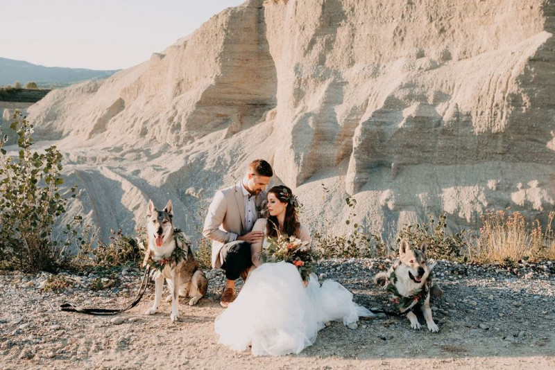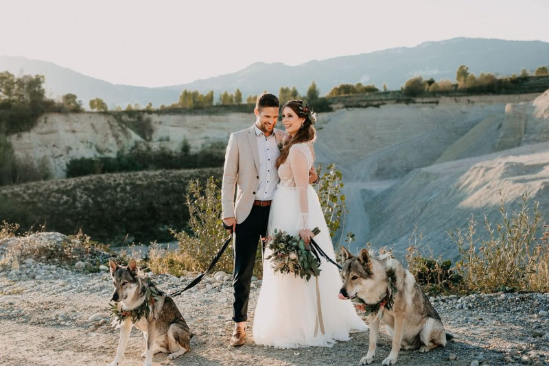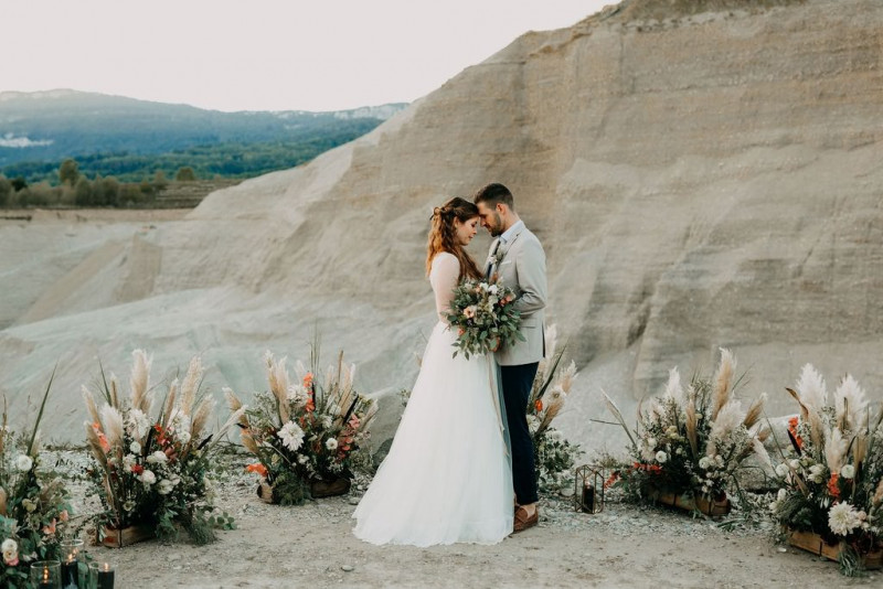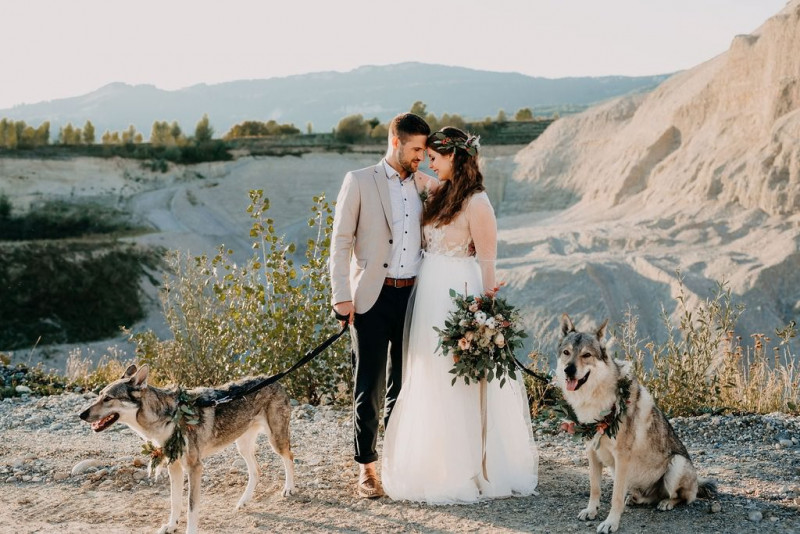 Bei dieser natürlichen Inspiration einer bohemian Elopement Wedding mitten in einem Steinbruch, erwarten euch so viele bezaubernde und romantische Details! Dazu wird es wild durch schwarze Akzente und roten Rauch! Hochzeitsfotografin Melanie Munoz Photography, die diese Inspiration natürlich auch fotografiert hat und die Eventplanerinnen Tiziana & Tamara von GAEA.DESIGN haben sich bei der gemeinsamen Planung dieses Shootings nicht lumpen lassen und an wirklich alles gedacht, das wilde Bohoherzen höherschlagen lässt. Das tierische Highlight sind Idefix und Evita, zwei tschechoslowakische Wolfshunde, die Andrea Zähner mitbrachte.