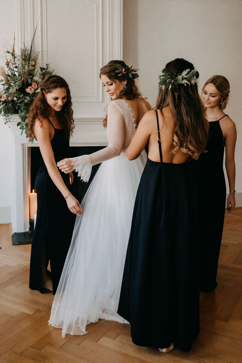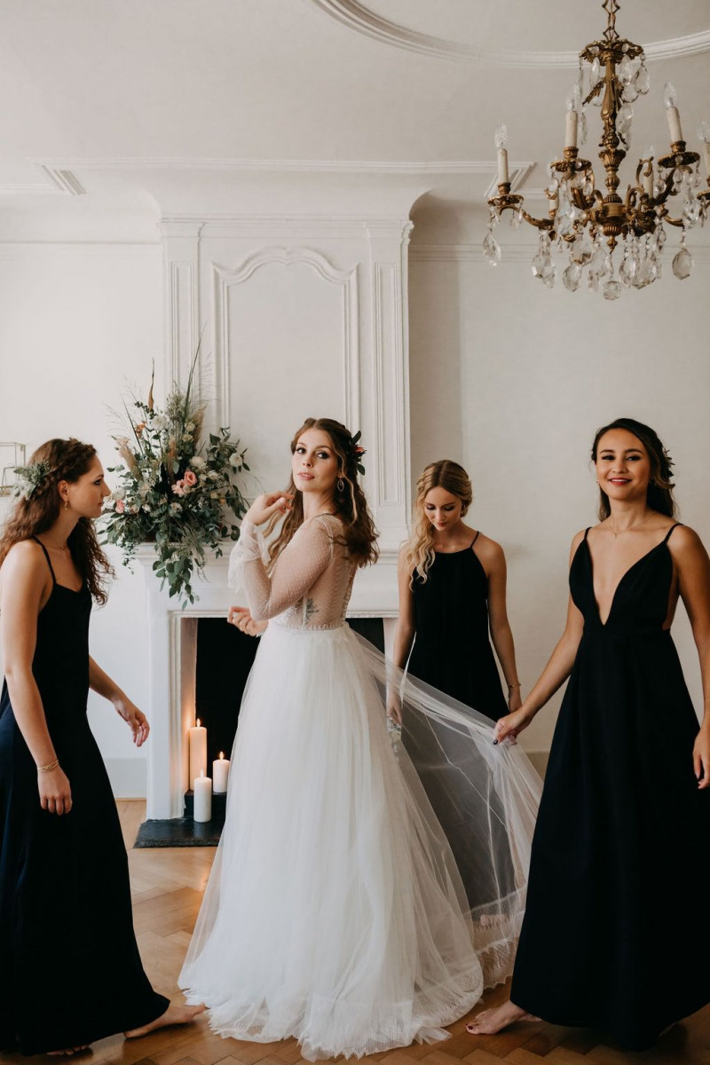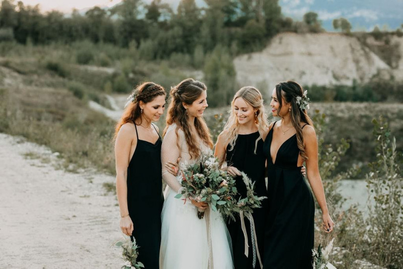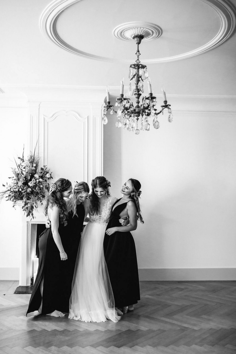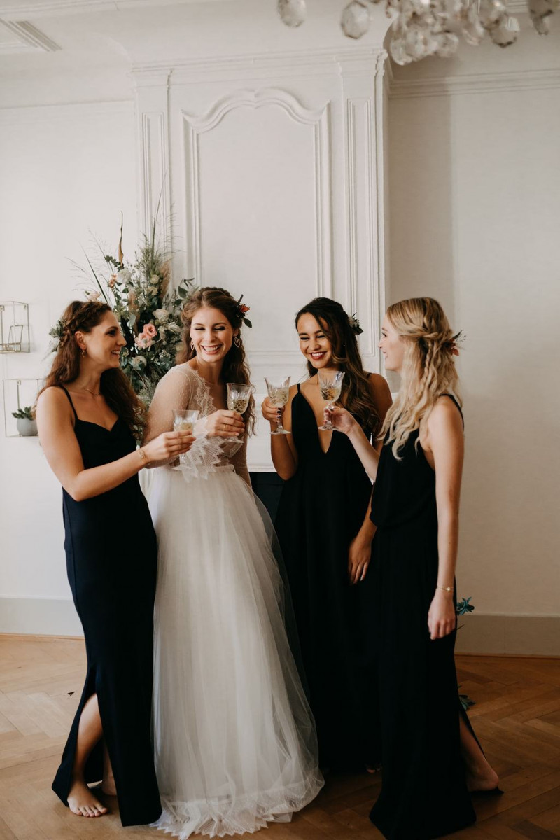 Beginnen wir am Morgen des Shootings. In einer lichtdurchfluteten Altbauwohnung, die früher mal ein Theater war, fand das Getting Ready des Brautpaares und der Bridesmaids statt. Sandra, die zauberhafte Braut, wurde im Kreise ihrer liebsten Mädels gestylt. In einem langärmligen Brautkleid von Lacely und einem zarten aber ausdrucksstarken Makeup von boholicious MAKE-UP strahlte sie bis über beide Ohren. Passend dazu, wie auch zu den hübschen Bridesmaids, die ein absolutes Highlight sind in ihren schwarzen Kleidern und mit ihren Blumenreifen, kreierte Cutwoman der Braut eine lockere Frisur im Boholook. Abgerundet durch die hübschen floralen Details von Blumenladen Terra Vecchia und den Schmuck von The Sparkle waren sie bereit für den sonnigen Tag in der Schweiz.