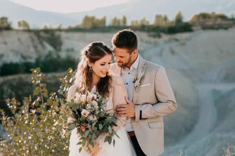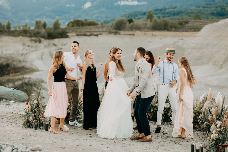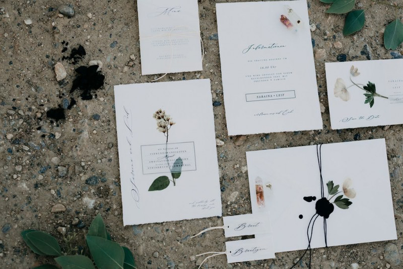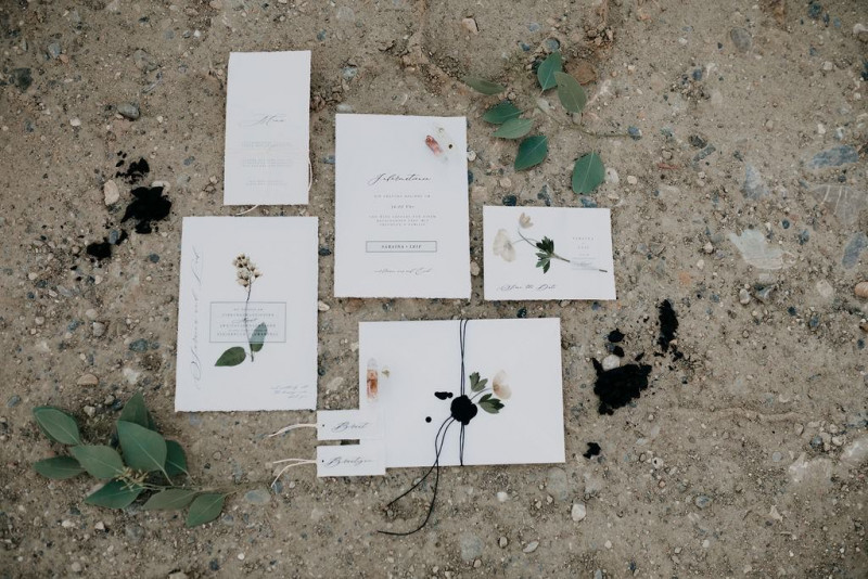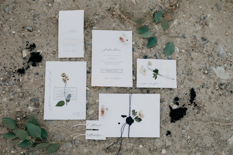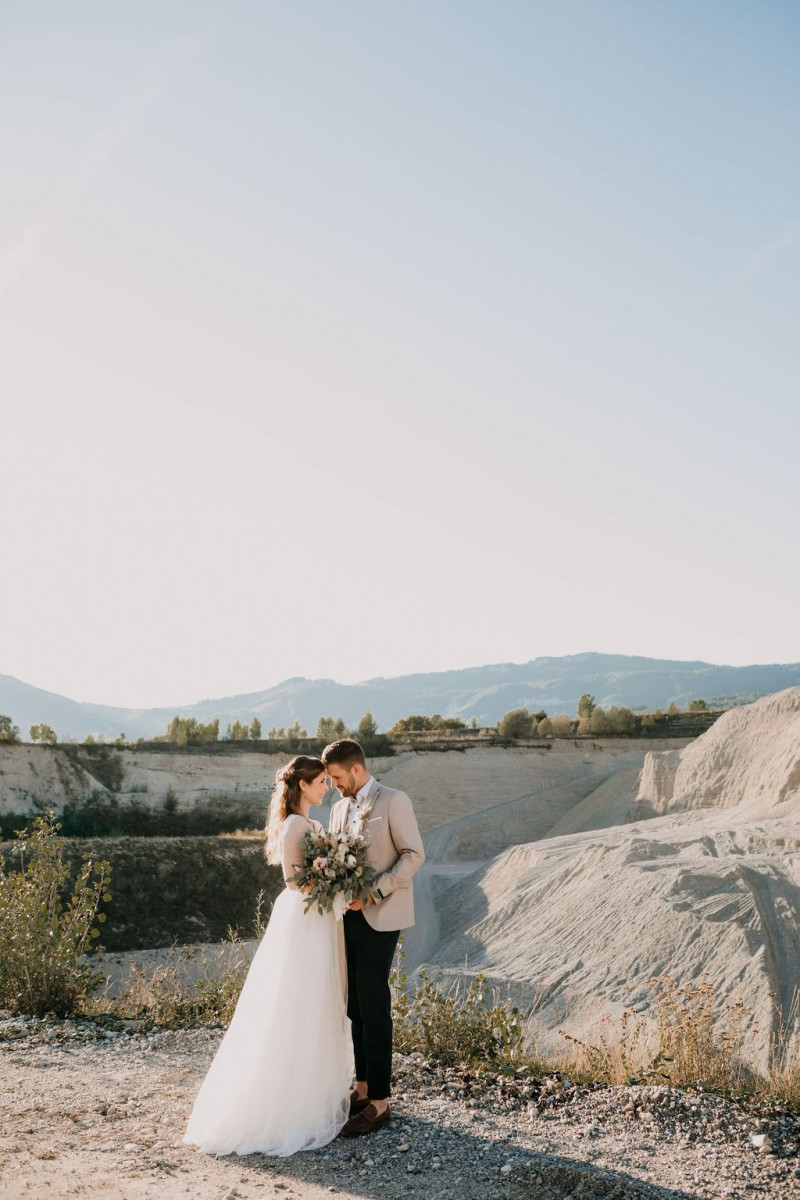 Natürlich durfte auch Bräutigam Michael sein Getting Ready genießen. Sein Outfit wurde von hellen Tönen dominiert, dessen Lässigkeit durch die braunen Mokassins noch perfektioniert wurde. Gemeinsam ging es im Anschluss in den Steinbruch in der Nähe von Solothurn in der Schweiz. Dort wartete eine bezaubernde Szenerie aus Traulocation, Sitzplätzchen und Tortentisch. Die kristallenen Hochzeitstorten dieser Inspiration kreierte délicatesse CAKE. Auch die Floristik und die Hochzeitspapeterie gehen hier absolut Hand in Hand. festum artis entwarf die Papeterie mit echten Blumen und passenden Siegeln in schwarz. Und auch der Sitzplan ist zum Verlieben. Perfekt in Szene gesetzt wurden diese Details durch die wilde Floristik von Blumenladen Terra Vecchia. Nach der süßen Zeremonie, bei der auch ein befreundetes Paar anwesend war, und der Feier, samt Tortenanschnitt, tanzte das Brautpaar in absoluter Zweisamkeit an dieser unglaublichen Kulisse durch roten Rauch.