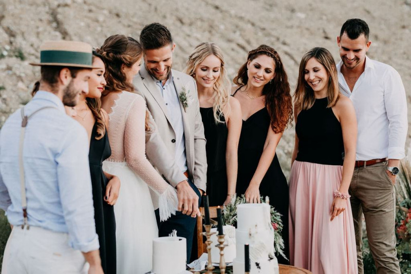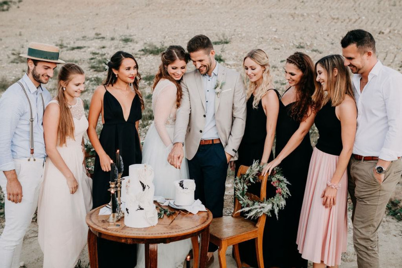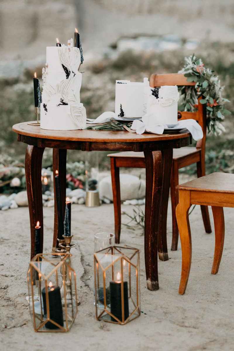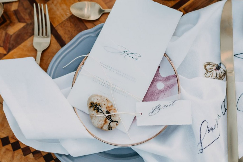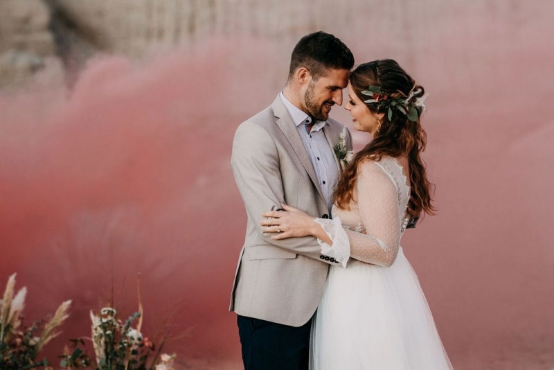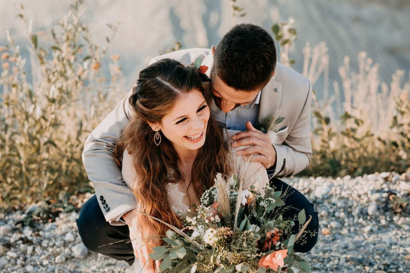 Natürlich durfte auch Bräutigam Michael sein Getting Ready genießen. Sein Outfit wurde von hellen Tönen dominiert, dessen Lässigkeit durch die braunen Mokassins noch perfektioniert wurde. Gemeinsam ging es im Anschluss in den Steinbruch in der Nähe von Solothurn in der Schweiz. Dort wartete eine bezaubernde Szenerie aus Traulocation, Sitzplätzchen und Tortentisch. Die kristallenen Hochzeitstorten dieser Inspiration kreierte délicatesse CAKE. Auch die Floristik und die Hochzeitspapeterie gehen hier absolut Hand in Hand. festum artis entwarf die Papeterie mit echten Blumen und passenden Siegeln in schwarz. Und auch der Sitzplan ist zum Verlieben. Perfekt in Szene gesetzt wurden diese Details durch die wilde Floristik von Blumenladen Terra Vecchia. Nach der süßen Zeremonie, bei der auch ein befreundetes Paar anwesend war, und der Feier, samt Tortenanschnitt, tanzte das Brautpaar in absoluter Zweisamkeit an dieser unglaublichen Kulisse durch roten Rauch.