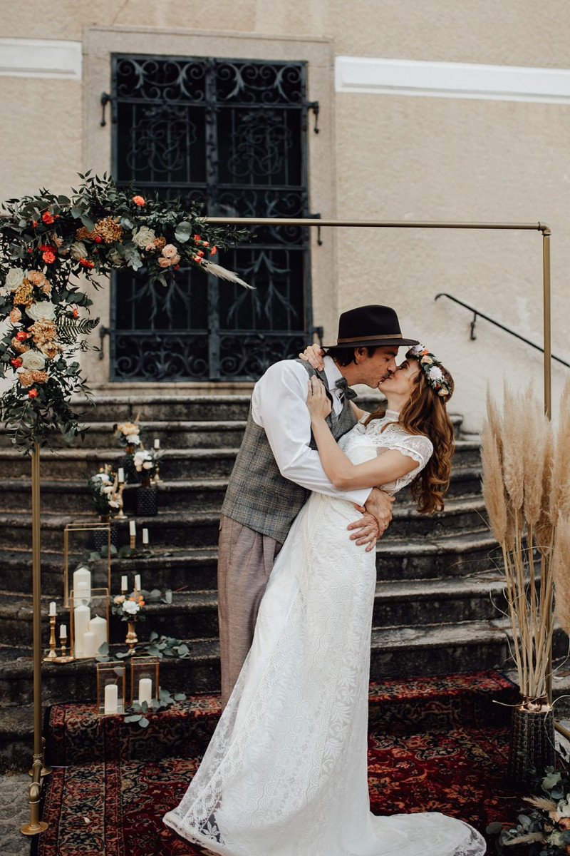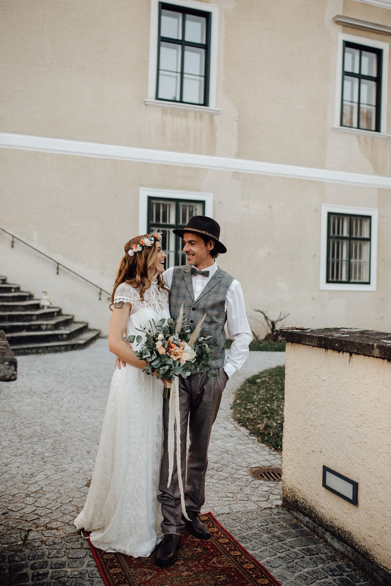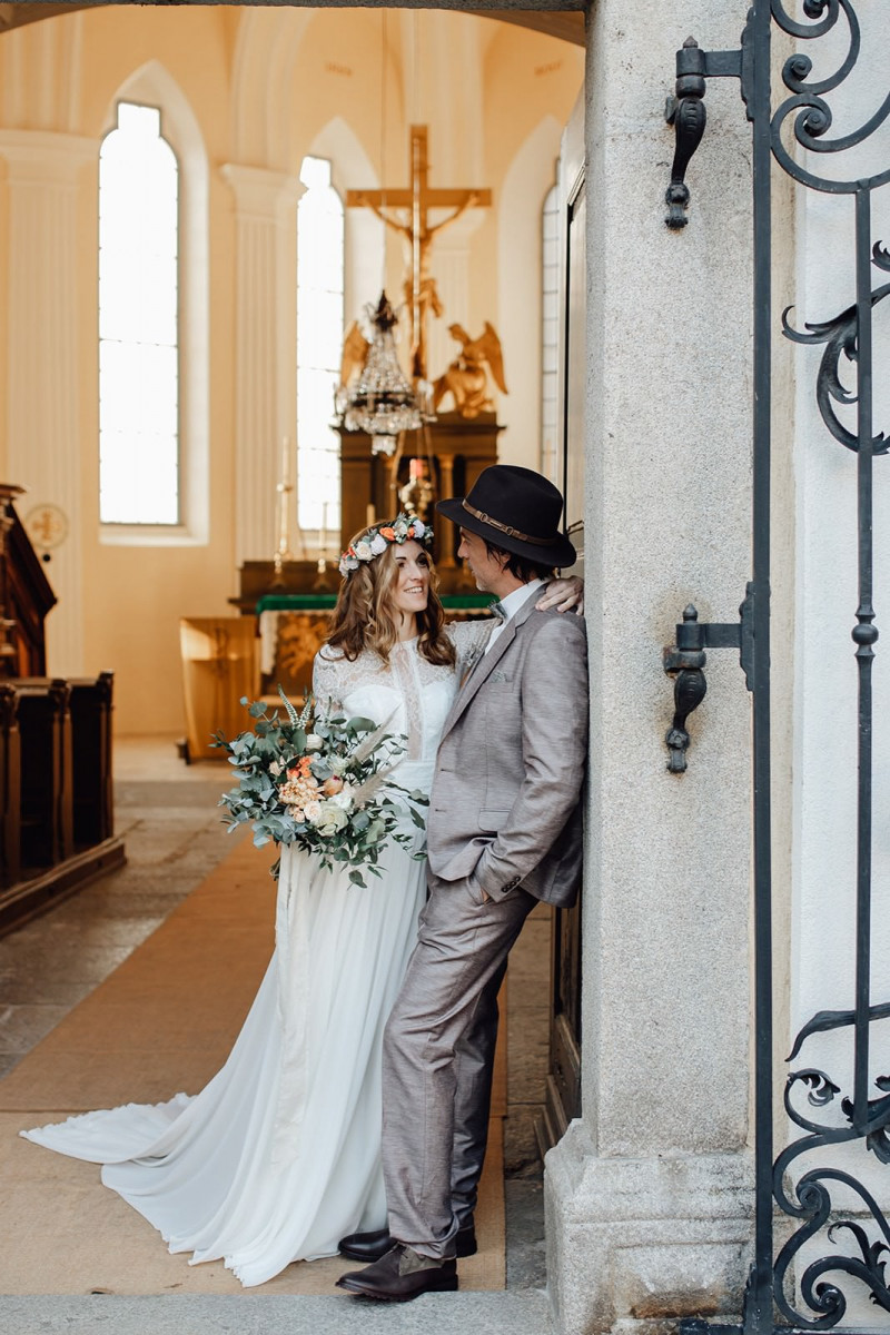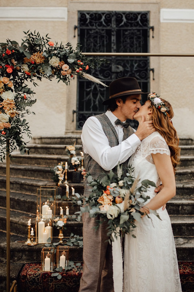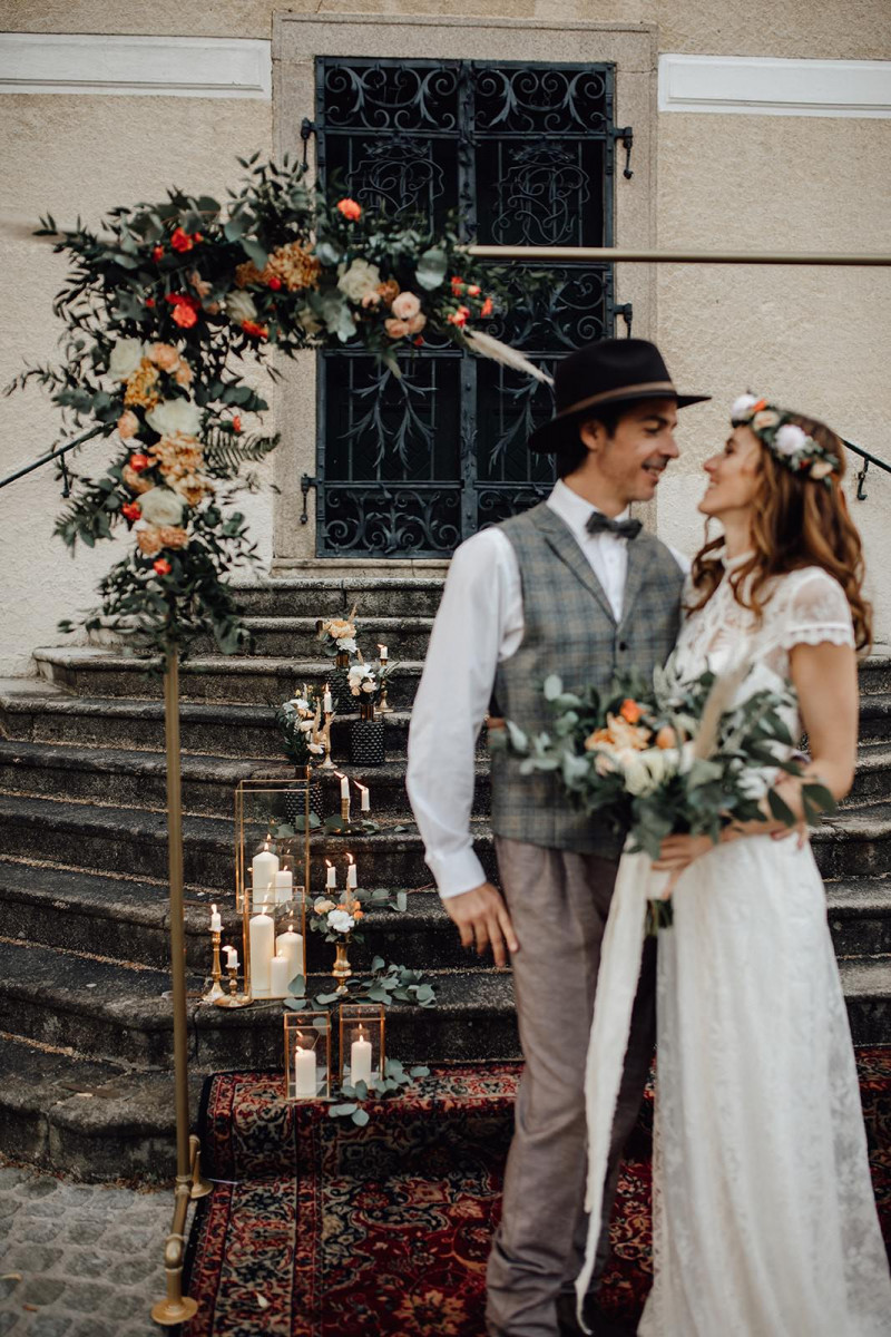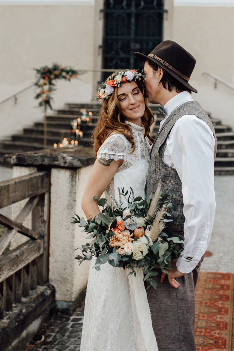 Heute geht es für uns in das zauberhafte Schloss Persenbeug in Österreich. Direkt an der Donau gelegen, erwartet uns in diesem romantischen Schloss eine wunderschöne Inspiration einer Bohohochzeit. Die Mischung aus pompösen Details und leichten Bohovibes ist einfach so schön! Fotografiert wurde diese Boho Glam Hochzeitsinspiration von Barbara Pölzgutter Photography, die videografische Unterstützung von Smove Media bekam. Auch das Video findet ihr in diesem Artikel! Geplant wurde der Tag von der lieben Julia von mach’s hübsch Deko-Denk , die neben dem Konzept auch noch die tolle Dekoration und Floristik kreiert hat. Dunkles schweres Holz im opulenten Bankettsaal trifft auf wilde Floristik und unzählige Kerzen. Neben sattem Grün und zartem Beige ist auch die Trendfarbe Living Coral, die Pantone Farbe 2019, in den floristischen Details zu entdecken. Die beiden hübschen Brautkleider, die euch hier erwarten, sind von First Love & Steinecker. Sie sind zart fließend aber genauso elegant wie leicht. Passend dazu wurde auch das Hair & Makeup von Stefanie Hausbergerkreiert und durch den Schmuck von Nathalie Bleyer ergänzt. Von Steinecker ist auch der schicke Anzug des Bräutigams. Sein Hut, der seinem edlen Look einen legeren Touch gibt, ist von MüllerHutMode. Gesanglich untermalt wurde dieser romantische Tag von Christina Kerscher. Und natürlich gibt es auch wieder einiges an Hochzeitspapeterie zu entdecken! Sie passt ganz wundervoll zur floralen Gestaltung dieser Inspiration. Hergestellt wurde sie von Herzpost. Fehlt ja nur noch eines… der süße Part des Tages! Die Torte und die Candy Bar kreierte sweet art by jules. Der wundervolle Semi Naked Cake nimmt den glamourösen Stil auf und verzaubert mit edlem Blattgold und Rosen in zartem Rosé. Es gibt mal wieder so vieles zu entdecken! ich bin verliebt und finde diesen Stilmix so grandios! Viel Freude euch beim Staunen und Verlieben!