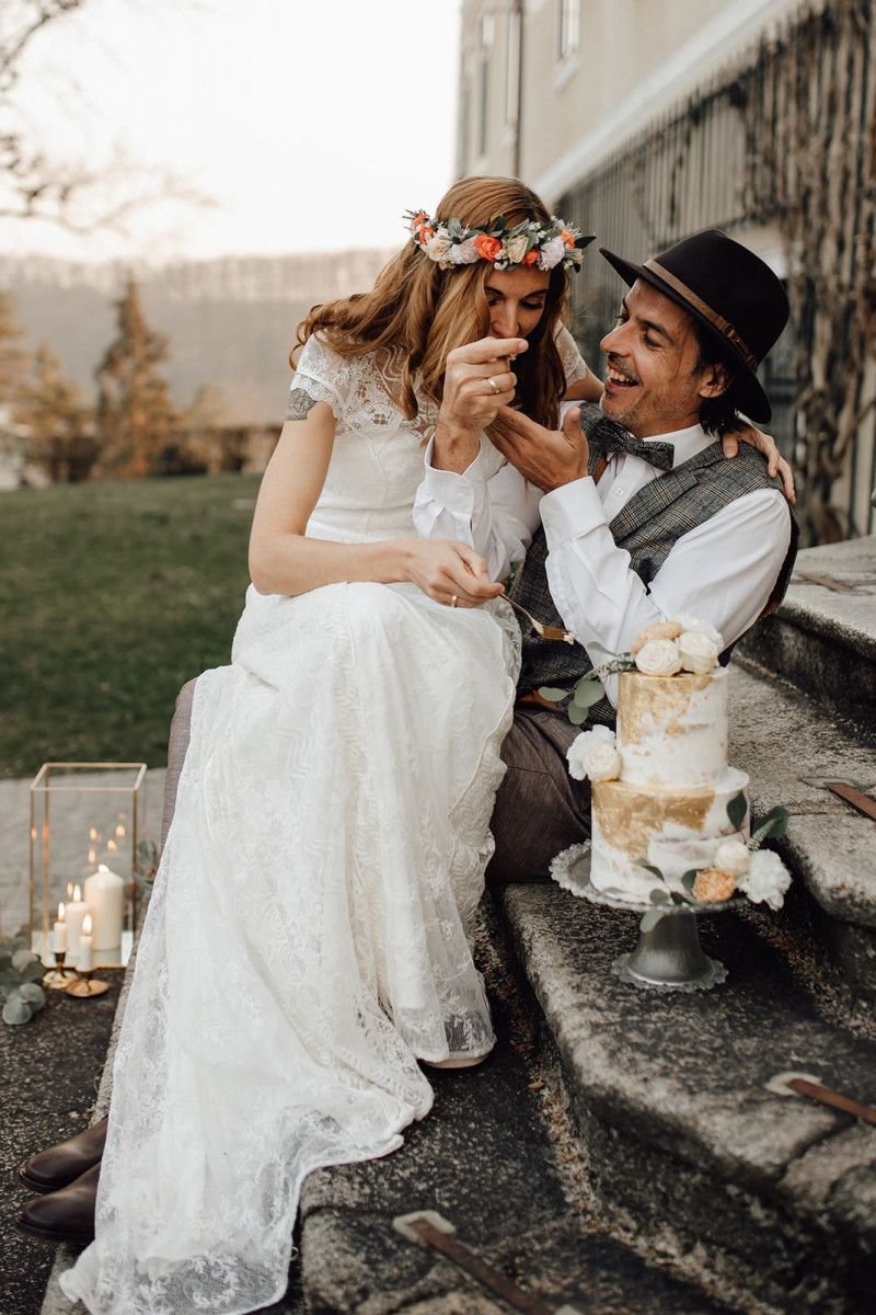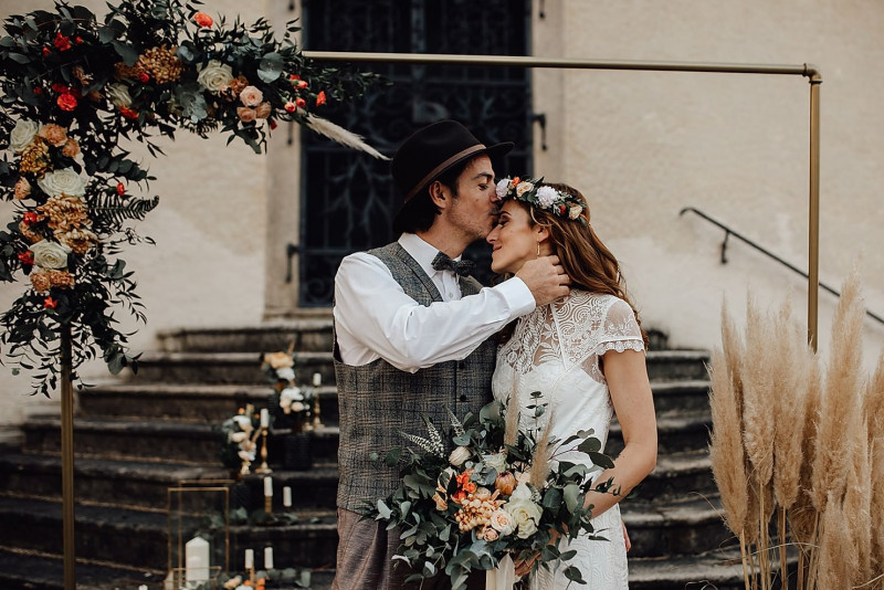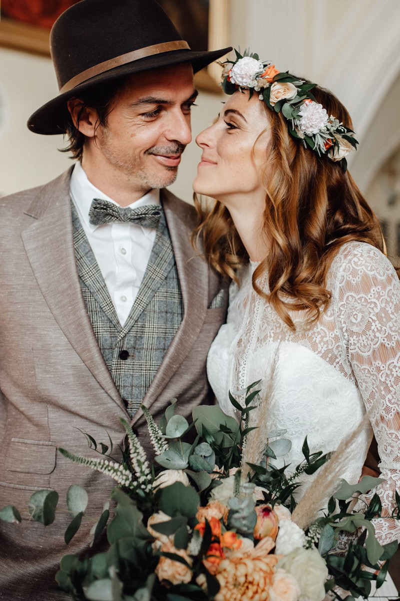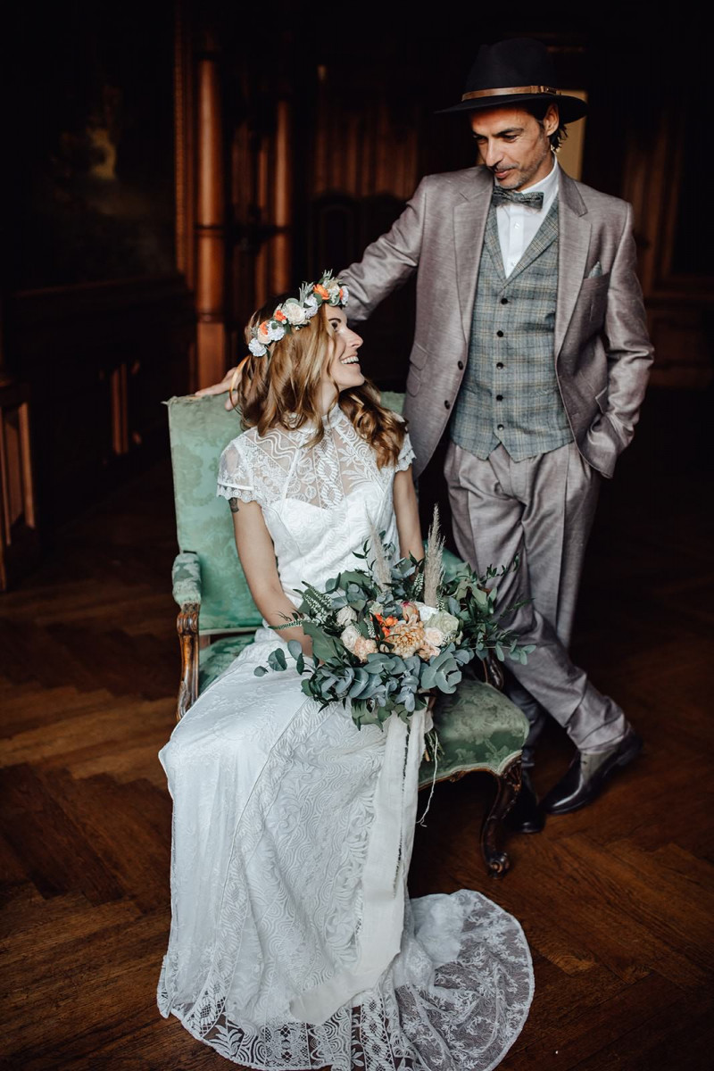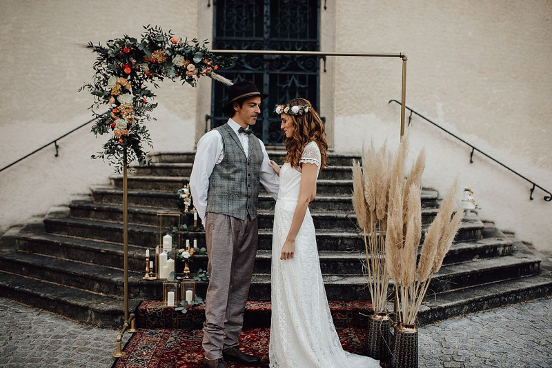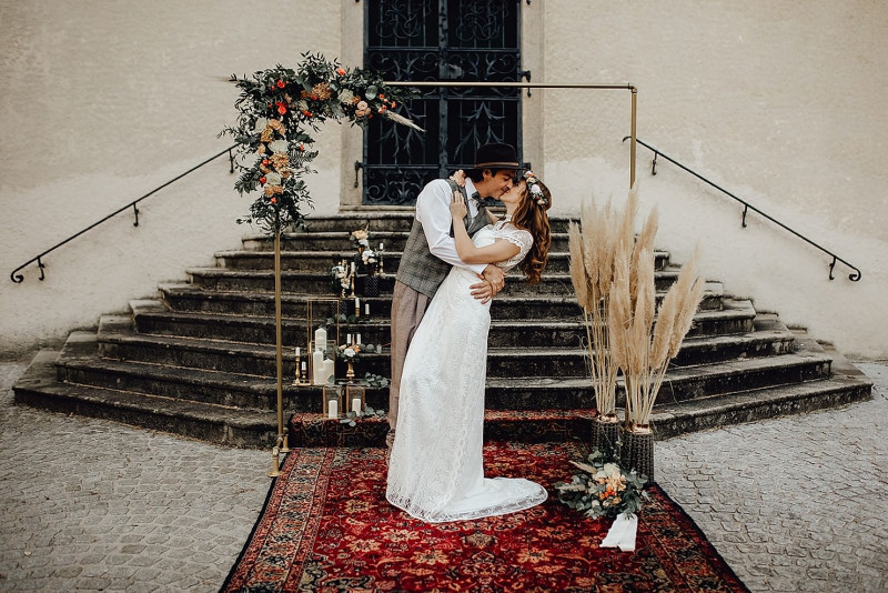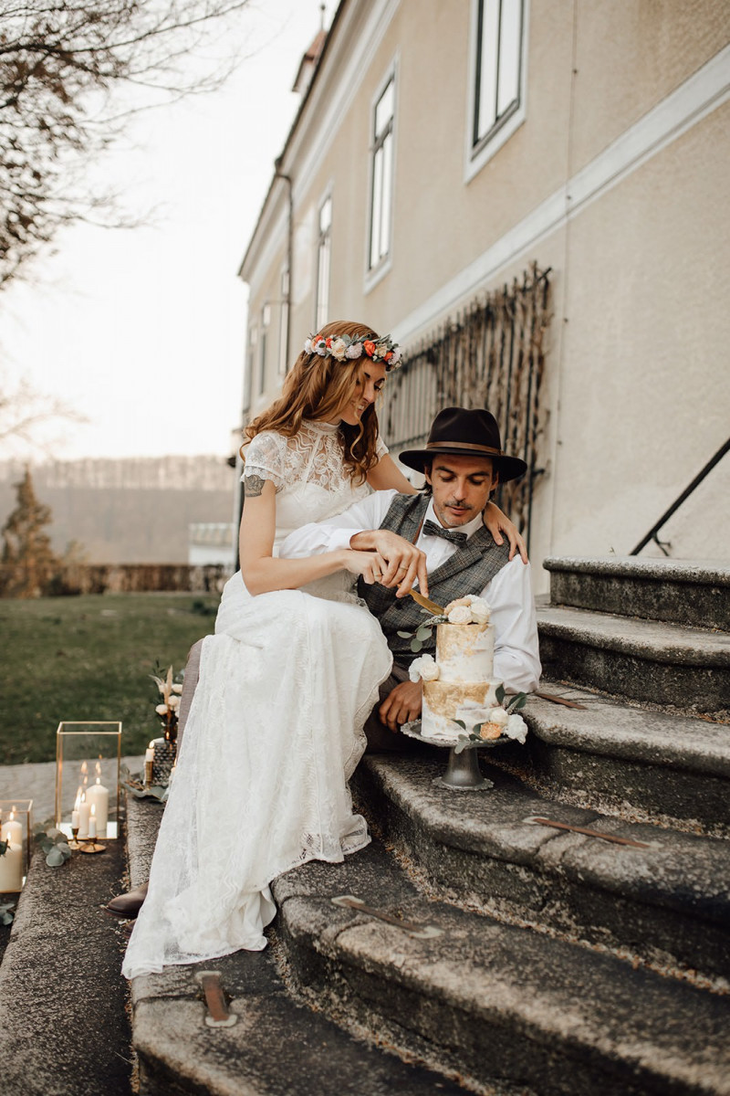 Heute geht es für uns in das zauberhafte Schloss Persenbeug in Österreich. Direkt an der Donau gelegen, erwartet uns in diesem romantischen Schloss eine wunderschöne Inspiration einer Bohohochzeit. Die Mischung aus pompösen Details und leichten Bohovibes ist einfach so schön! Fotografiert wurde diese Boho Glam Hochzeitsinspiration von Barbara Pölzgutter Photography, die videografische Unterstützung von Smove Media bekam. Auch das Video findet ihr in diesem Artikel! Geplant wurde der Tag von der lieben Julia von mach’s hübsch Deko-Denk , die neben dem Konzept auch noch die tolle Dekoration und Floristik kreiert hat. Dunkles schweres Holz im opulenten Bankettsaal trifft auf wilde Floristik und unzählige Kerzen. Neben sattem Grün und zartem Beige ist auch die Trendfarbe Living Coral, die Pantone Farbe 2019, in den floristischen Details zu entdecken. Die beiden hübschen Brautkleider, die euch hier erwarten, sind von First Love & Steinecker. Sie sind zart fließend aber genauso elegant wie leicht. Passend dazu wurde auch das Hair & Makeup von Stefanie Hausbergerkreiert und durch den Schmuck von Nathalie Bleyer ergänzt. Von Steinecker ist auch der schicke Anzug des Bräutigams. Sein Hut, der seinem edlen Look einen legeren Touch gibt, ist von MüllerHutMode. Gesanglich untermalt wurde dieser romantische Tag von Christina Kerscher. Und natürlich gibt es auch wieder einiges an Hochzeitspapeterie zu entdecken! Sie passt ganz wundervoll zur floralen Gestaltung dieser Inspiration. Hergestellt wurde sie von Herzpost. Fehlt ja nur noch eines… der süße Part des Tages! Die Torte und die Candy Bar kreierte sweet art by jules. Der wundervolle Semi Naked Cake nimmt den glamourösen Stil auf und verzaubert mit edlem Blattgold und Rosen in zartem Rosé. Es gibt mal wieder so vieles zu entdecken! ich bin verliebt und finde diesen Stilmix so grandios! Viel Freude euch beim Staunen und Verlieben!