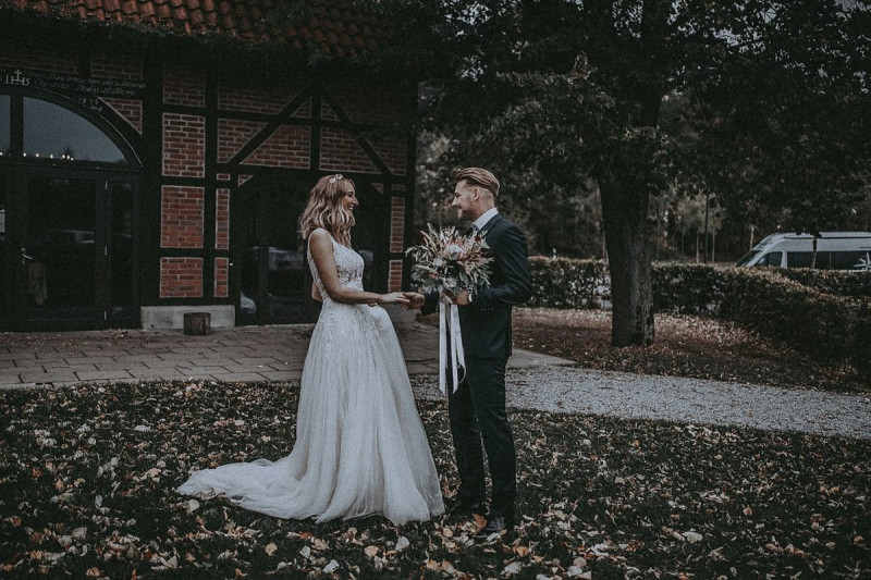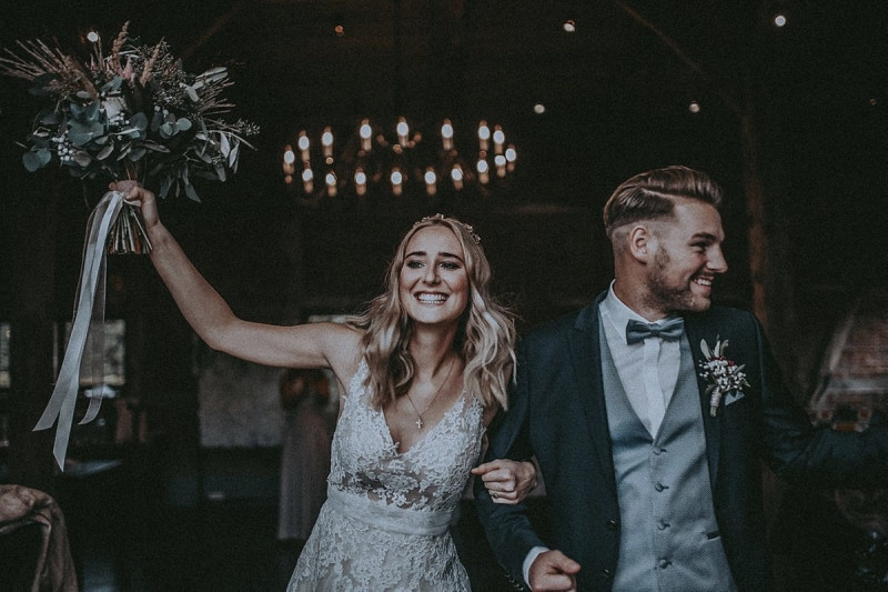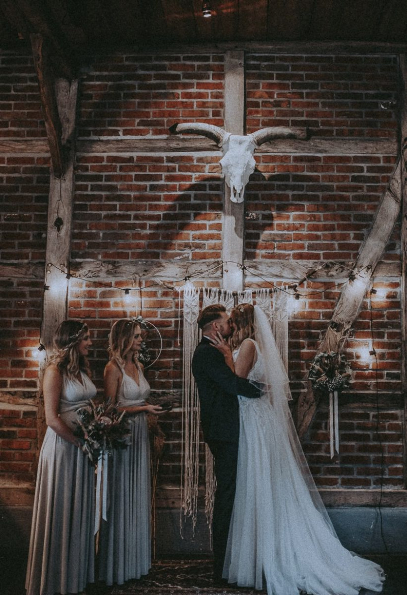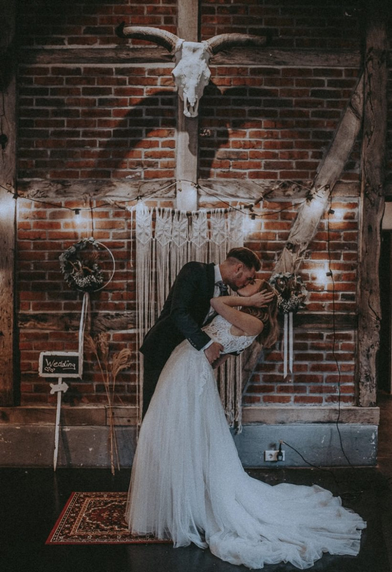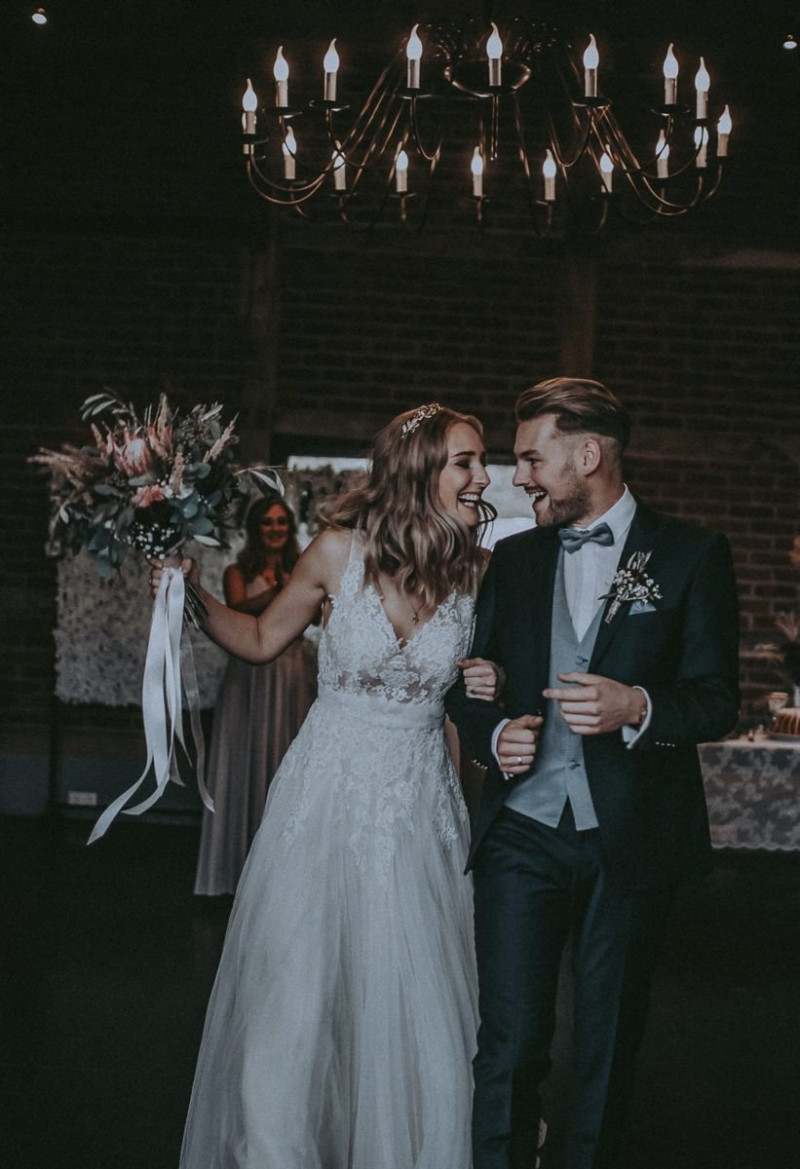 Eine romantische Hochzeitsinspiration einer zauberhaften Boho Glam Scheunenhochzeit, erwartet euch in diesem Artikel! Freut euch auf zarte Federn, Protea, Pampasgras & Eukalyptus im wilden Brautstrauß, Candle Light in der tollen Dekoration und einen Sweet Table, samt Nacked Cake, wie aus einem Bohotraum! Fotografiert hat diese Inspiration im “Stall” des Guts Lippesee in Paderborn, die Hochzeitsfotografin Larissa Hermanowski Photography. Unterstützt wurde sie videografisch von Janine Strüber Video- und Fotografie. Die wunderschöne Floristik und Dekoration des Stalls zauberte Hochzeitsservice Claudia Drößler und wurde durch die Ballons und den Fotobox Hintergrund von Balloom Paderborn perfekt ergänzt. Die dazu passende Hochzeitspapeterie kreierte Carla & Marie Papeterie. Ebenso zauberhaft feierte das süße Brautpaar, Marie & Lukas, durch diese Boho Inspiration. Maria, gestylt von Lilia Kinstler, trägt ein Traumkleid mit zarten Spitzendetails und einem langen Schleier. Ihr Brautkleid und auch die Kleider ihrer hübschen Brautjungfern sind von BeccaLoreen. Lucas trägt ein petrolfarbenes Sacco vom Modehaus Hövel. Und für die Süßen unter uns: Den tollen Sweet Table zauberte Zuckerkrönchen. Und jetzt, genießt es!